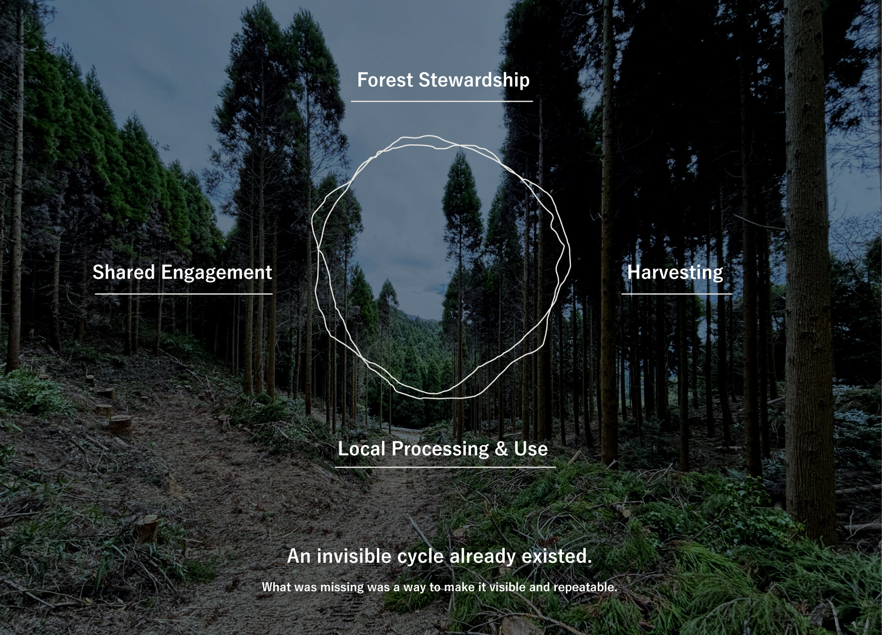 北九州市にすでに存在していた、森林管理、伐採、加工、利用、教育、そして人と人との関わりによって成り立つ木材循環を、ひとつのデザインシステムとして可視化する試みです。