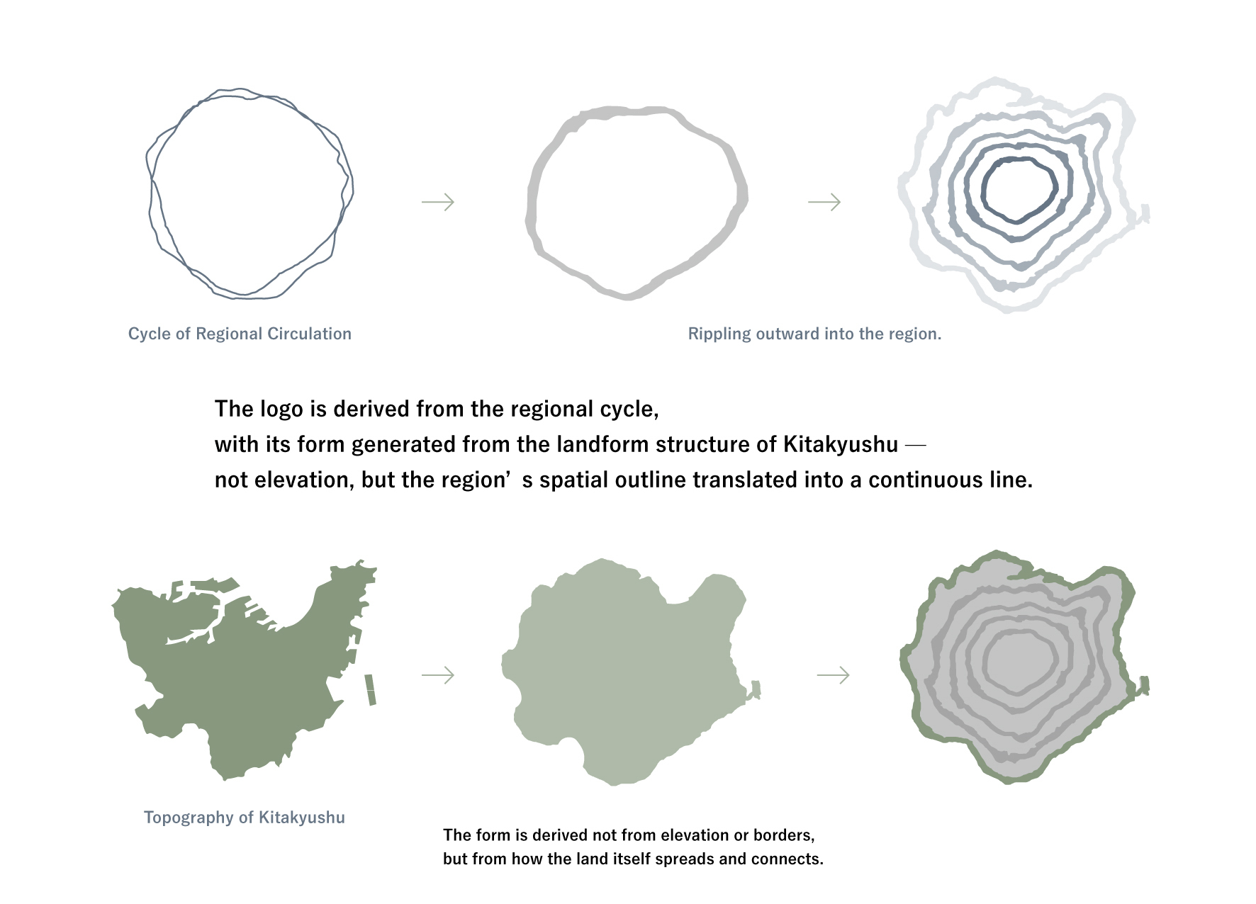本プロジェクトでは、地域の地形を起点に、循環そのものの構造を読み取り、そこからロゴマークを生成しました。形は恣意的に設計されたものではなく、この土地の広がりやつながりが反映された結果として導き出されています。