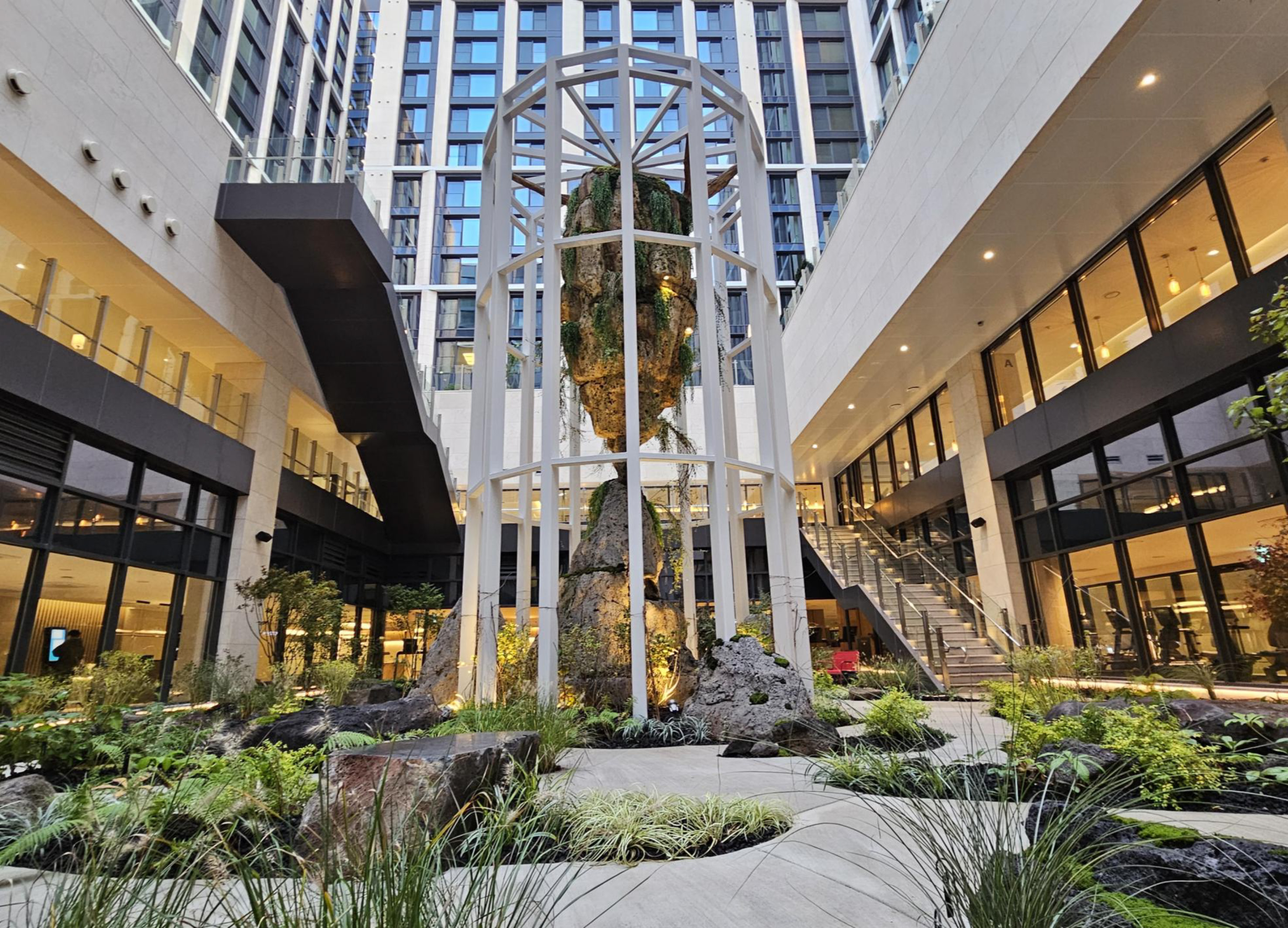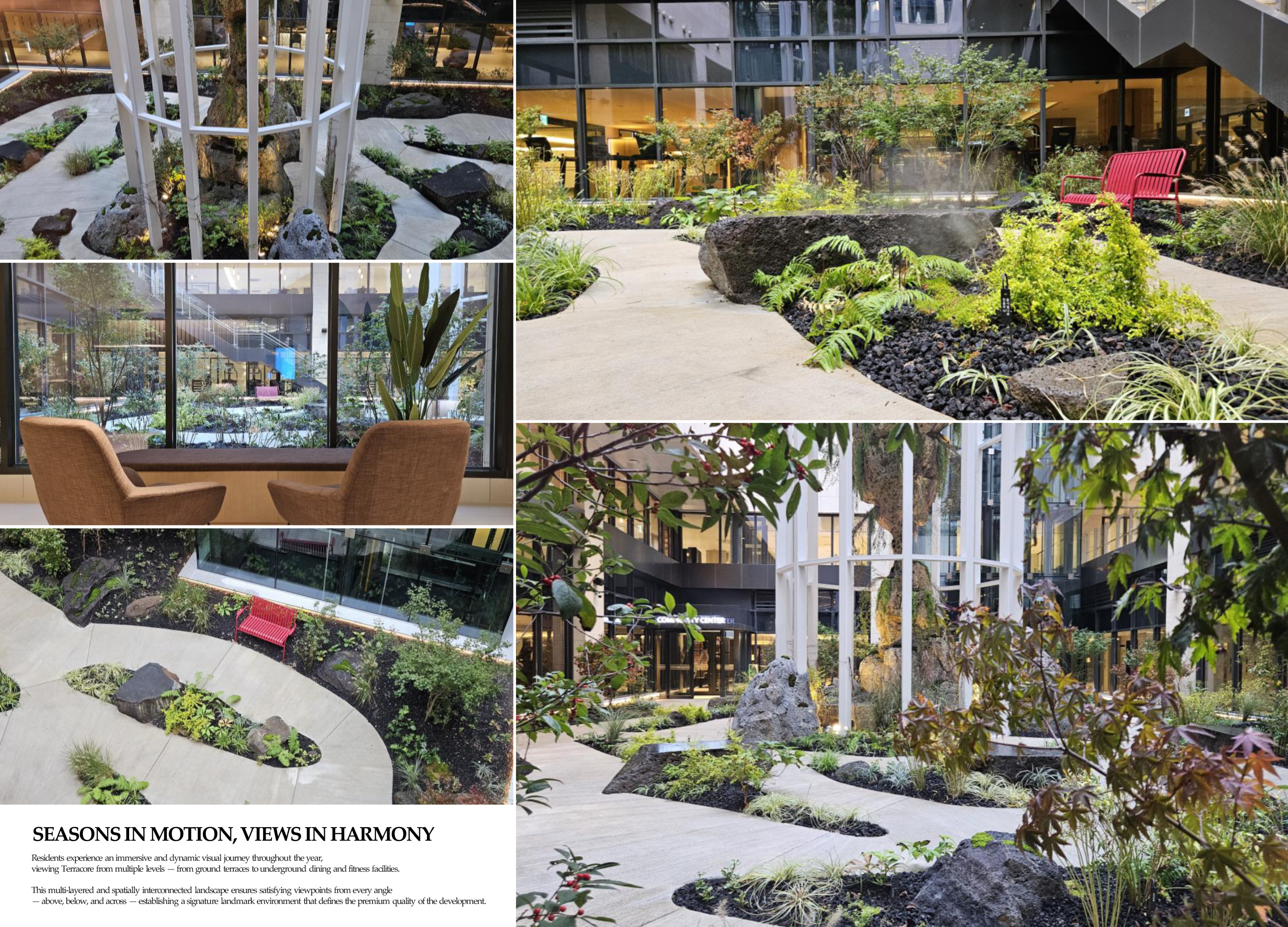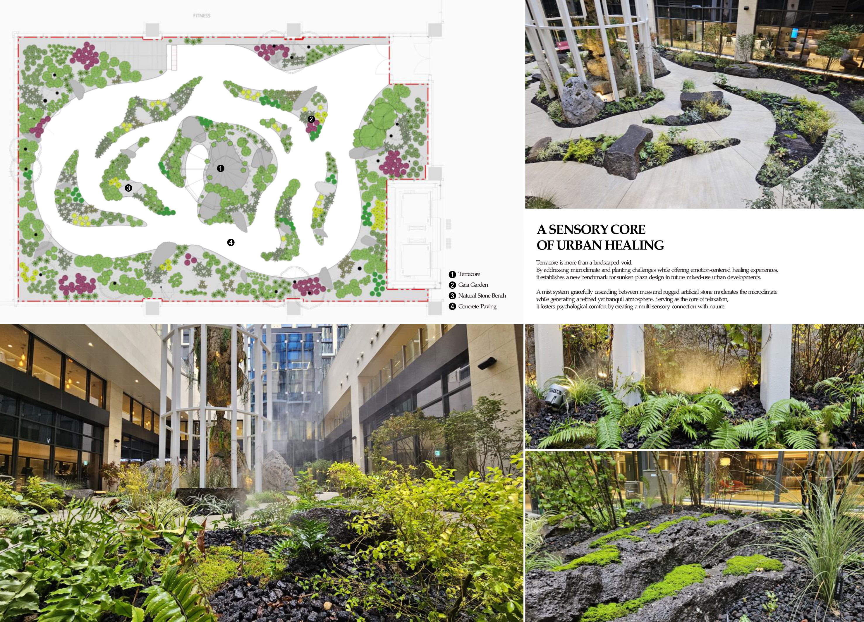 NATURE UNBOUND, the sunken garden within the senior residential complex, is a healing landscape that reflects the rhythm and sensibility of senior living. Surrounded by fifteen-story buildings, the space faced limited light and nature, along with an abandoned central structure known as the Healing Folly. Reimagined through the narrative “NATURE UNBOUND; breaking free from nature’s constraints,” rock-like forms pierce and overflow the structure, symbolizing primordial vitality. The Healing Folly now operates as a vertical ecosystem, offering immersive greenery, emotional restoration, and a serene microclimate where stone and nature coexist.
