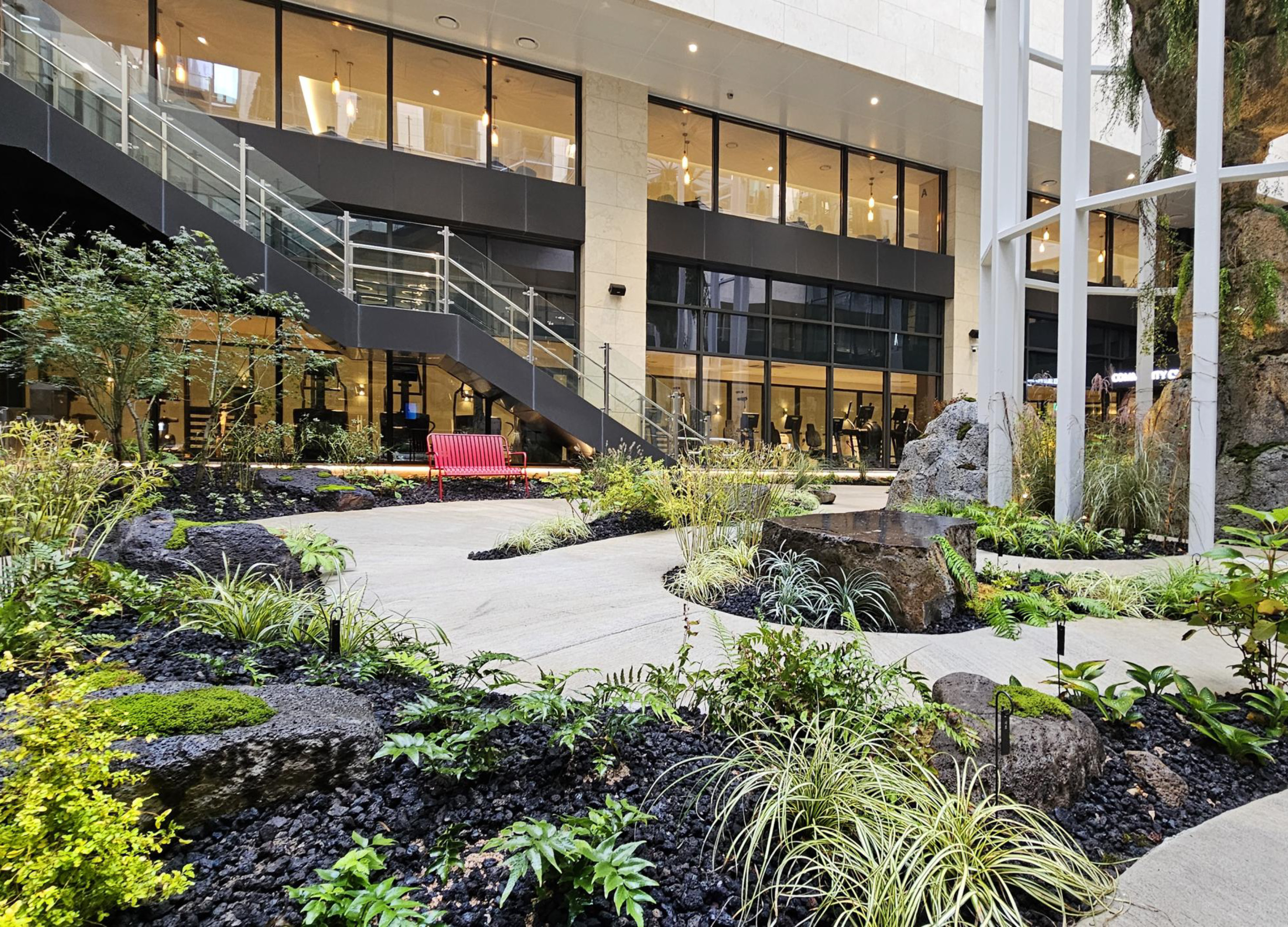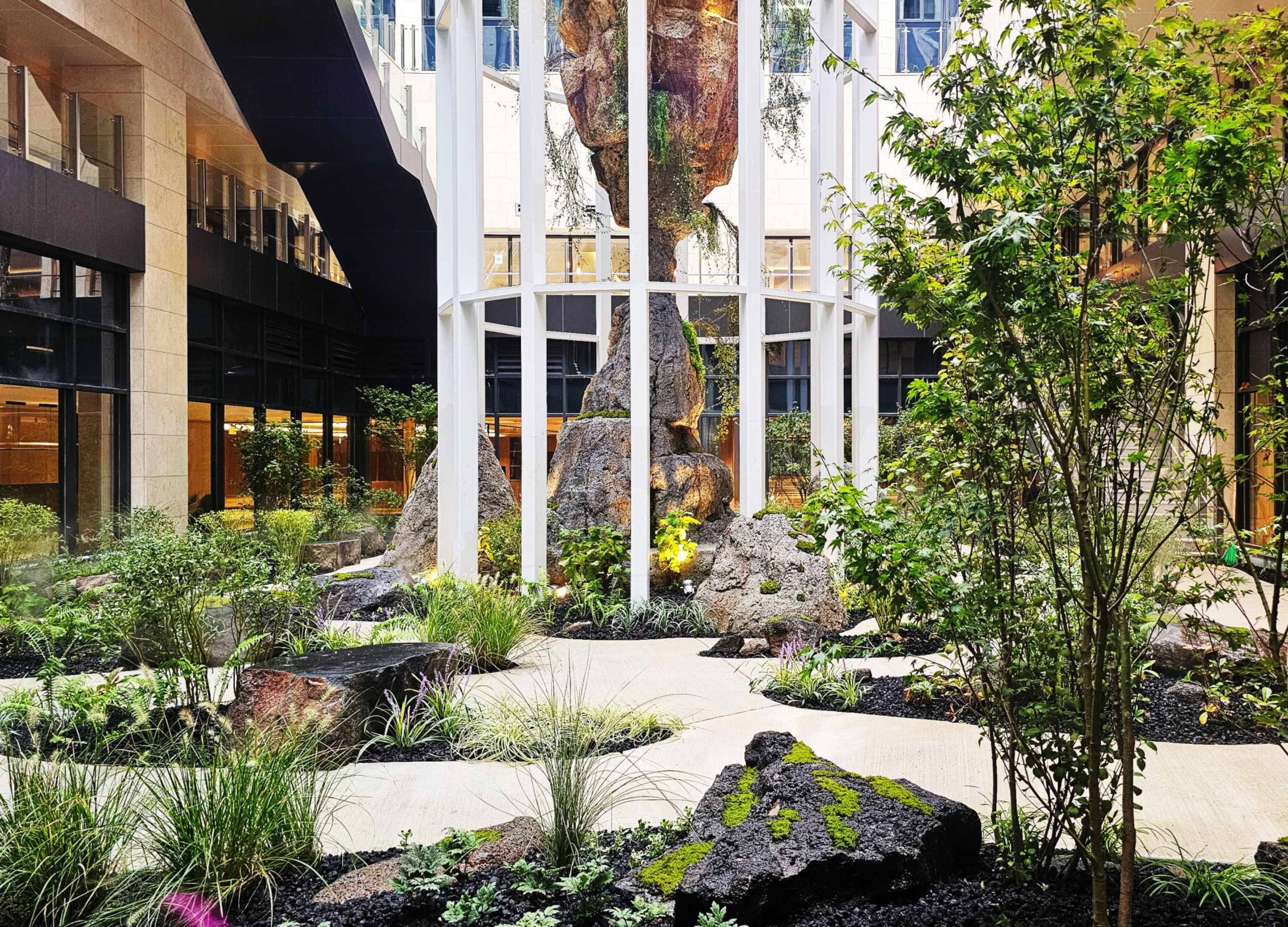 시니어 레지던스 내 선큰공간의 정원 NATURE UNBOUND는 시니어 타운의 삶의 리듬과 감성을 섬세하게 담아낸 치유의 공간이다. 15층 건물에 둘러싸여 빛과 자연이 제한된 선큰공간, 그리고 인공 온실 계획이 무산되며 남겨진 거대한 중앙 구조물 ‘힐링폴리’는 오랫동안 해결되지 않은 과제였다. 우리는 이 구조물에 ‘NATURE UNBOUND; 자연의 틀을 깨고 나오다’라는 서사를 부여했다. 인조암을 통해 암석이 구조를 뚫고 흘러나오듯, 억눌렸던 자연이 공간 전반으로 확장되는 태초의 생명력을 형상화했다. 힐링폴리는 이제 단순한 구조물이 아닌, 지하에서 지상까지 이어지는 수직 생태계로 작동하며 입주민에게 입체적인 녹음과 깊이 있는 경관을 선사한다. 실내 생활이 많은 시니어들에게 이는 도심에서 쉽게 접하기 어려운 자연과의 교감이며, 정서적 안정과 회복을 이끄는 고요한 배경이 된다. 더불어 마운딩을 통한 토심 확보와 저관리형 식재, 미스트 시스템을 통해 쾌적한 미기후를 조성하며, NATURE UNBOUND는 견고한 암석과 부드러운 자연이 공존하는 심리적 안식처로 완성된다.