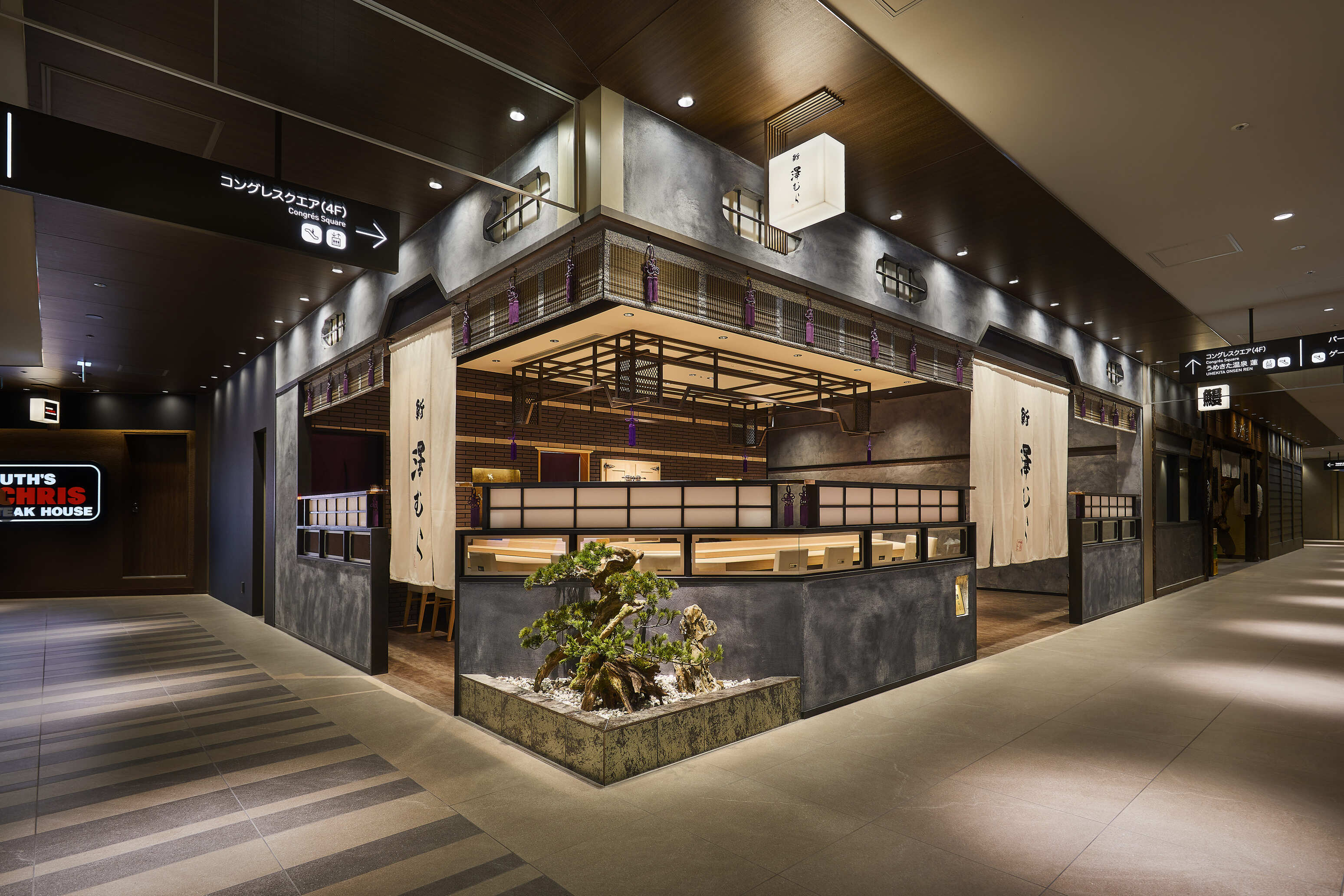 エントランスには、大きな暖簾、日本の建具のディティールを組み入れた腰壁、そしてグラングリーンの景観と調和するよう、アート盆栽などのグリーンを用いた「坪庭」を配置。
