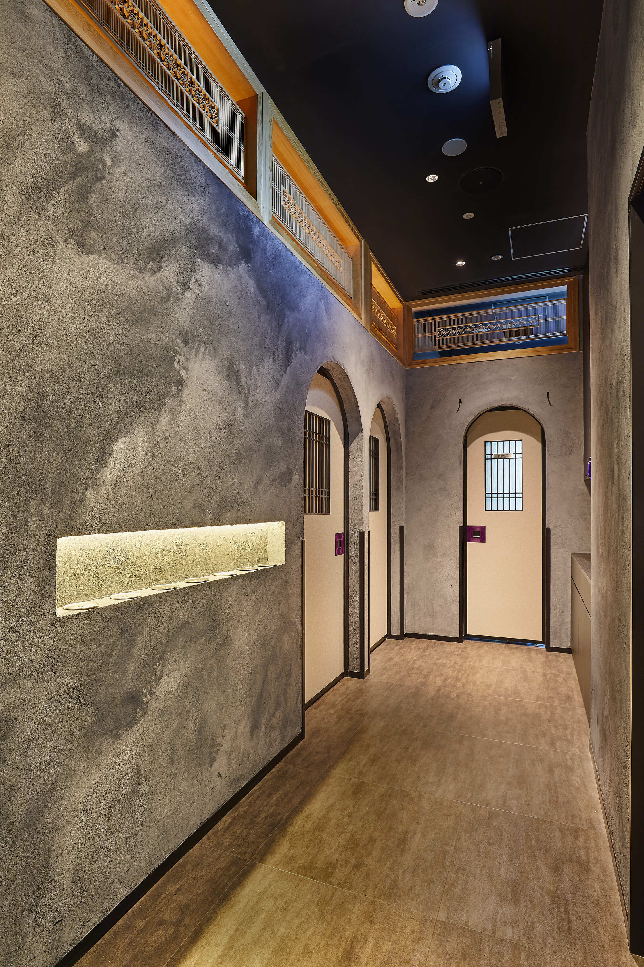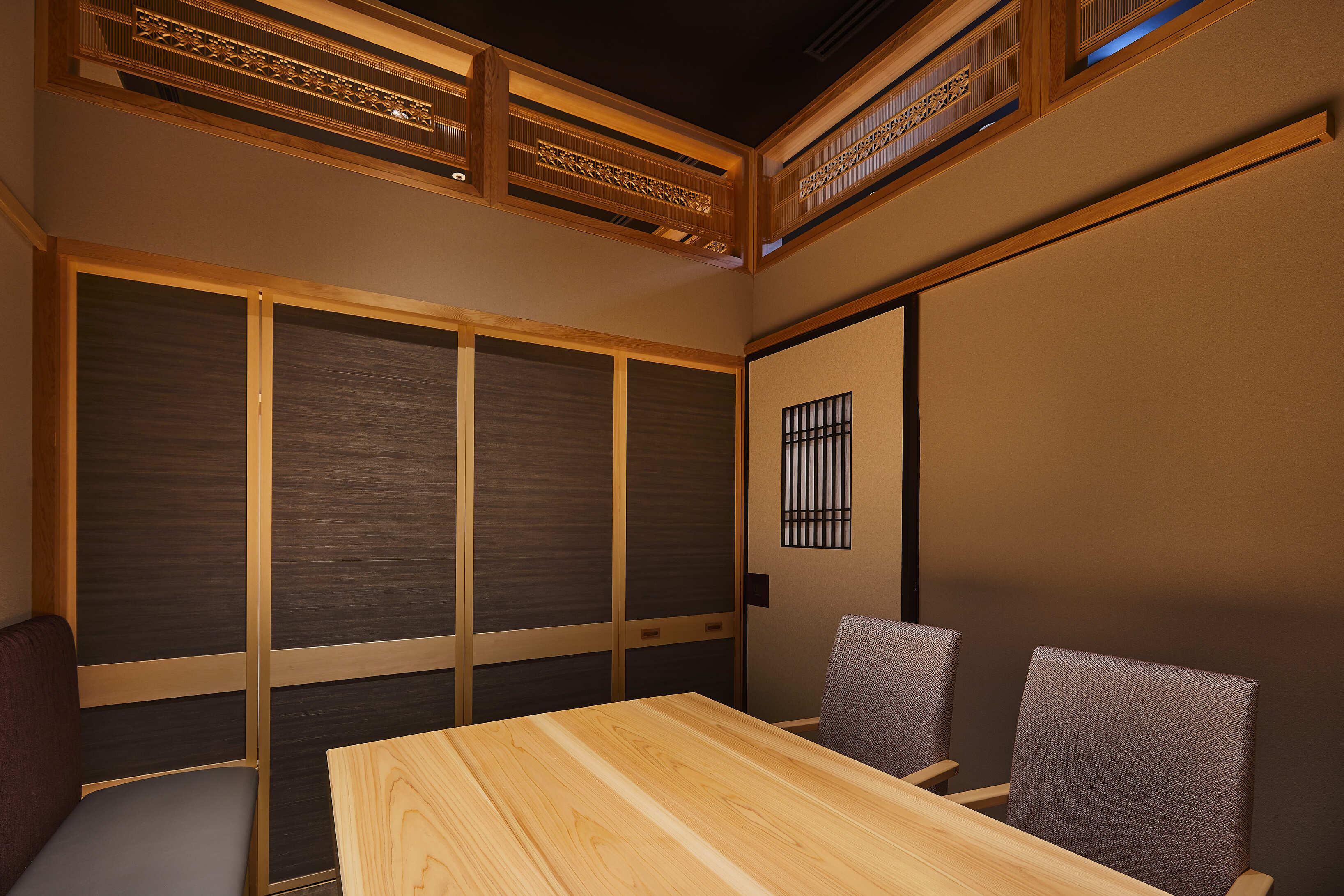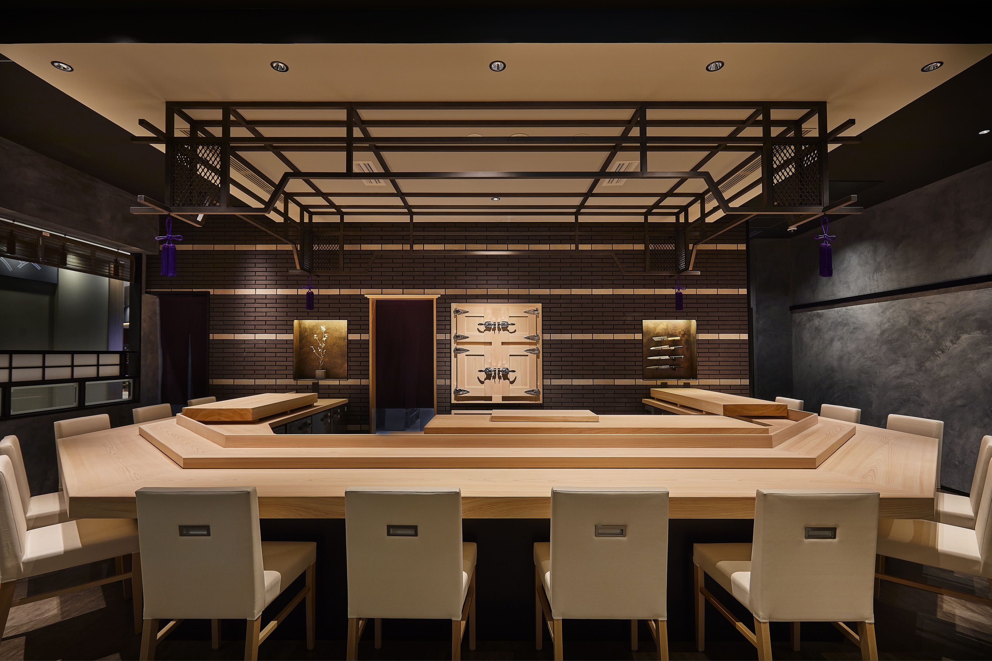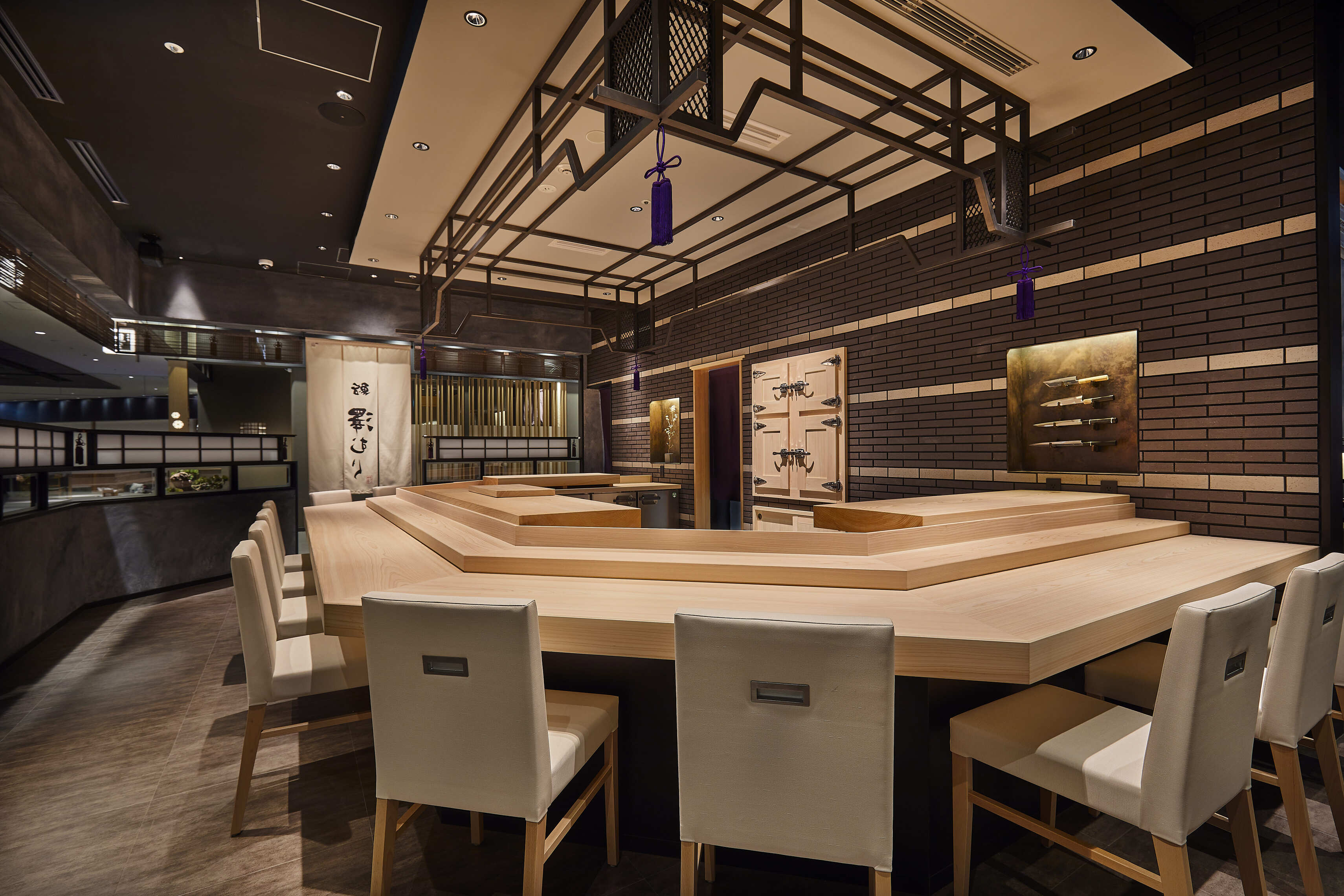 Located in Grand Green Osaka, Sushi Sawamura blends excitement with a relaxed atmosphere. The entrance features a grand noren and a tsubo-niwa garden with art bonsai. Inside, deep shadows heighten senses beyond sight—scent, sound, and taste. The space consists of "breathing materials" like earth, wood, and stone. The "Floating Hinoki" counter, appearing to drift in mid-air, serves as the heart of the experience, highlighting the wood’s natural fragrance. By stripping away the excess, we created a refined space that resonates with guests.