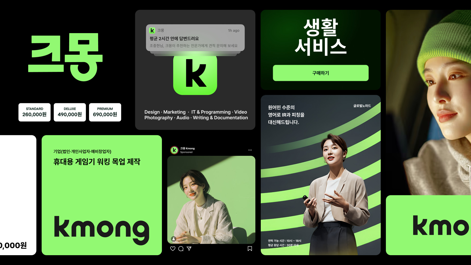 우리는 크몽이 더 이상 ‘친근한 플랫폼’으로 보이면 안 된다고 판단했다. 13년간 유지해온 원숭이 캐릭터는 성공의 상징이었지만, 동시에 엔터프라이즈 시장으로 나아가는 데 가장 큰 장애물이기도 했다. 2012년 재능마켓으로 출발한 크몽은 이미 300만 회원, 50만 전문가가 활동하는 대한민국 최대 휴먼클라우드 플랫폼이었다. 현실의 비즈니스는 대기업, 전문직, B2B 거래 중심으로 완전히 이동해 있었지만, 브랜드는 과거에 머물러 있었다. 우리는 이 불일치를 제거하는 데서 리브랜딩을 시작했다. 캐릭터를 폐기하고 ‘크몽’이라는 이름 자체를 로고로 만드는 워드마크 전략을 선택했다. 설명이 필요한 상징 대신, 이름 그 자체가 전문성과 신뢰를 대표하도록 설계했다. 컬러 역시 과감했다. 한국 플랫폼 시장에서 의미를 상실한 옐로우를 버리고, 신뢰·성장·확장을 담은 ‘크몽 그린’을 정의했다. 워드마크의 ‘K’는 우상향 곡선으로 성장과 협업을 시각화하며, 과거 캐릭터의 흔적을 남겨 단절이 아닌 진화를 말한다. 이번 리브랜딩은 크몽의 변화가 아니라, 우리가 시장의 기준을 다시 세운 결과다.