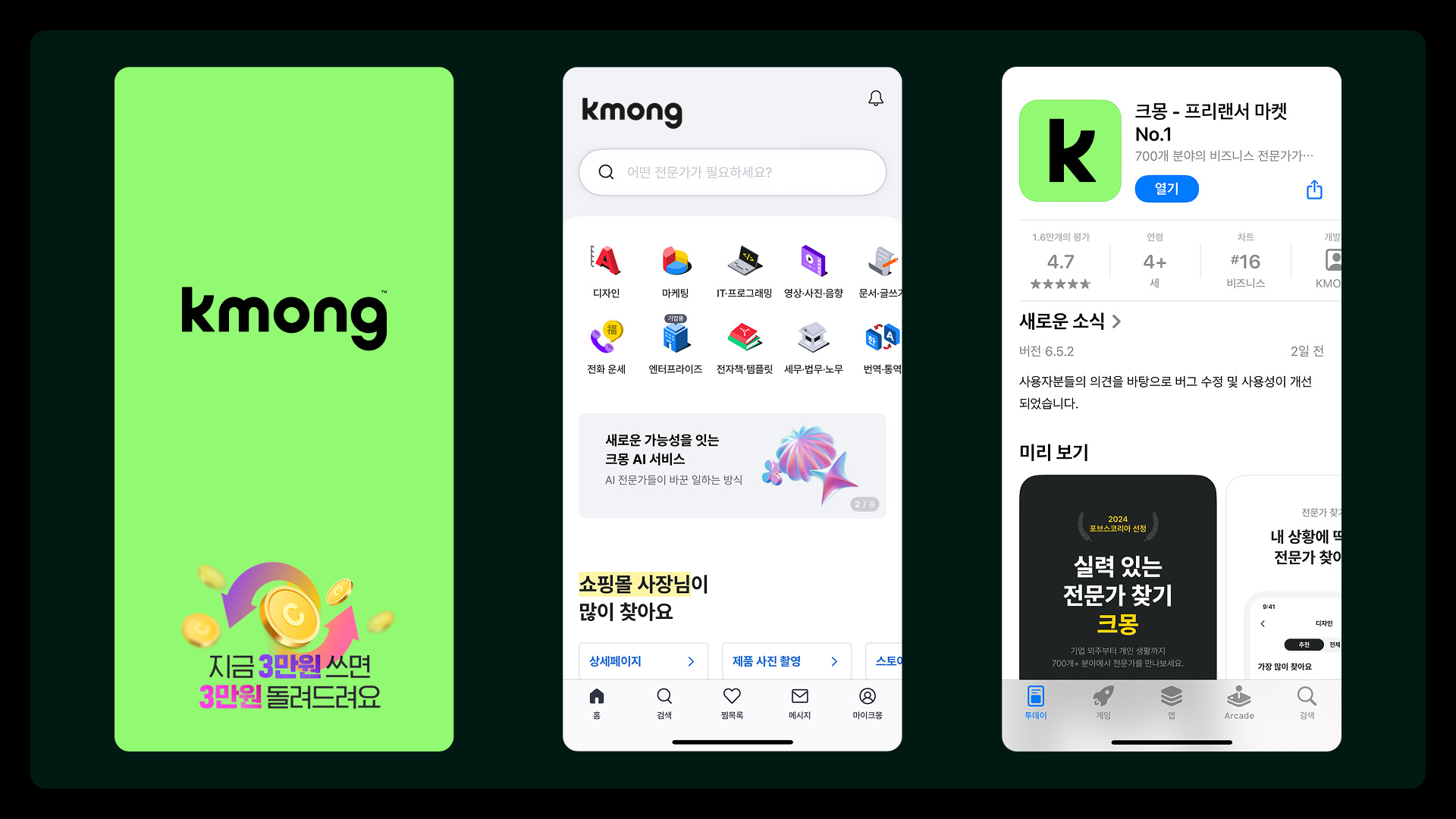 Founded in 2012, Kmong has grown into South Korea’s largest freelance platform, serving over 3 million users and 500,000 professionals. As the platform expanded toward the enterprise market, a clear B2B positioning became essential to reflect its evolving role. Kmong replaced the character with a wordmark, making the name itself a symbol of trust and professionalism. Yellow was replaced by “Kmong Green,” expressing credibility, growth, and innovation for B2B markets. The redesigned ‘K’ embodies upward growth and collaboration, subtly referencing brand heritage and marking a shift toward long-term professional leadership.