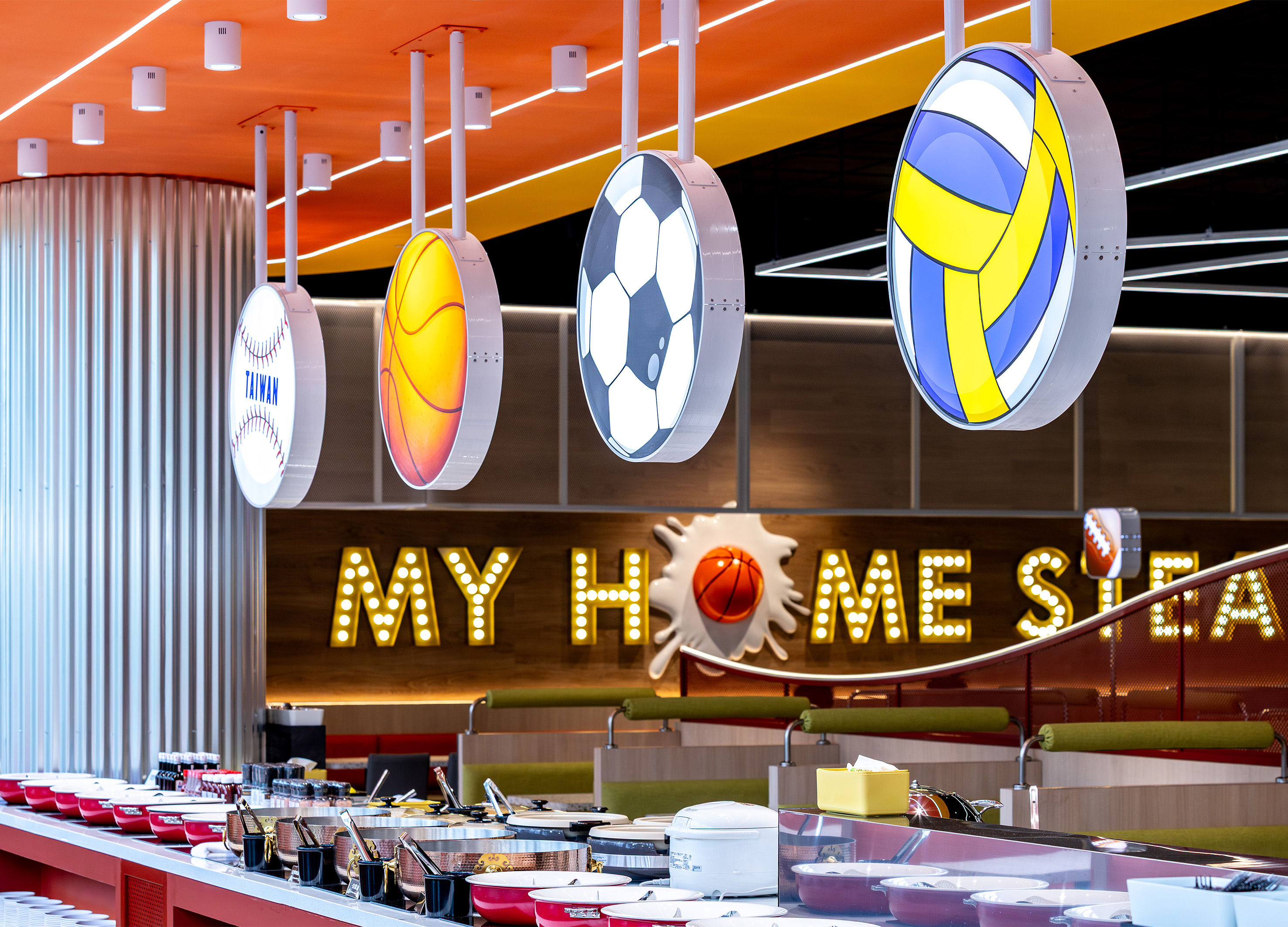 My Home Steak Far Eastern Store blends youthful energy with thematic design. The space features a lit "MY HOME STEAK" sign, where the "O" creatively transforms into a fried-egg basketball, sparking appetite and vitality. The buffet island adopts a "youth runway" concept, highlighted by an orange gradient ceiling and mosaic "GO" tiles. Suspended sports-ball lamps and red wave-shaped panels further define the area while maintaining an open flow. Finally, dynamic light strips capture the rhythmic energy of a stadium, perfectly enhancing the "Move to Eat" spirit through visual motion.