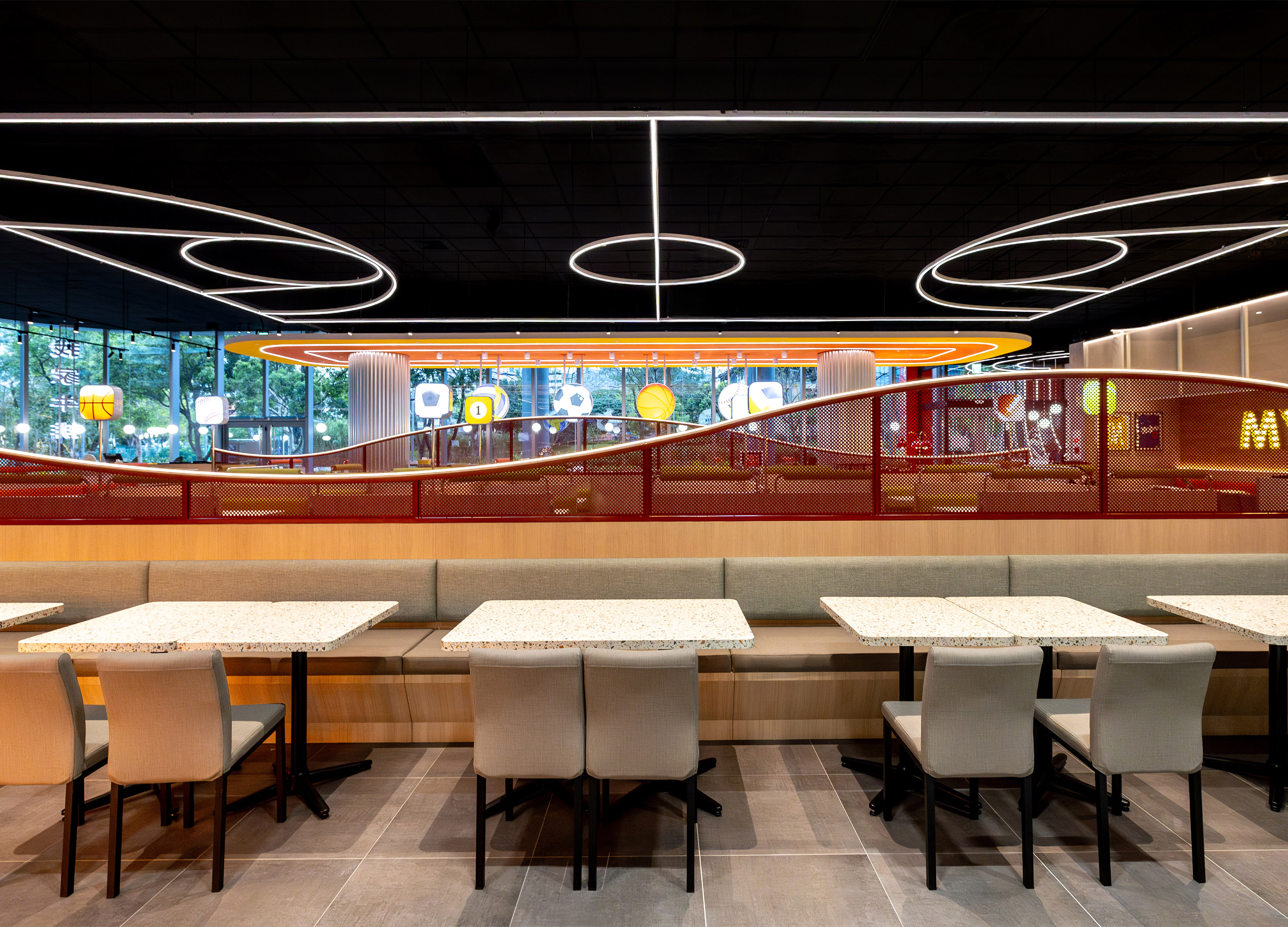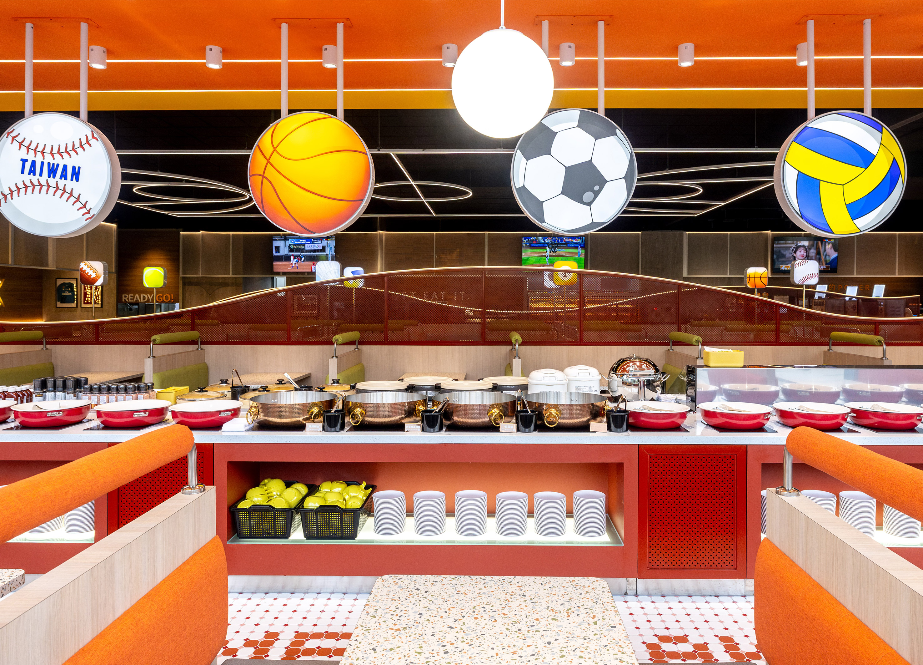 我家牛排遠企店展現了青春動感與主題設計的完美融合,設計團隊將用餐空間轉化為一座充滿生命力的舞台。主視覺牆面以亮燈字樣「MY HOME STEAK」吸引目光,巧妙地將字母O創意轉化為「荷包蛋籃球」,在視覺上將食慾與運動能量幽默交會,營造出趣味橫生的開場。為呼應年輕世代熟悉的視覺語彙,中島自助吧台以「青春跑道」為核心概念,運用橘黃漸層的圓弧天花板象徵賽道的起跑線與加速軌跡,地面則以馬賽克磁磚精巧拼出「GO」字樣,不僅喚起熱血的競賽精神,更點出了自助吧「開吃即比賽」的互動樂趣。 空間中高懸著籃球、棒球、排球與足球等各式球類燈飾,成為室內最吸睛的視覺焦點,與「運動後援會」的設計主題相互輝映。而在區域劃分上,設計師採用紅色波浪造型的洞洞板隔屏,其靈感源自運動場常見的鐵絲網,在界定用餐區域的同時,亦保留了視線的穿透性與空間流動感。整體設計透過大量弧線與動態光帶,精準捕捉球類運動噴發的動能,讓靜態空間流露出律動感,完整實踐了「青春動吃動」的設計精神,為饕客帶來一場視覺與味蕾的雙重饗宴。