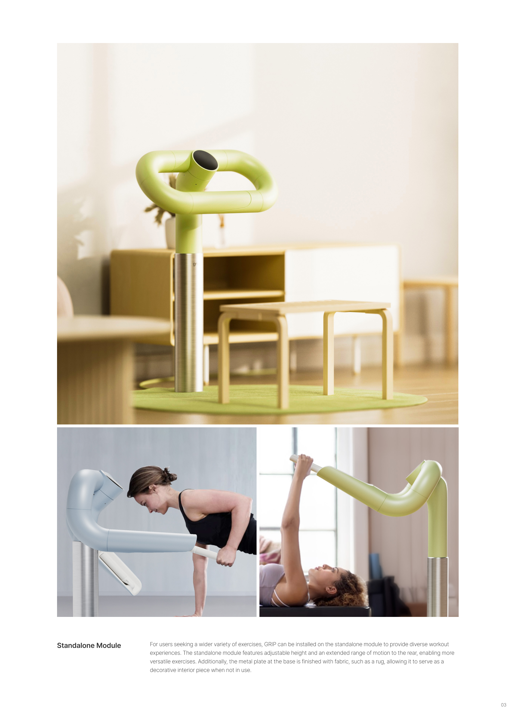 GRIP은 로봇이 아직도 가정 내로 쉽게 들어오지 못하는 이유와 이를 극복하기 위해 로봇이 어떻게 변화하고 행동해야 하는지에 대한 질문에서 출발한 프로젝트입니다. 기존 로봇들은 가정 내 가사 노동이나 간단한 태스크에 집중하며, 사용자와의 상호작용은 주로 감정적인 교류에 한정됩니다. 이에 반해, GRIP은 가정용 로봇의 새로운 방향성을 제안합니다. GRIP은 로봇을 사용자와의 물리적 상호작용하는 파워 그 자체로 정의하는 피트니스용 로봇으로, 기존의 노동 중심적인 가정용 로봇과는 다른 접근을 제안합니다. 또한, 기존 로봇들이 기능적이고 때로는 생명체를 연상케 하는 모습으로 거부감을 일으키는 반면, GRIP은 아이들 상태에서는 공간 사용을 최소화하면서도 인테리어와 조화롭게 어우러지는 오브제 역할을 수행하며, 운동 시에는 각 팔의 자유도를 활용해 각 운동에 알맞는 폼으로 변하게 됩니다. GRIP은 사용자에 알맞는 무게 저항을 제공하여 운동을 도우며, 디스플레이에 위치한 AI 카메라는 사용자의 운동 능력을 분석하여 앱을 통해 개인 맞춤 운동 루틴과 적절한 무게 저항을 추천합니다. 추가로, 사용자들은 더 다양한 운동 경험을 위해 스탠드얼론 모듈을 설치할 수 있으며, GRIP의 컬러나 재질을 사용자의 인테리어에 맞게 커스터마이징할 수 있습니다.