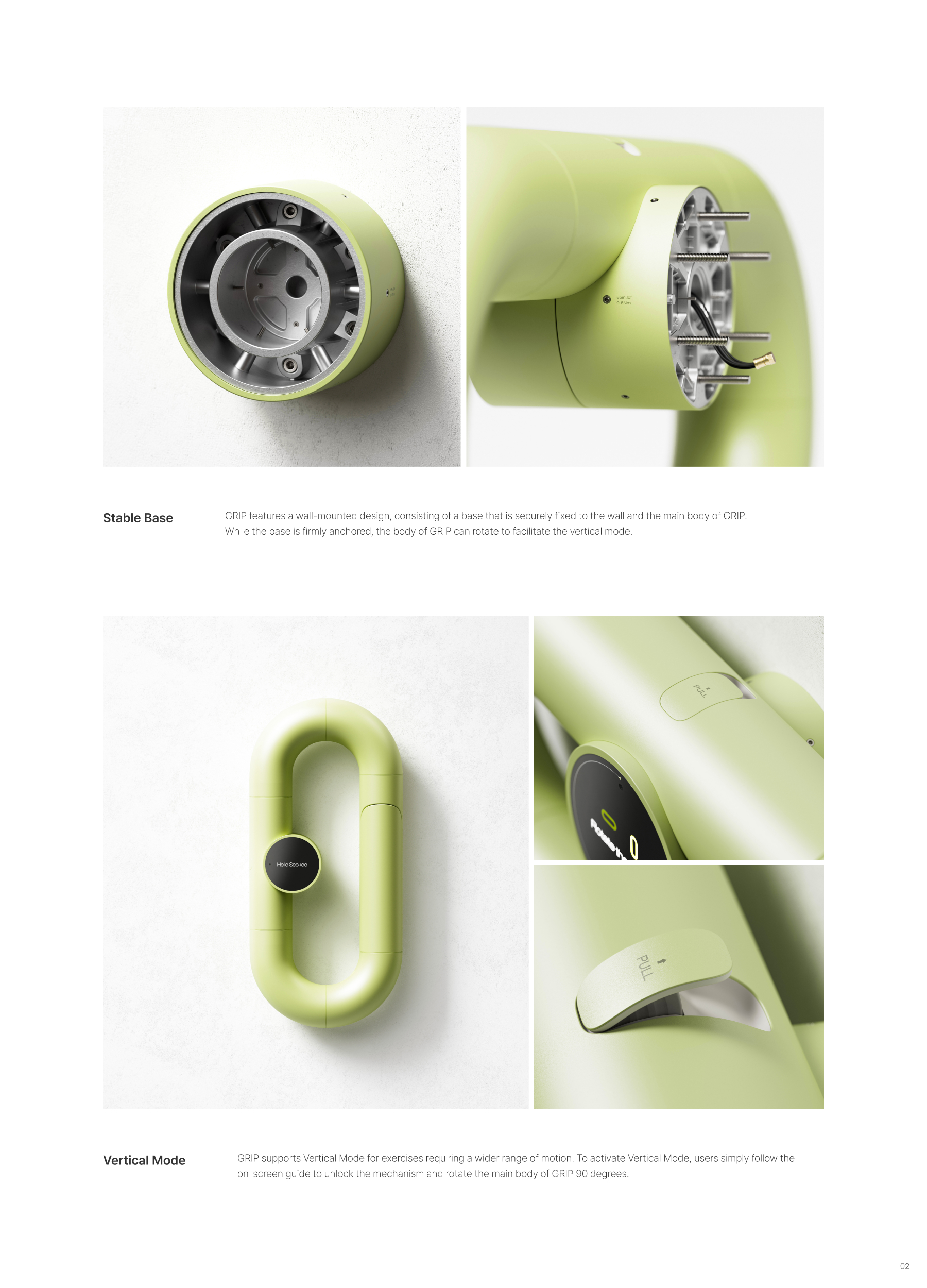 Starting with considerations of how robots should look and behave to seamlessly integrate into domestic life, GRIP is a project that proposes a new direction for home robotics, which have traditionally focused on labor or non-physical interactions. GRIP redefines robots as sources of power capable of engaging in physical interactions with users in their homes. As a smart fitness robot, GRIP stands out for its interactive physical engagement, setting itself apart from conventional task automation. With its minimal design, GRIP acts as a modern decor when idle, minimizing space usage while offering a variety of workouts in workout mode.