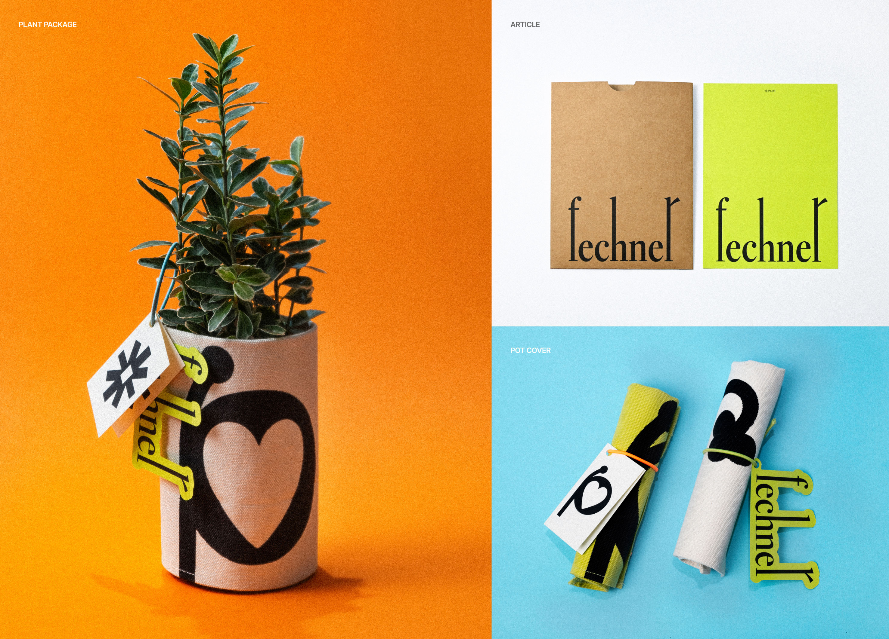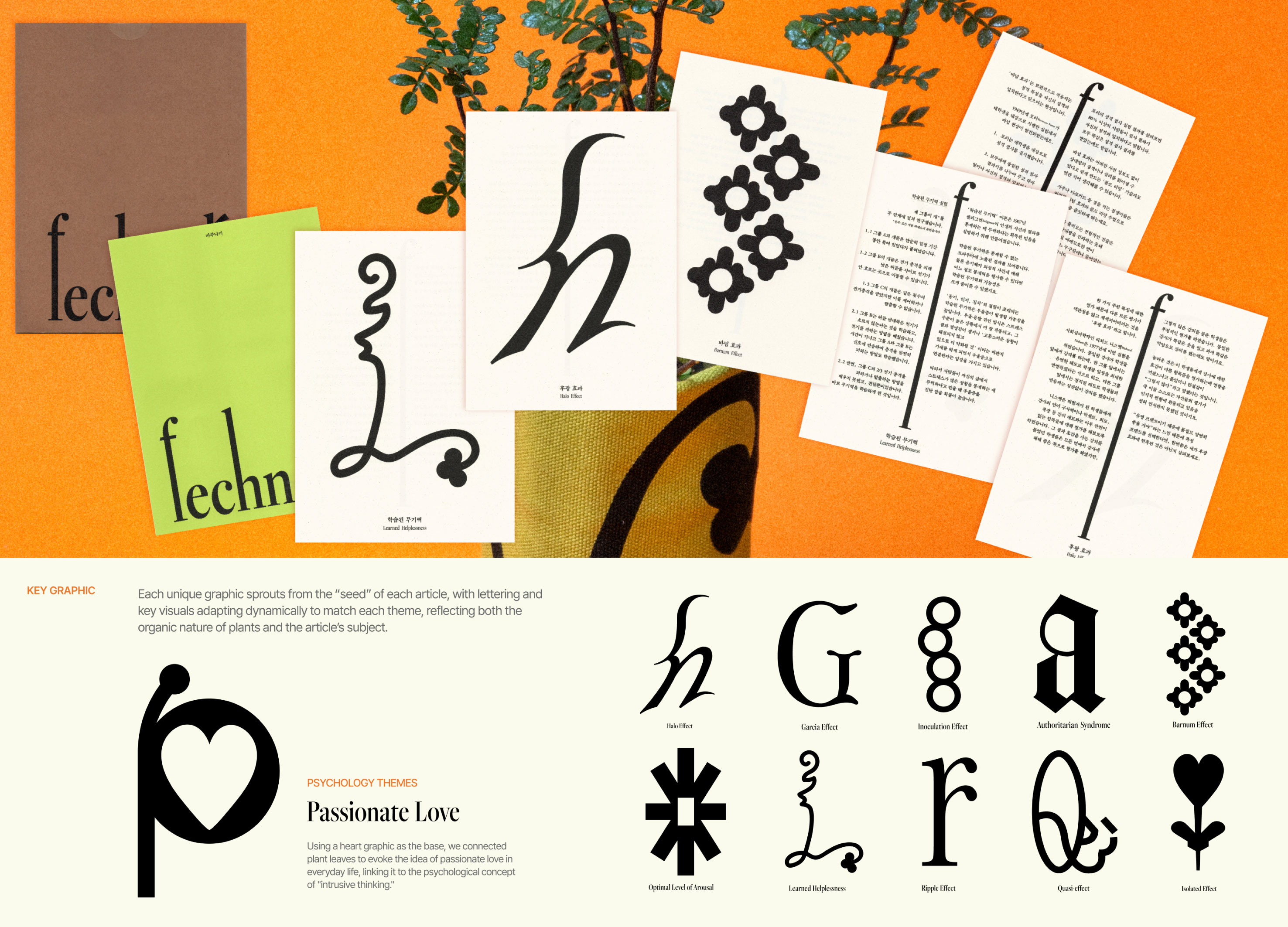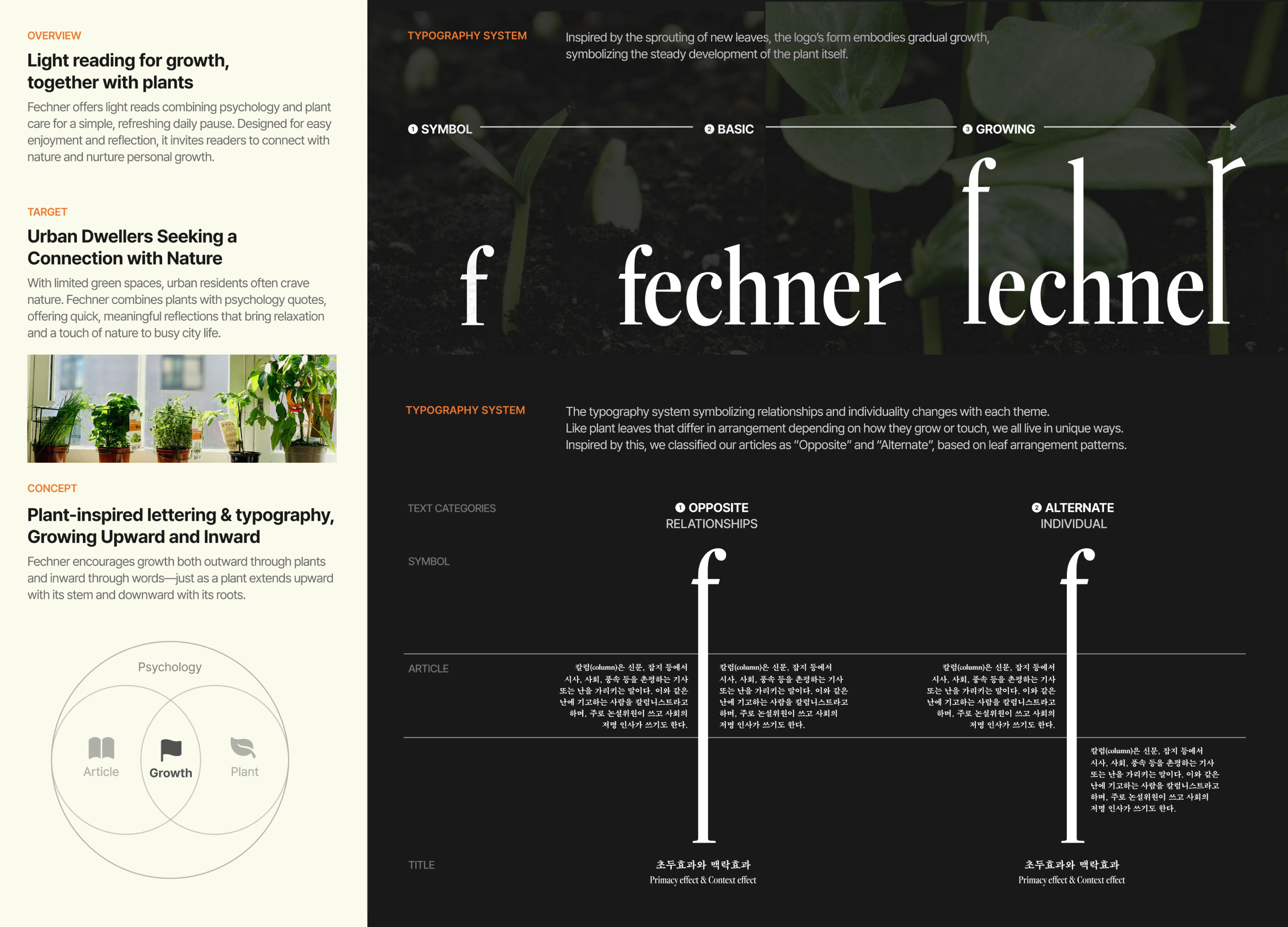 Fechner의 로고타입은 로고타입은 새싹이 자라나는 모습에서 영감을 받아 점진적인 성장의 형태 변화를 통해 우리와 식물의 지속적인 발전을 형상화합니다. 또한, 식물의 잎 배열 순서와 맞닿는 방식을 반영하여 아티클을 ‘마주나기(Opposite)’와 ‘홀로나기(Alternate)’로 분류해 우리의 다양한 삶의 방식을 담은 새로운 조판 언어를 도입하였습니다. 각 아티클의 그래픽은 제목을 씨앗으로 삼아 만들어진 글자이자 식물로서, 주제에 따라 다양한 형태로 확장됩니다.