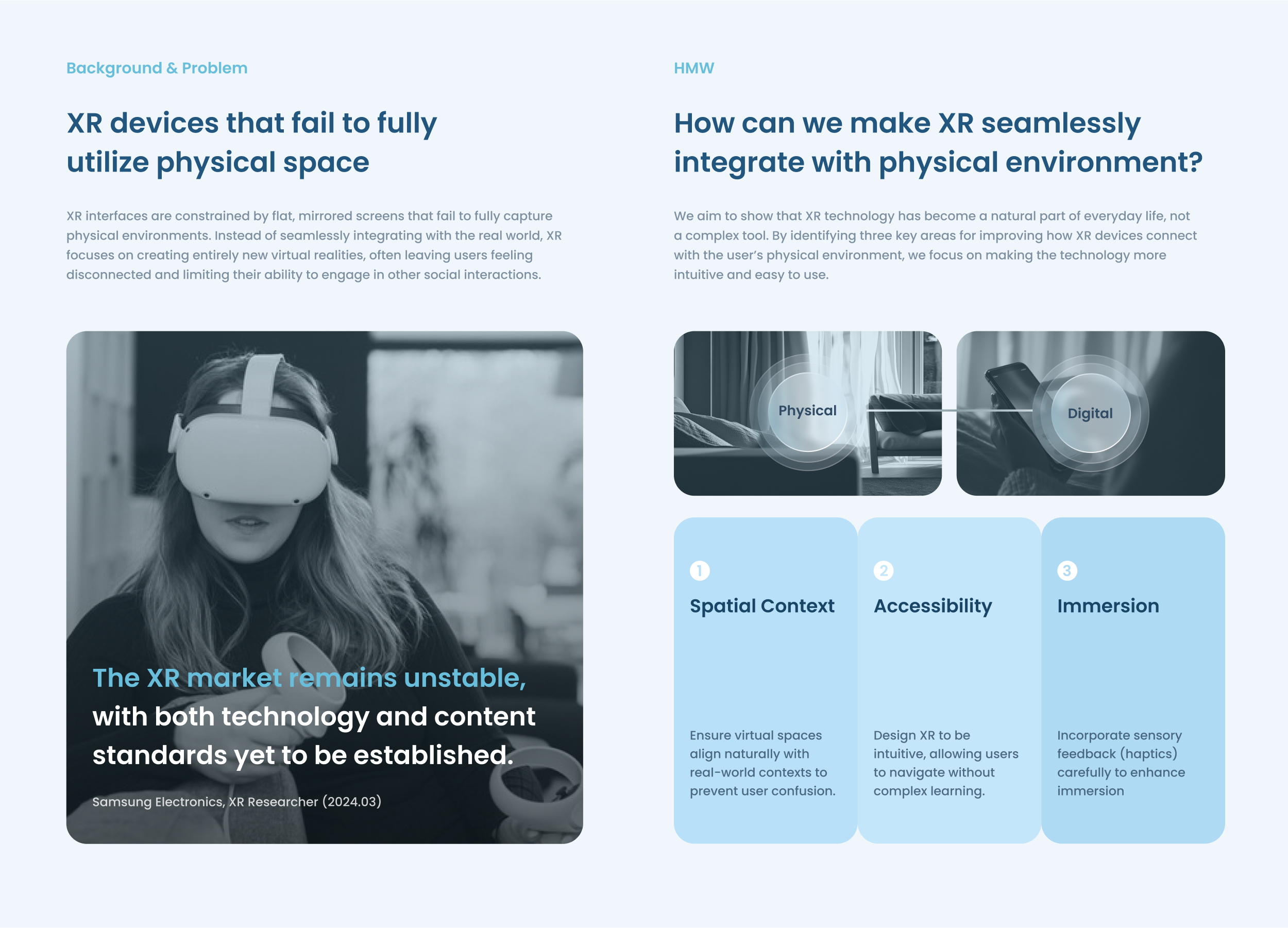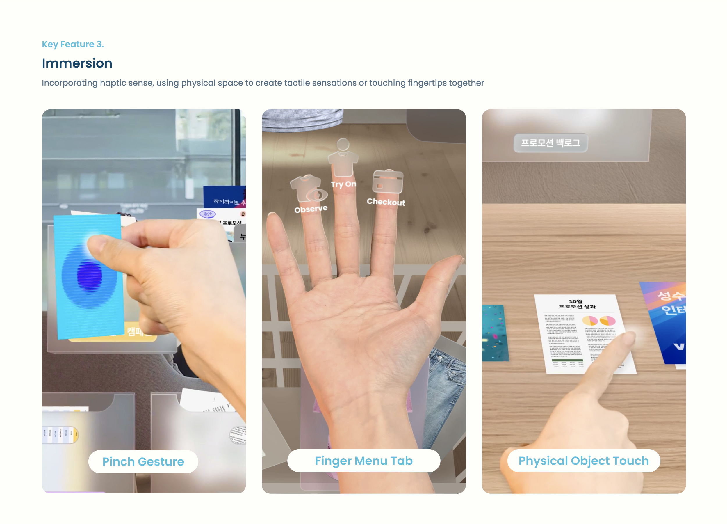 (3)촉각 보완을 통한 몰입감 향상: 기존 XR 경험에서 부족하다고 여겨지던 촉각 피드백을 보완합니다. 손가락과 손가락을 맞대는 핀치 제스처와 책상, 쿠션 같은 물리적 표면을 활용해 디지털 환경에서도 현실의 생생한 감각을 느낄 수 있습니다.