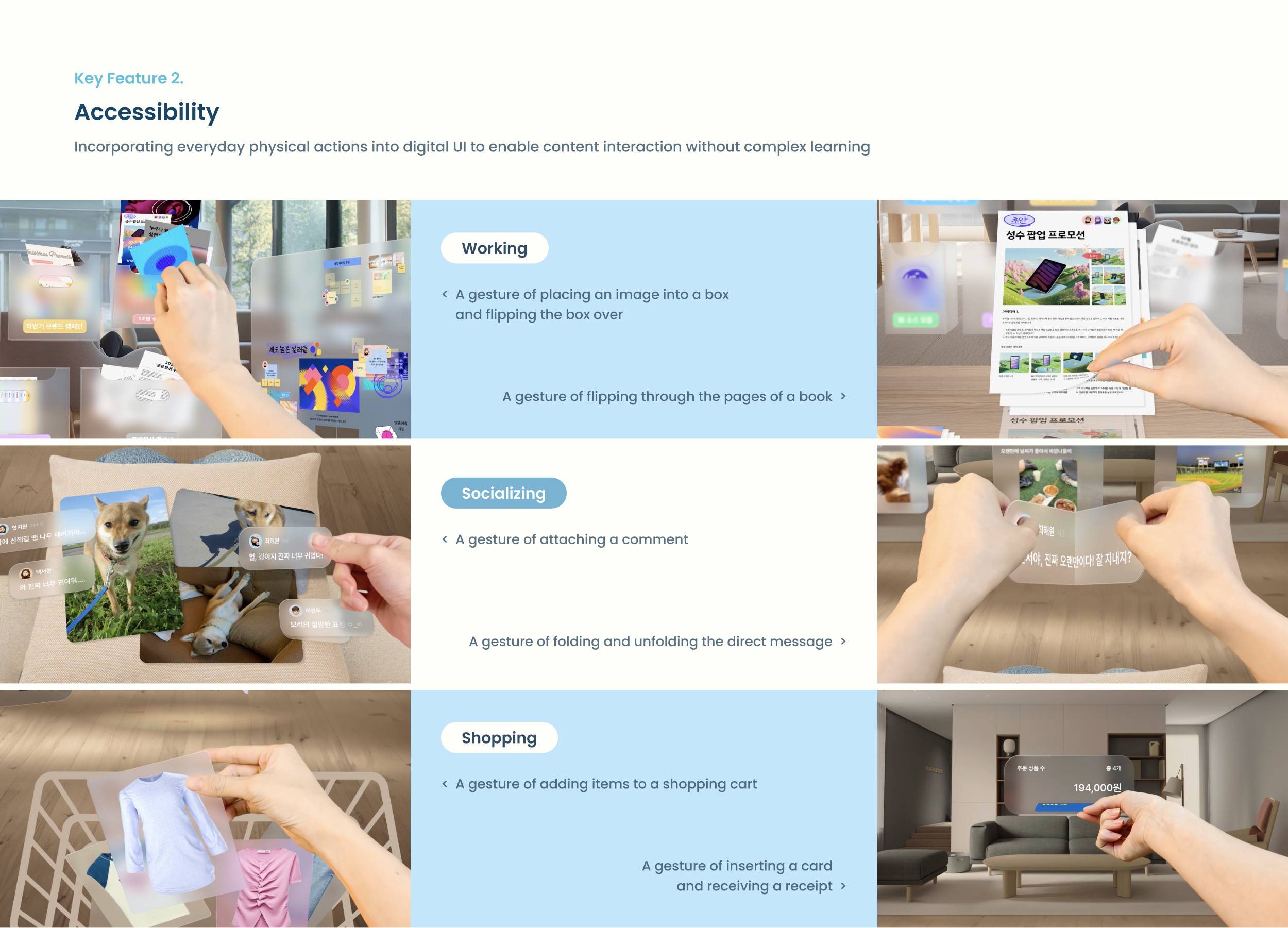 (2)익숙한 동작을 통한 직관적인 상호작용: 일상에서 자연스럽게 사용하는 행동을 디지털 환경에 맞게 구현해 누구나 쉽게 적응할 수 있는 직관적인 상호작용을 제공합니다. 종이를 넘기거나 포스트잇을 붙이는 동작처럼 익숙한 행동을 디지털 경험으로 녹여냈습니다.