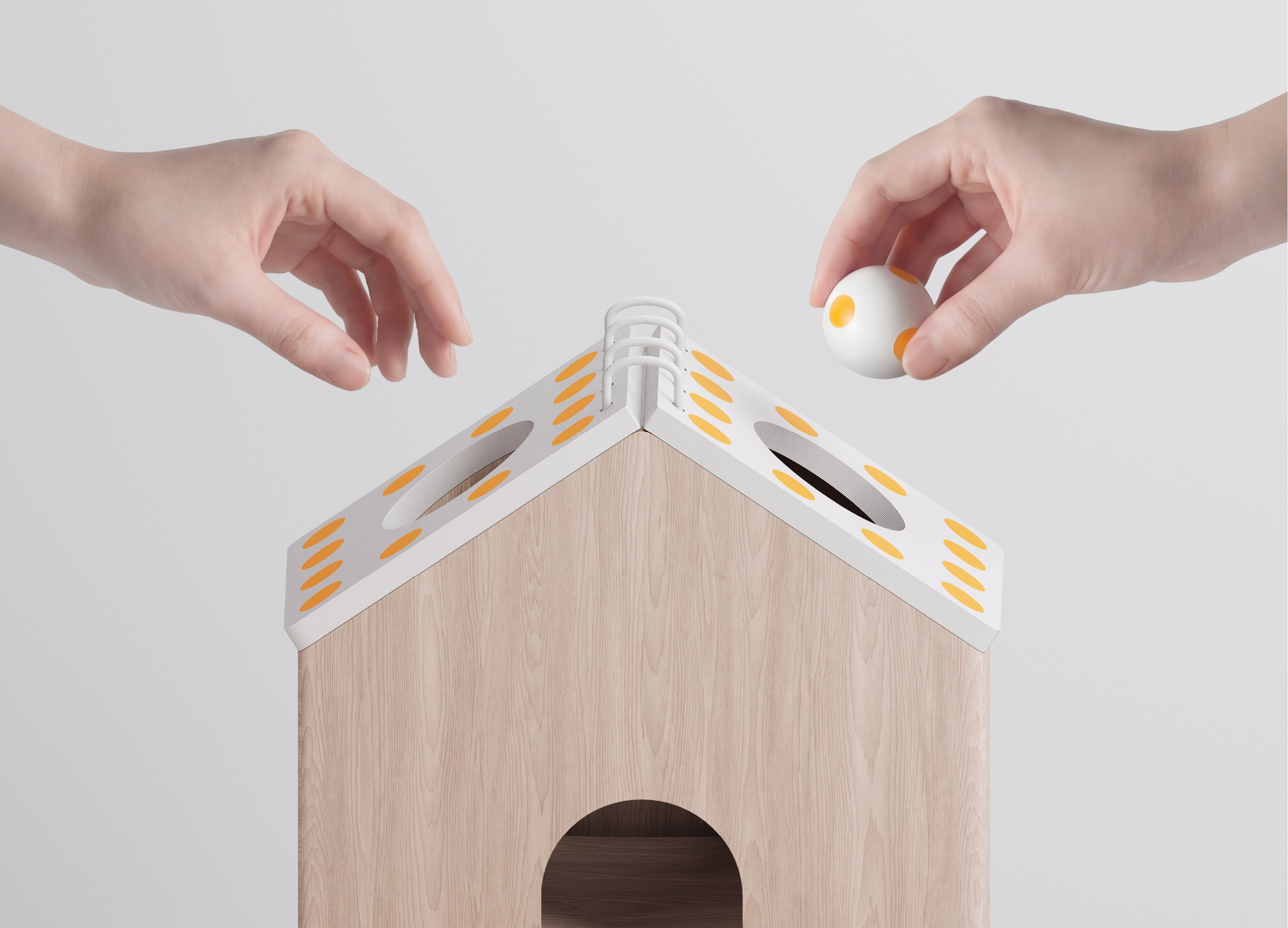 Addressing the isolation and cognitive decline facing 10% of the global elderly population, Cooperative House offers an interactive analog solution. This house-shaped toy features a simple, intuitive design where two players collaborate to match colored balls to roof patterns. The rule requiring joint success fosters natural communication and deep immersion. Replaceable roof pages allow for difficulty adjustment, ensuring sustained interest and long-term cognitive benefits. Ideally suited for both seniors and children, this mechanism enhances cognitive health, fine motor skills, and social cooperation across generations.