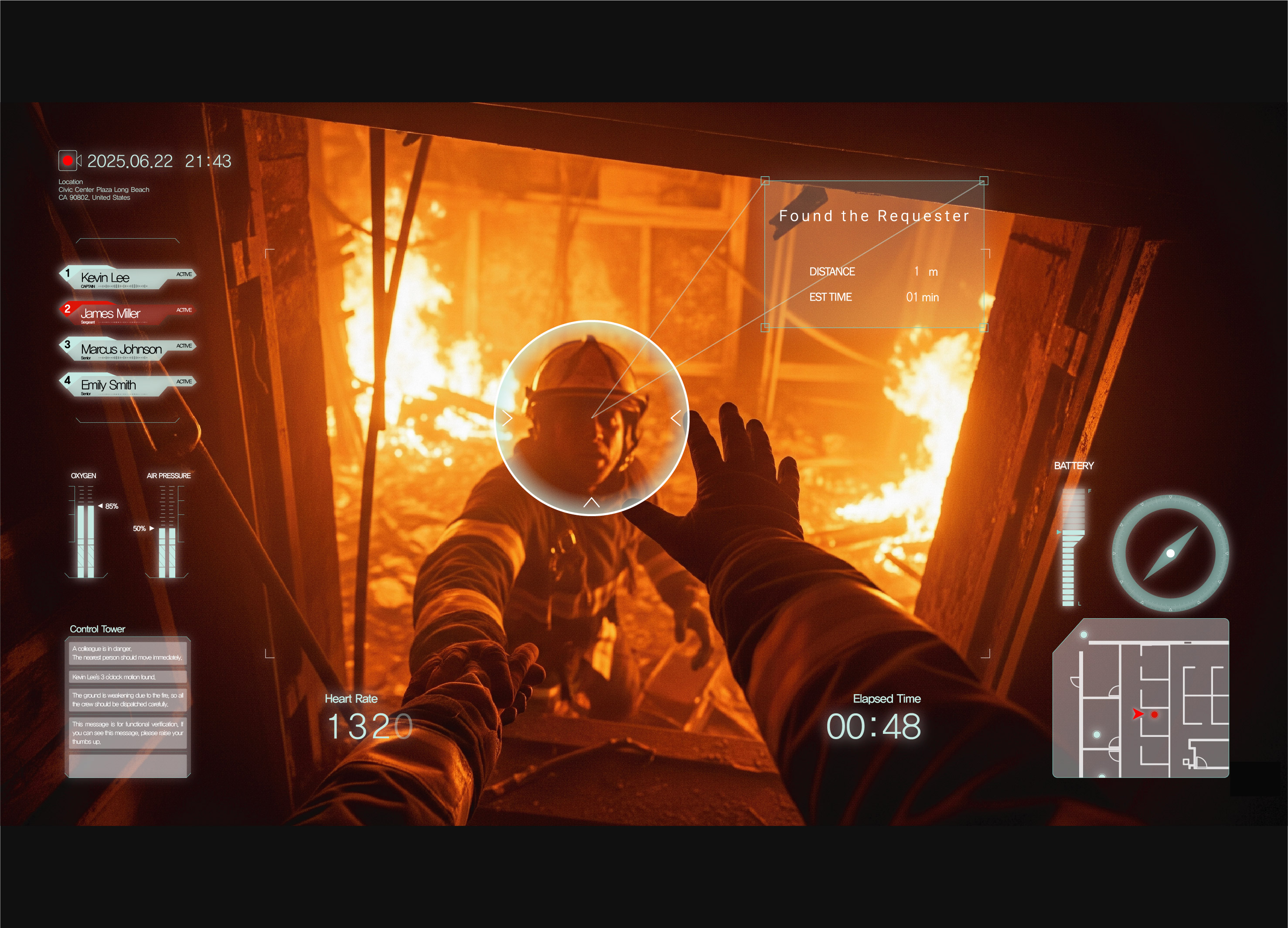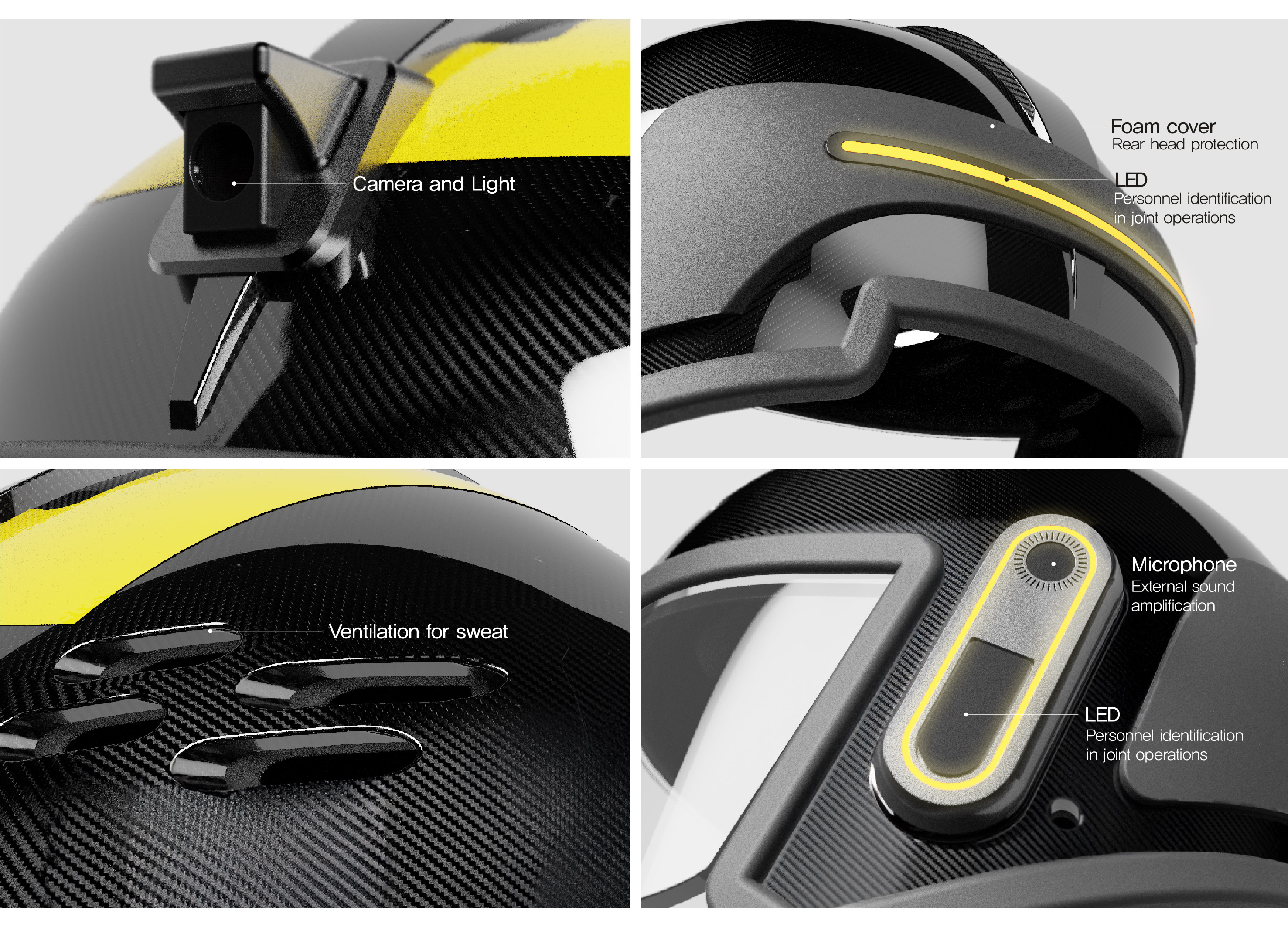 화재 현장은 유독성 연기로 인한 시야 차단과 극도의 소음, 정보 과부하가 동시에 발생하는 극한의 환경입니다. 이로 인해 소방관은 고립과 방향 감각 상실이라는 치명적 위험에 직면하며, 직감에 의존한 판단은 한계가 명확합니다. '살라만더' 헬멧은 이러한 '감각의 차단' 문제를 정면으로 해결하기 위해 탄생한 '능동적 파트너'입니다. 핵심 기능인 AR HUD는 연기 속에서도 명확한 시야를 제공하며, AI가 백드래프트나 플래시 오버 같은 치명적 위험 징후를 사전에 감지하여 즉각 경고합니다. 또한 심박수, 산소 잔량, 골든타임, 건축 도면 기반 지도 등 필수 정보를 사용자의 시야를 방해하지 않는 반투과형 인터페이스로 제공합니다. 이 모든 정보는 팀 전체와 지휘소에 실시간 공유되어, 고립된 개인을 '하나의 신경망'처럼 연결하고 데이터 기반의 효율적인 공동 대응을 가능하게 합니다. 디자인은 '신뢰'를 핵심 컨셉으로, 모든 형태가 기능적 이유를 가집니다. 전면의 'N'자형 고글 라인은 SCBA(공기호흡기)와의 완벽한 호환성을 보장하며, 장애물 걸림을 최소화하는 유선형 실루엣을 갖췄습니다. 열화상 카메라, AI 유닛 등이 명확히 분리된 '모듈형 설계'는 파손 시 신속한 교체를 가능하게 하여 현장 유지보수성과 확장성을 극대화합니다.