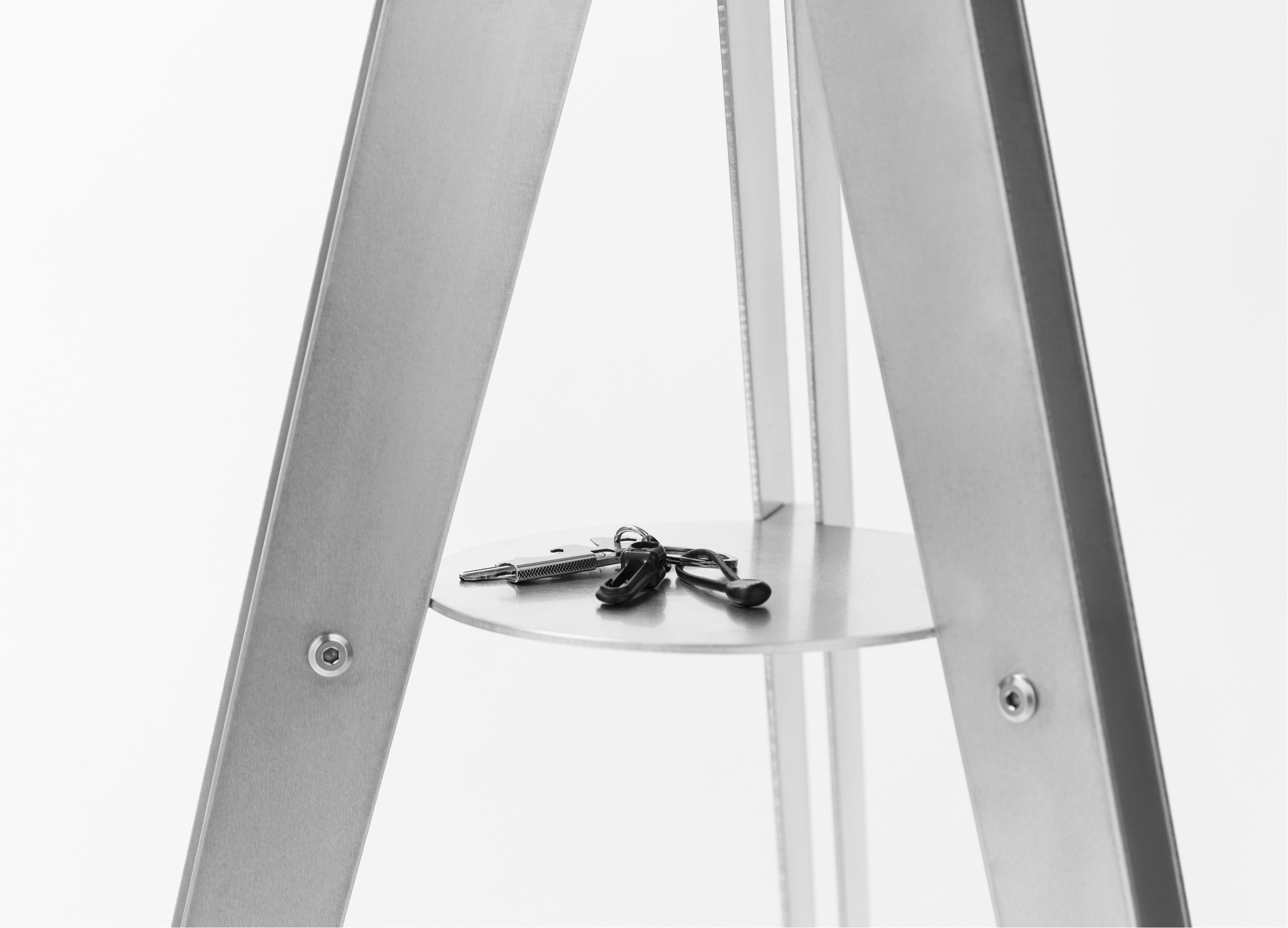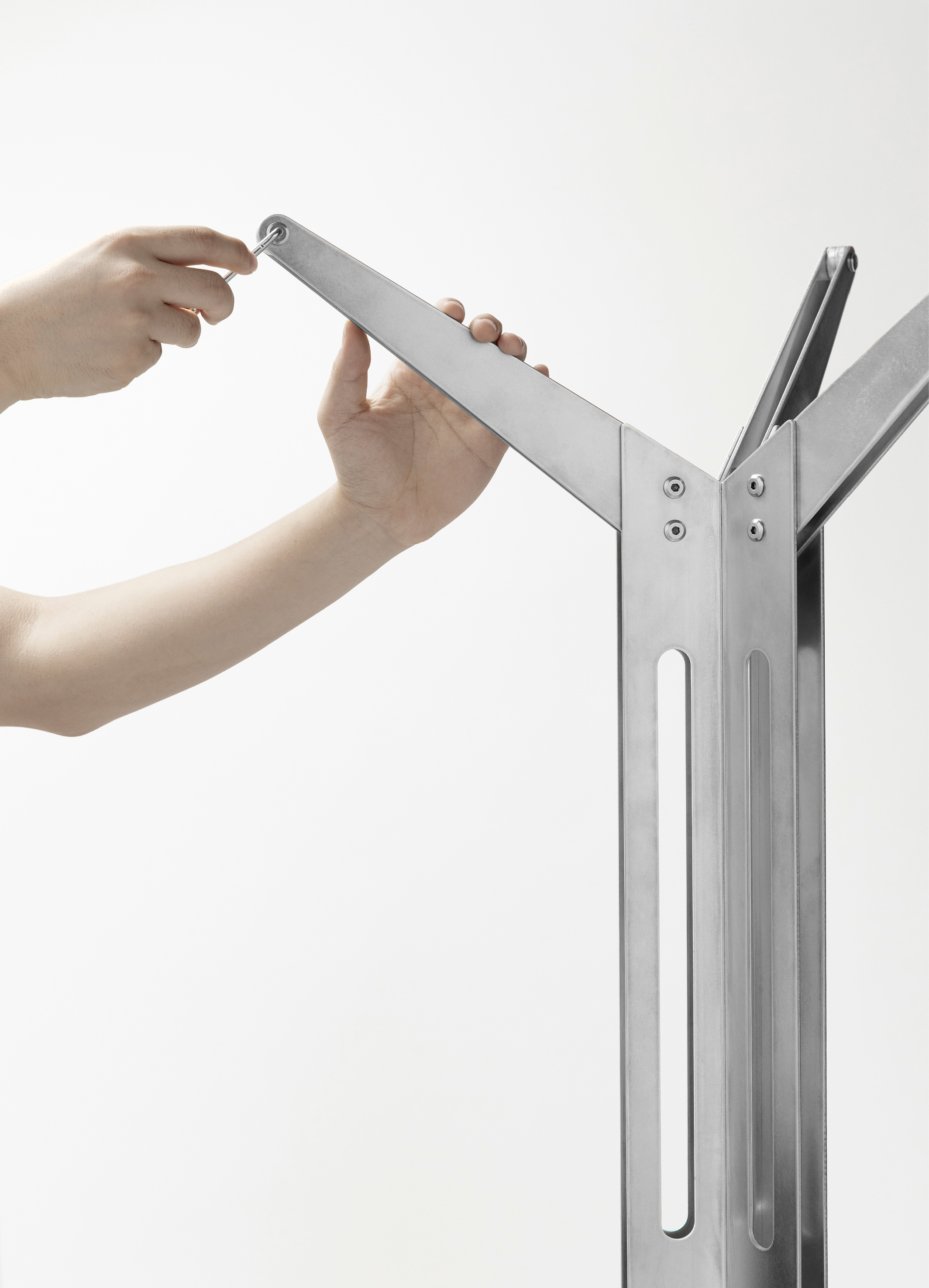 We divide our lives between the spaces of home and the outside, moving restlessly between the two. ‘INTERVAL’ is a coat rack that offers a brief pause within that boundary. Inspired by the simplified form of a bus stop, it visualizes the in-between time of movement. Its folded aluminum layers and double-sided connecting bolts reinterpret the structural rhythm of a bus stop. By replacing welding with bolted joints, the piece highlights aluminum’s sharp texture and calm order. In the fleeting act of hanging a coat, setting down belongings and catching one’s breath, the user reorganizes themselves and experiences a psychological shift.