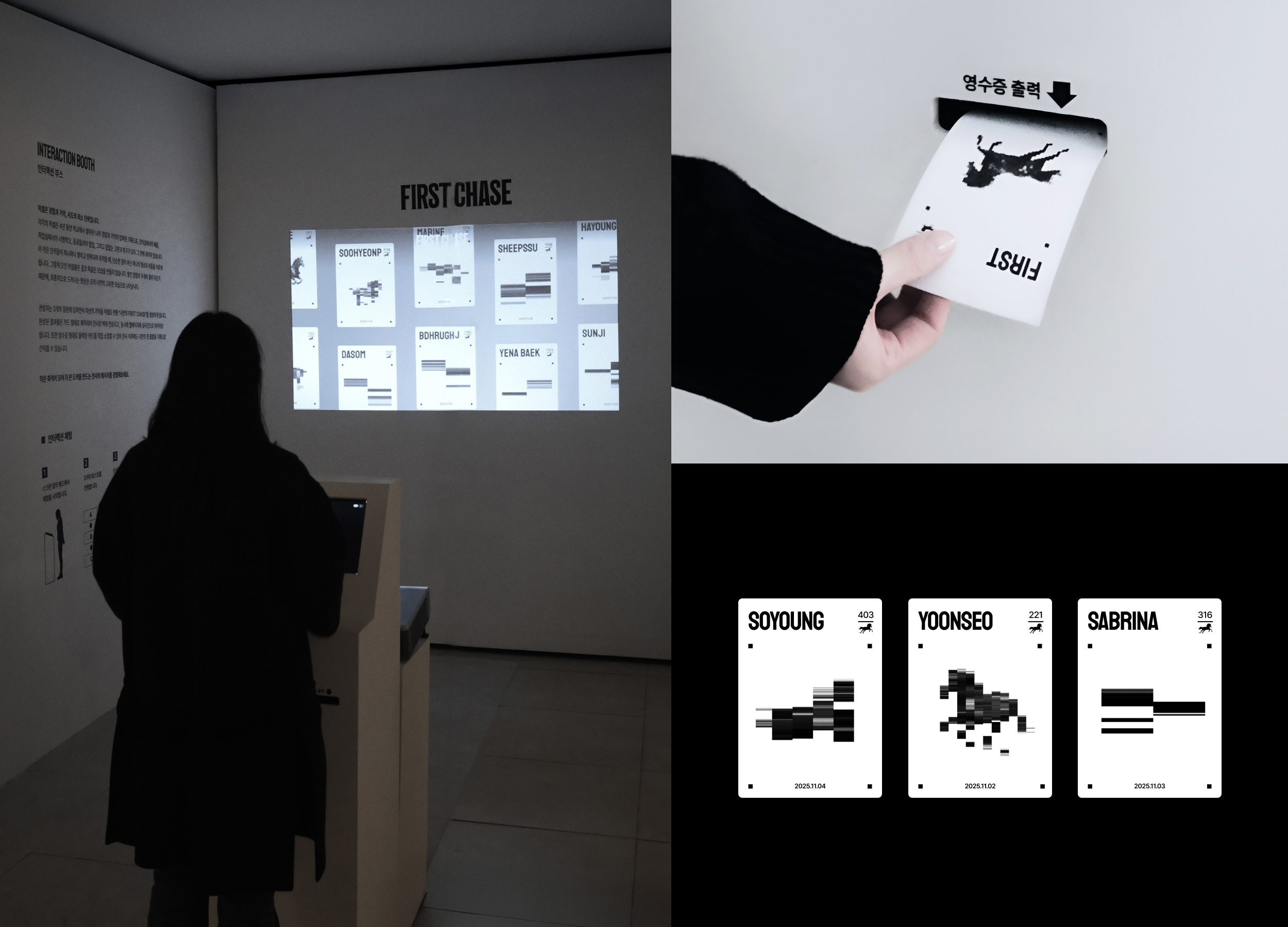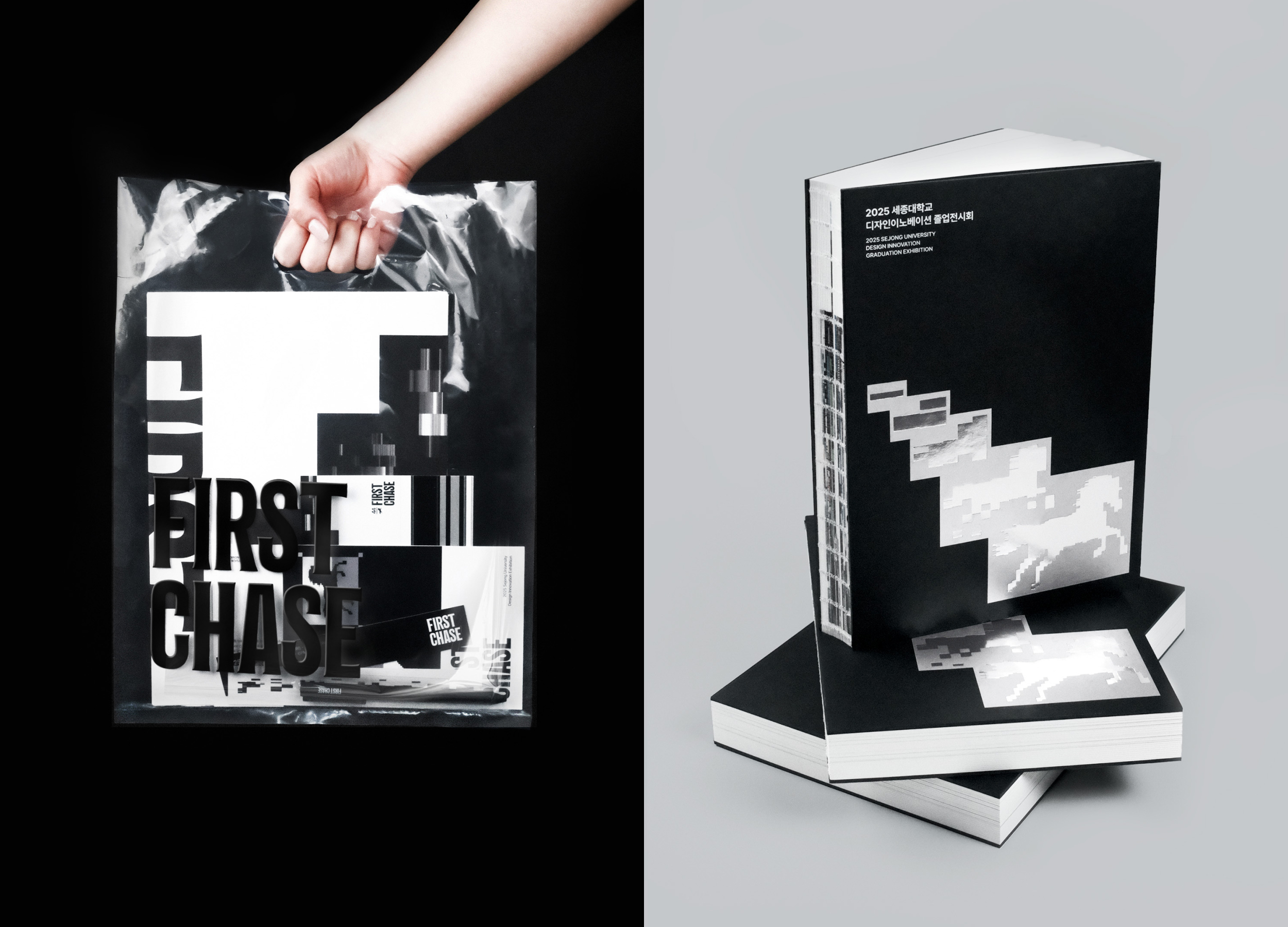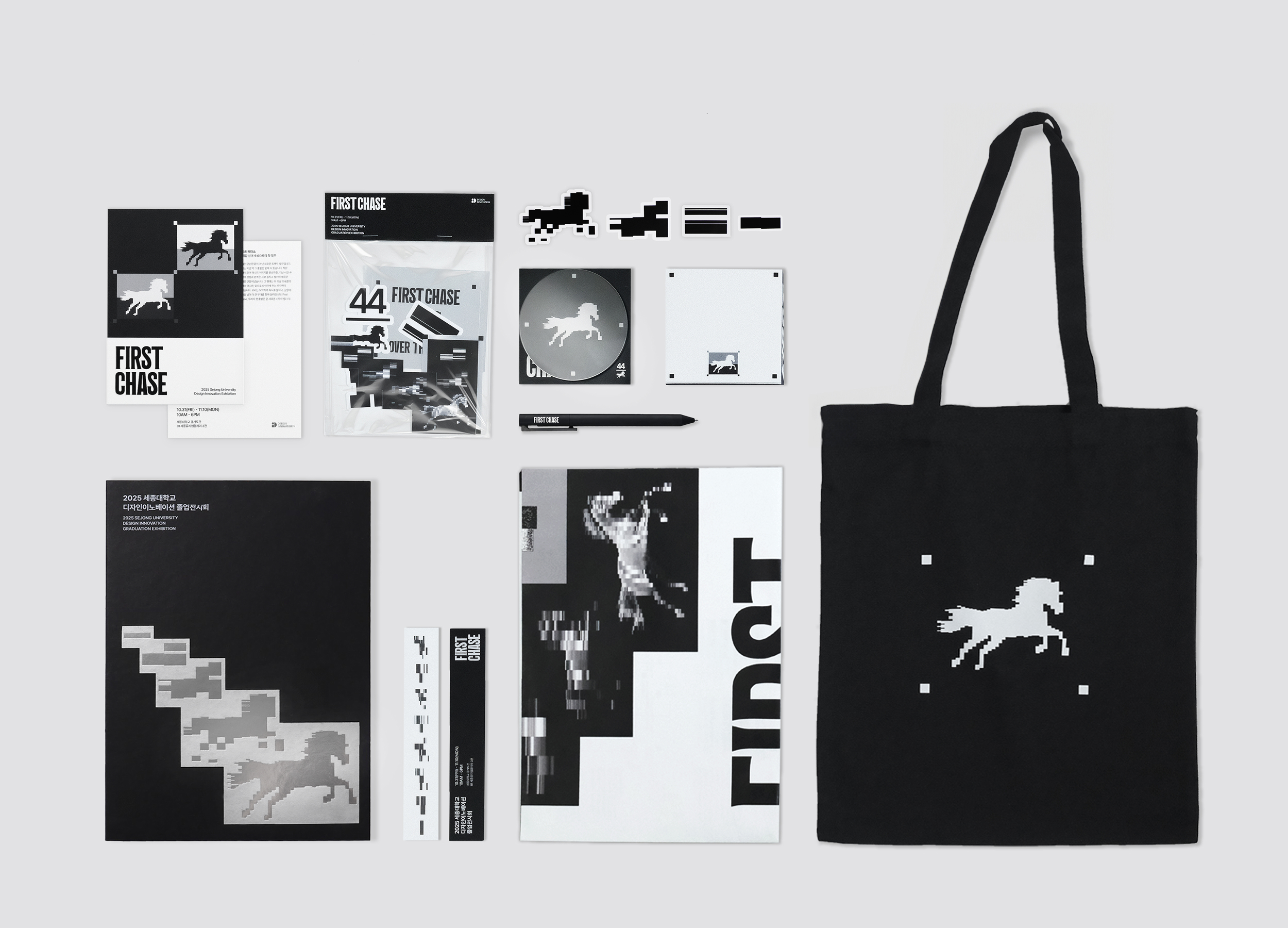 FIRST CHASE is an identity branding project created for the 44th graduation exhibition of the Department of Design Innovation at Sejong University in 2025. The project defines graduation as the moment of a first sprint into society and visualizes the state of graduates through the metaphor of a racehorse. Graduates’ experiences and choices are transformed into data and pixels, generating distinct racehorse graphics that are produced and archived through an interactive AI-based web platform. Through collaboration with AI, the project proposes a contemporary, technology-driven exhibition format.