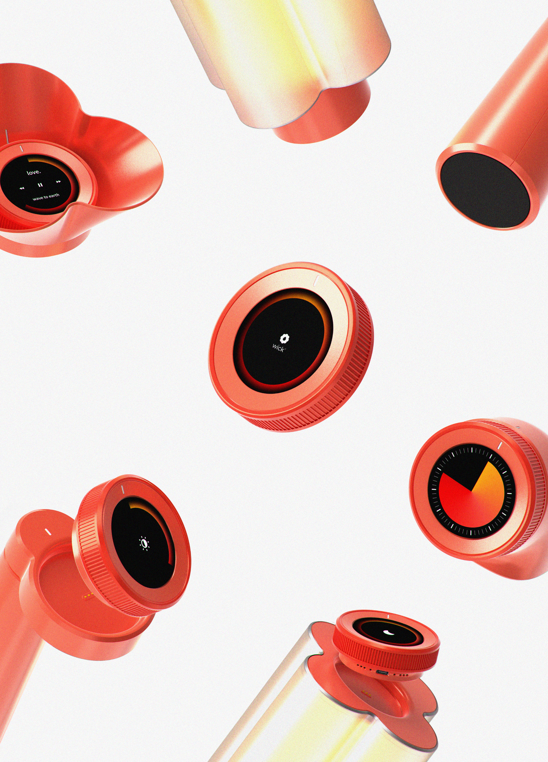 Wick은 매일 더 나은 자신을 꿈꾸지만, 의지만으로는 실천이 어려운 현대인을 위한 탠저블(Tangible) 습관 형성 디바이스입니다. 습관 형성 실패의 가장 큰 원인은 의지의 부족이 아니라, 행동을 시작하기 직전에 느끼는 심리적 부담, 즉 '시작의 어려움' 때문입니다. Wick은 보이지 않는 의지를 손에 잡히는 물리적 실체로 구현하여 이 시작의 장벽을 허물어줍니다. 사용자가 Control Module을 들고 루틴이 필요한 공간으로 이동하여 액세서리 디바이스에 결합하는 순간, 조명이 켜지거나 음악이 흘러나와 공간의 분위기를 변화시킵니다. 이 직관적인 물리적 트리거는 심리적 저항을 낮추고 '루틴 시작 신호'를 보내, 사용자가 자연스럽게 루틴에 몰입하도록 이끌어줍니다. Wick은 마그네틱 포고핀 결합 방식을 통해 업무 및 학업(Task Lamp), 취미 및 운동(Timer), 샤워(Wall Hook), 휴식(Sleep Lamp) 등 사용자의 라이프스타일에 맞춰 다양하게 활용됩니다. 또한, 루틴을 완수할 때마다 앱 속의 불꽃이 성장하는 시각적 즐거움을 제공하여, 눈에 보이지 않던 성장의 과정을 확인시켜 줍니다.