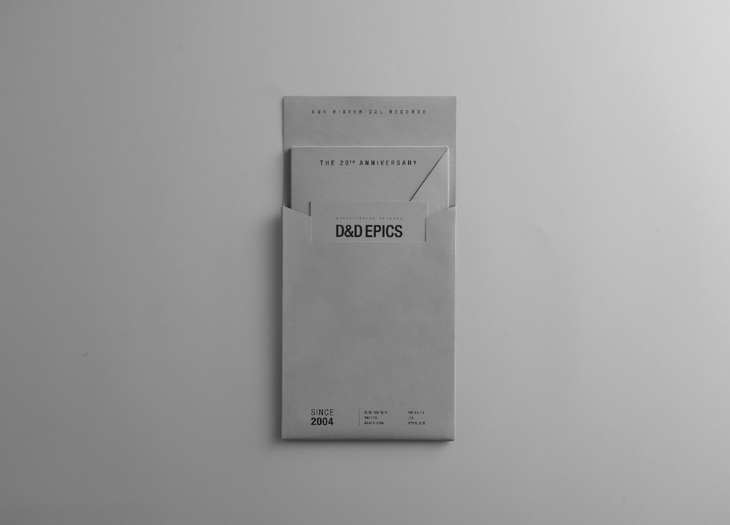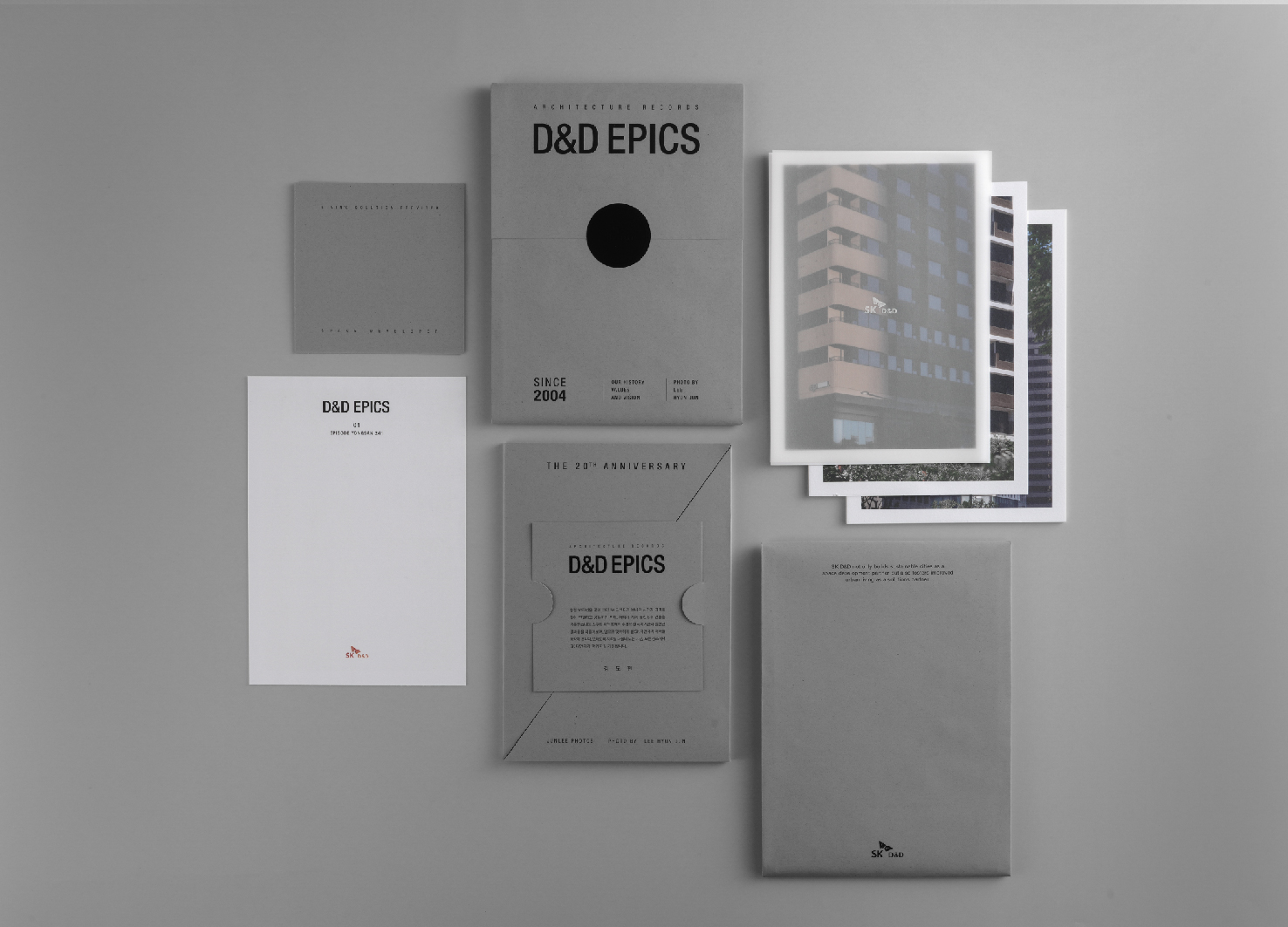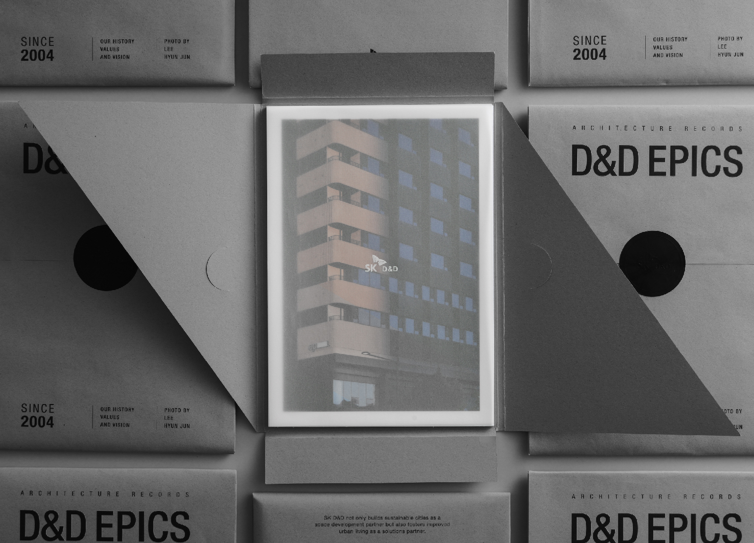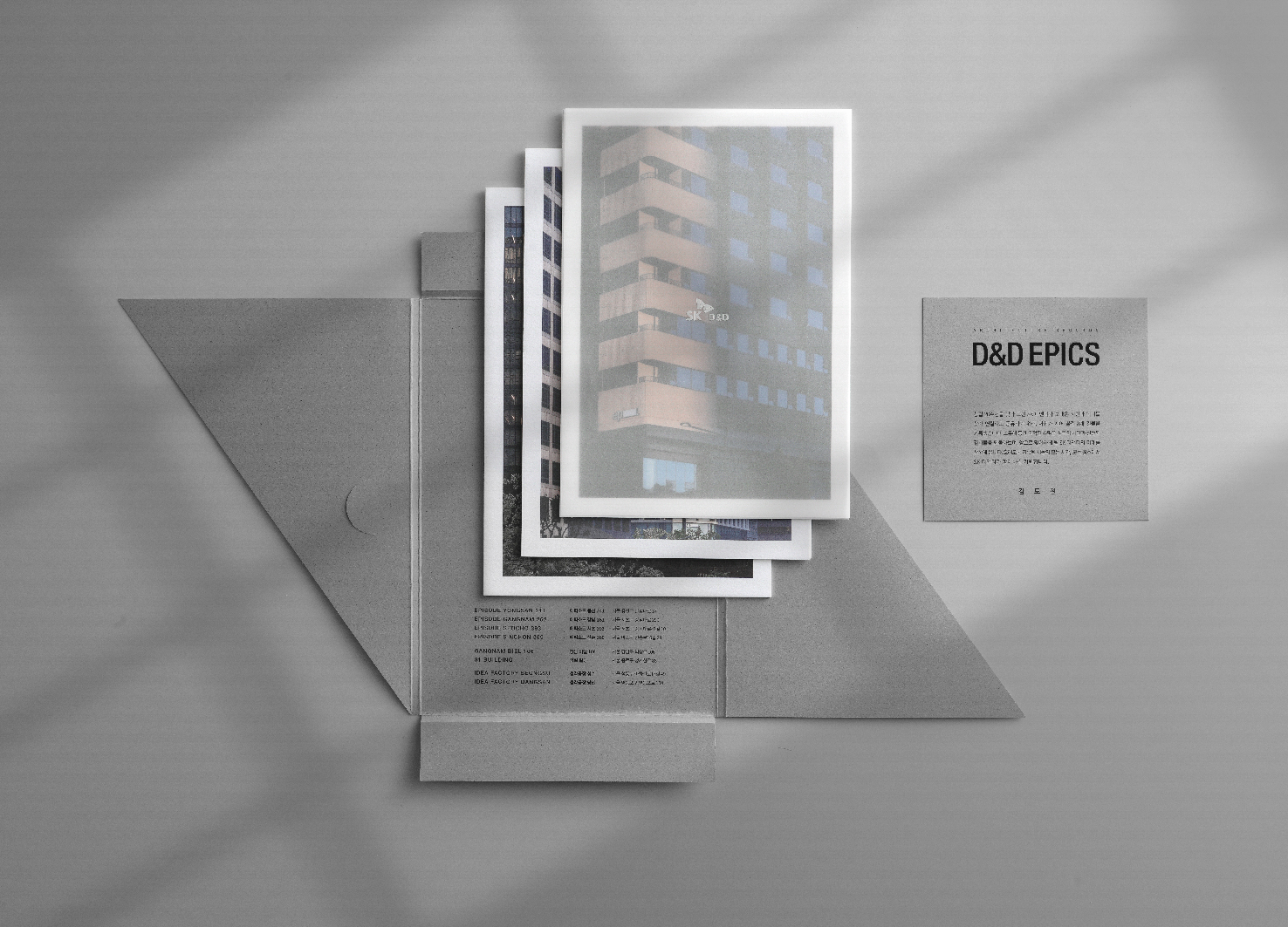 This project was created to celebrate SK D&D's 20th anniversary by documenting its buildings and achievements, sharing appreciation with stakeholders through postcard gifts. Inspired by "the accumulation of time and the story of buildings," the design symbolically captures SK D&D's journey through photos highlighting each building's significance. The package design reflects the brand's story and philosophy over 20 years, with a stepped experience, eco-friendly materials, and minimalist design, conveying sustainability and modern space suggestions.