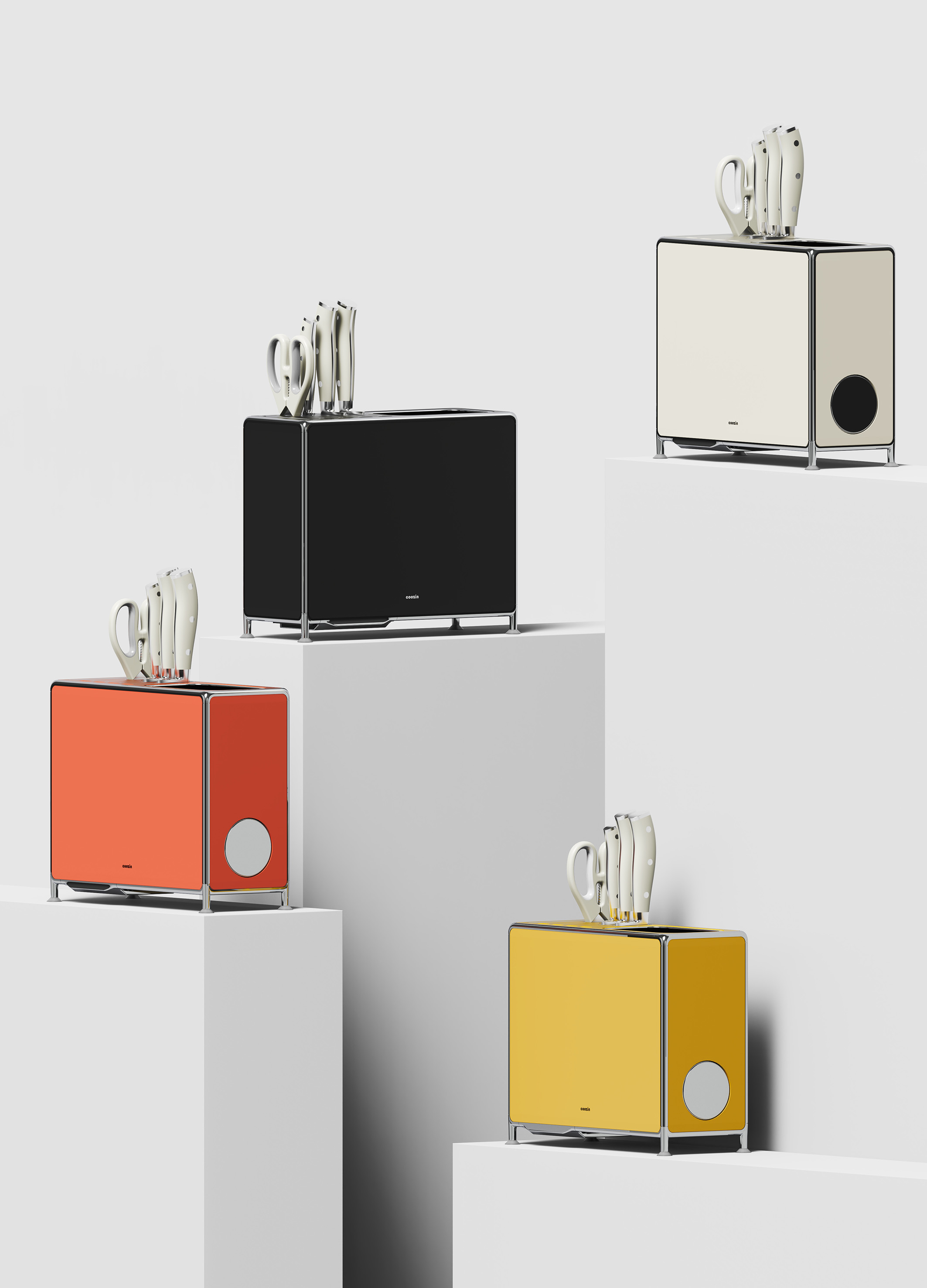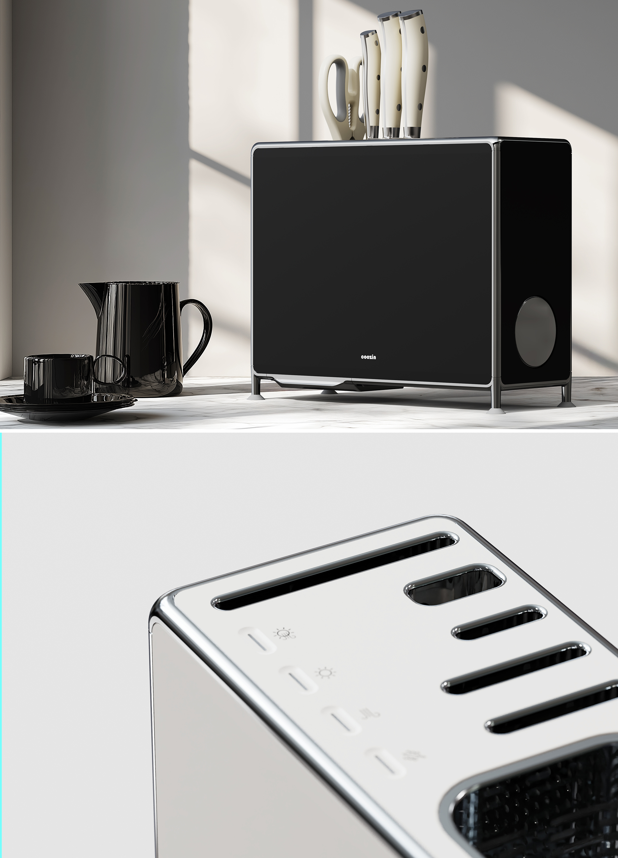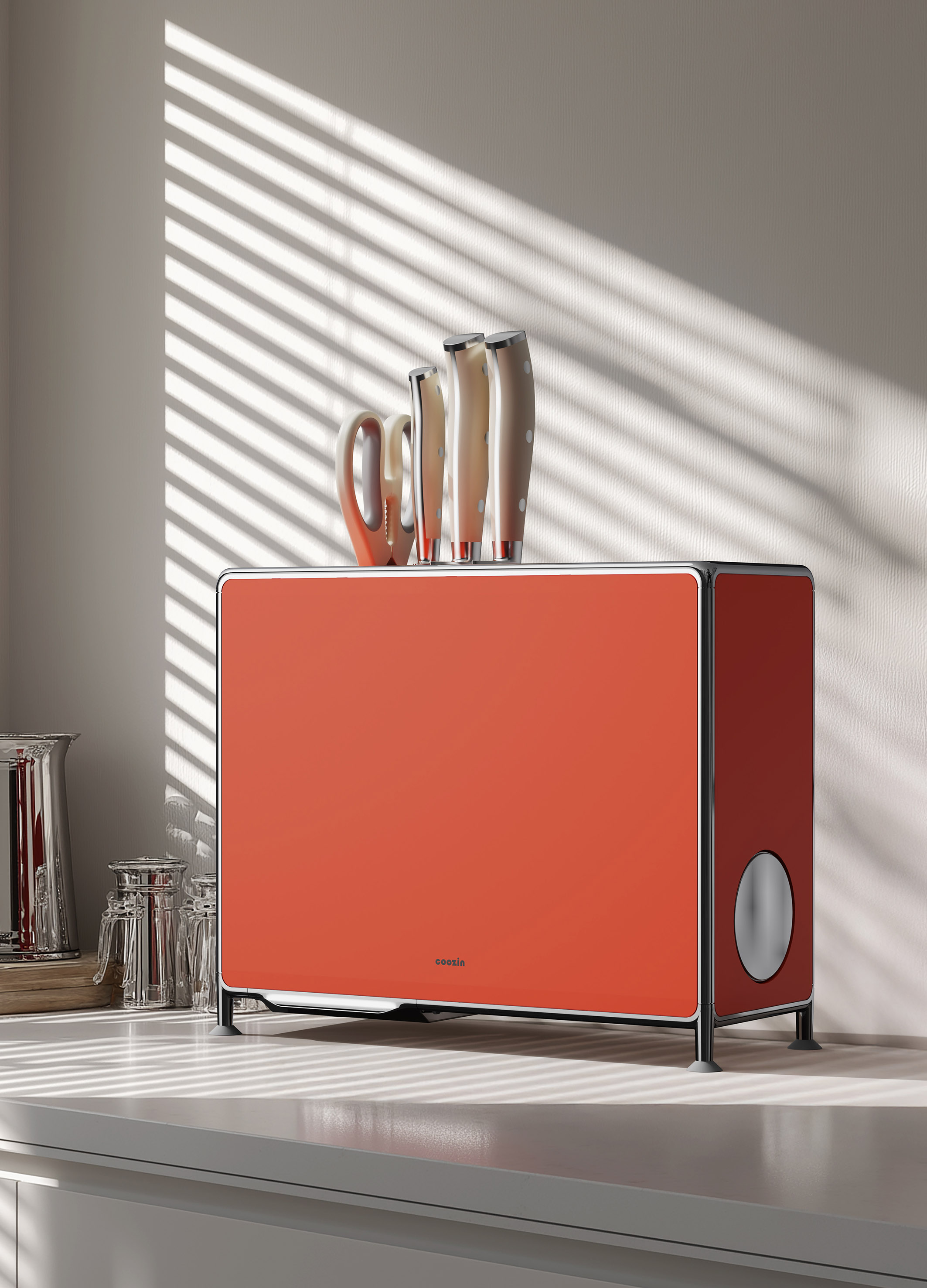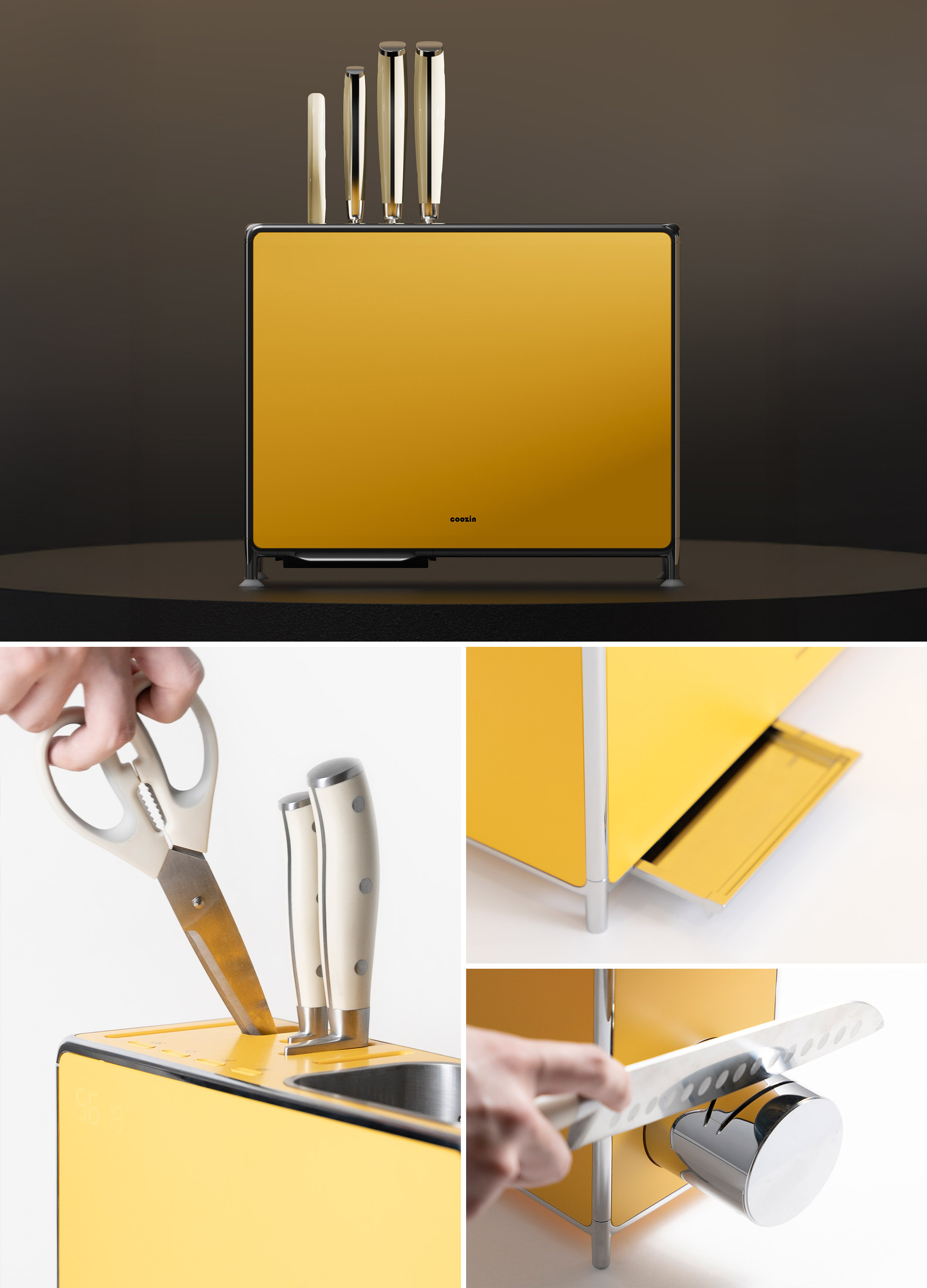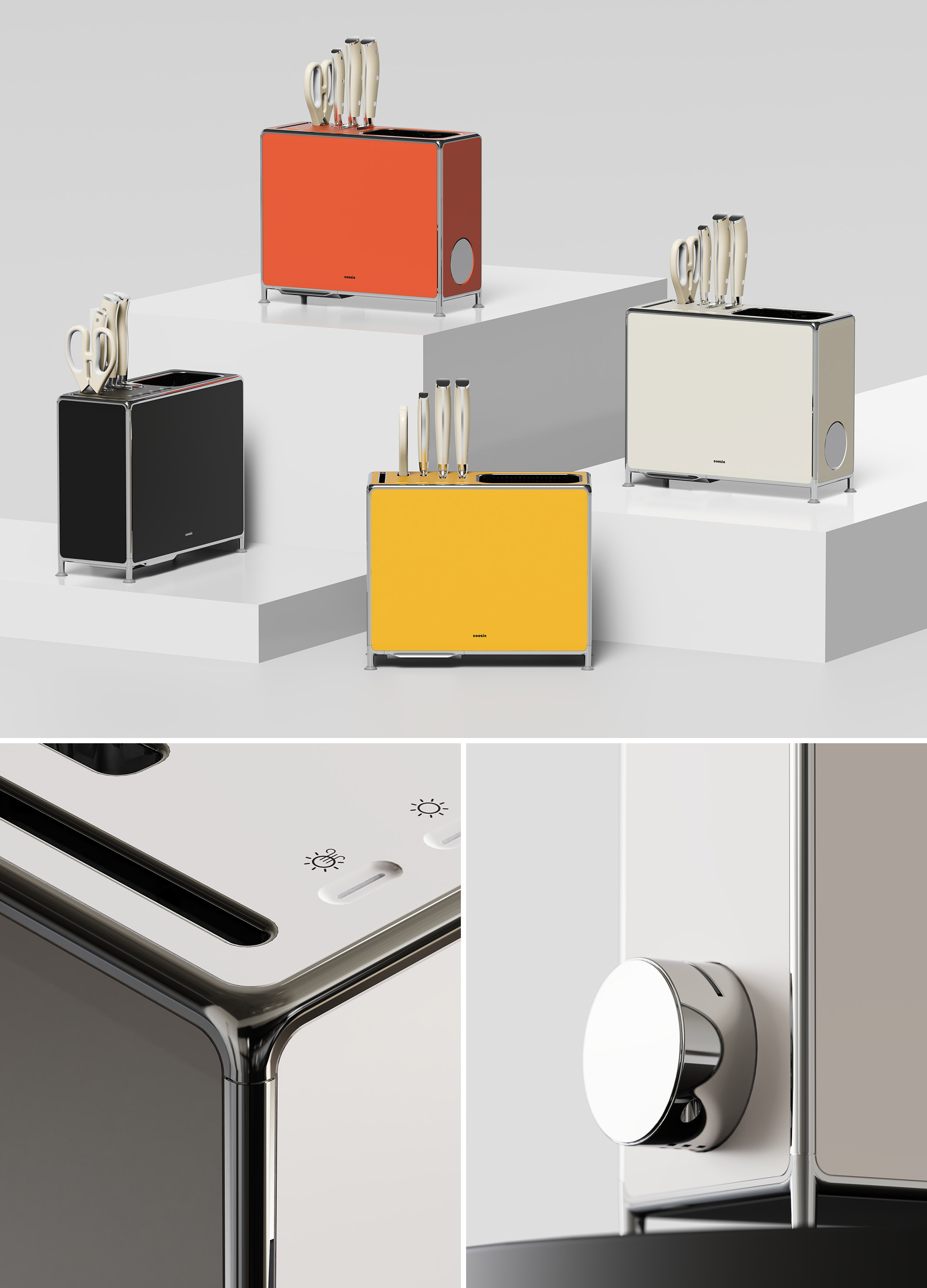 이 제품은 칼, 가위 등 주방 도구를 살균, 건조, 보관할 수 있으며, 수저, 젓가락, 포크 등 다양한 도구를 멀티케어 박스에 넣어 함께 관리할 수 있습니다. 전동식 칼갈이 부분이 자동으로 나와 칼을 간편하게 갈 수 있는 기능도 제공합니다. 내부에는 UV LED를 이용한 살균과 열풍 건조를 통해 습기를 제거하여 먼지, 세균, 바이러스를 완벽히 차단하고 안전하고 깨끗한 음식을 준비할 수 있도록 돕습니다. 디자인적으로는 단순한 박스 형태를 기본으로 하되, 각 테두리와 모서리를 연결하는 크롬 데코 라인을 더해 고급스러움을 강조했습니다. 하단에는 가구처럼 다리 형태를 부여하여 일반 가전제품이 아니라 하나의 가구를 연상시키는 세련된 느낌을 줍니다. 전면의 히든 LED 디스플레이는 사용하지 않을 때 꺼져 있어 깔끔하고 정돈된 디자인을 유지합니다. 또한, 타이머와 기능의 남은 시간을 표시하여 실용성을 더하며, 상단의 4개 버튼으로 직관적인 조작이 가능합니다. 내부 설계는 물기가 한쪽으로 흘러 물받이에 모이도록 되어 있어 유지관리가 편리합니다. 이 제품은 칼과 커트러리 등 입에 직접 닿는 모든 도구를 살균, 건조하여 더욱 안전한 음식을 제공하며, 가정뿐만 아니라 음식점에서도 활용할 수 있는 다목적 제품입니다.