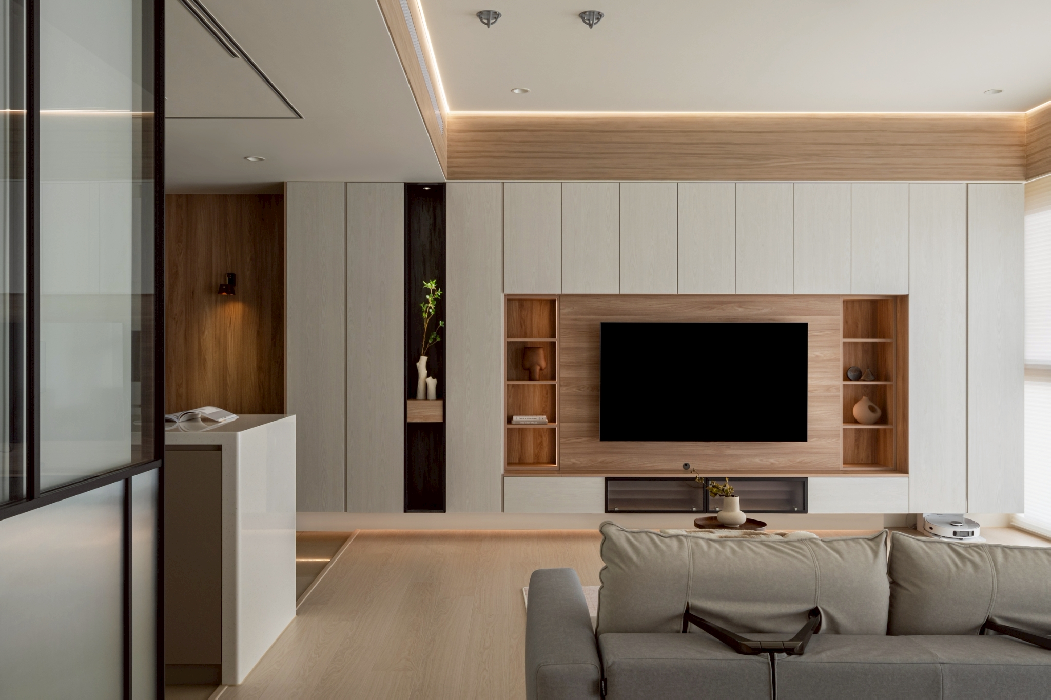 天花透過高低差、木紋與燈帶層次延展空間感,呼應立面設計語彙。色彩以白為基底,輔以淺木紋與黑色鐵件,營造清爽有節奏的感受。光線穿透窗簾,散落於空間各處,形成如「漫影」般柔和的光之詩,展現出秩序與情感並存的當代居所。