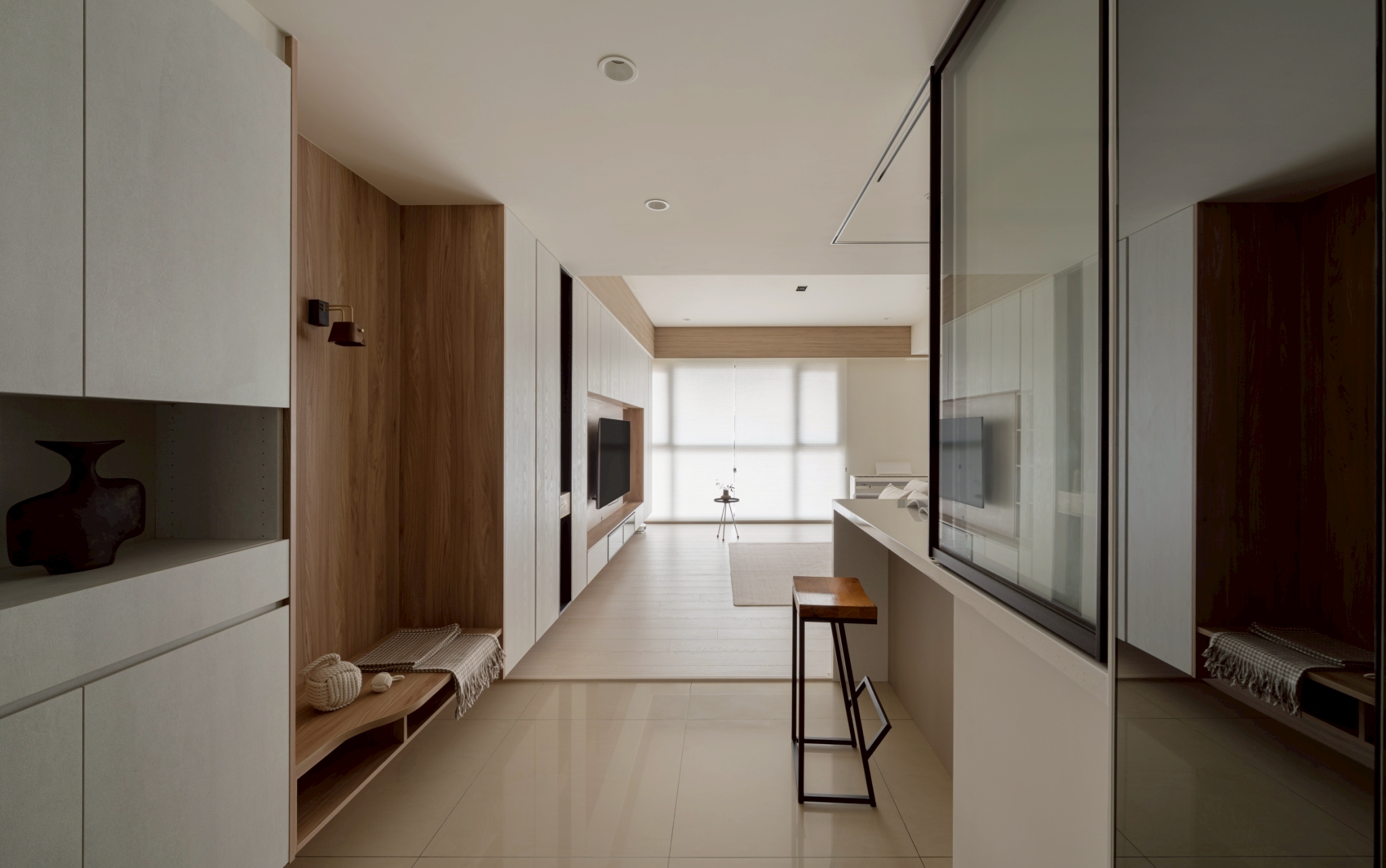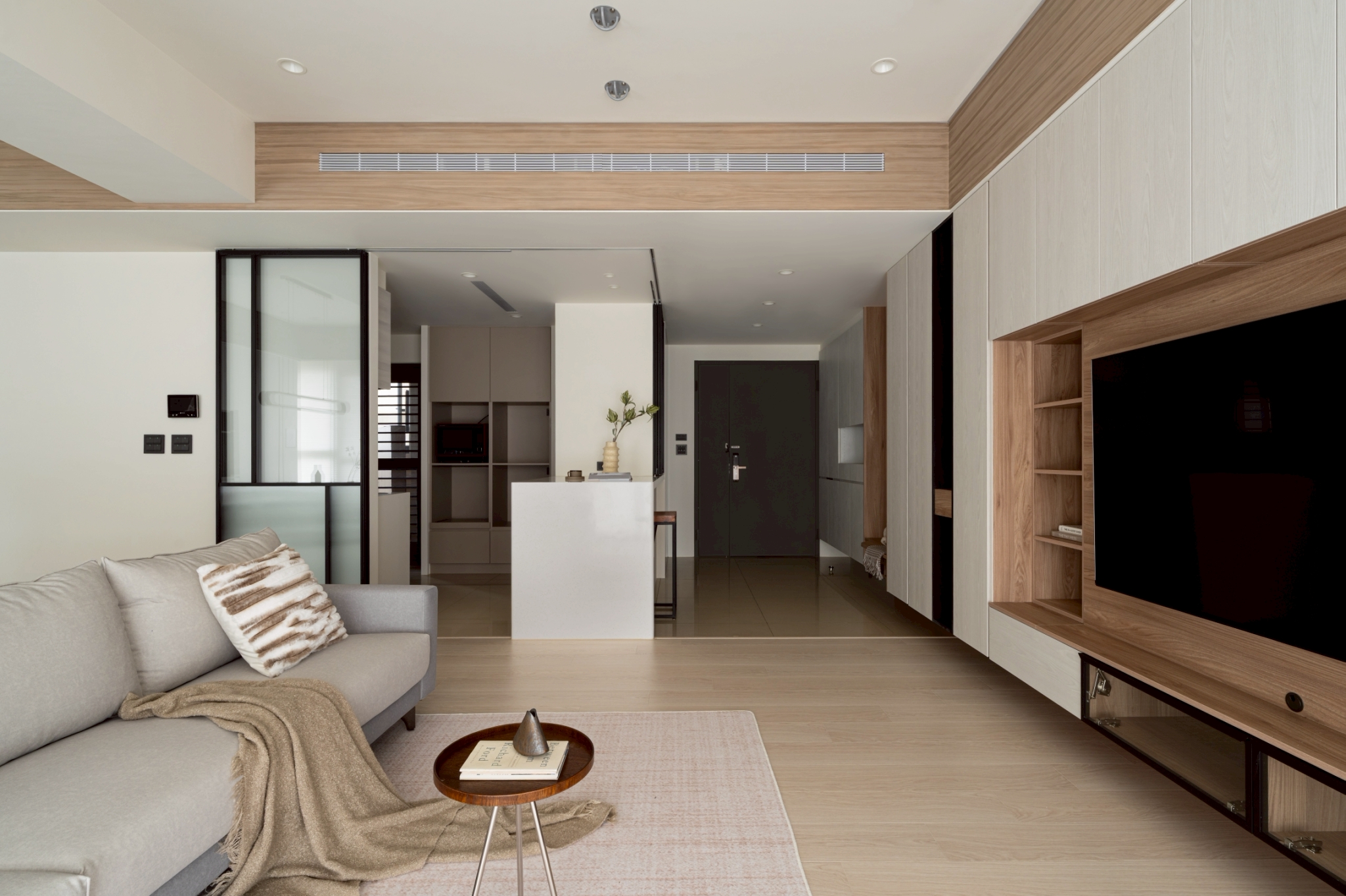 本案以「有秩序的包容」為設計主軸,重整屋齡十年的居住空間,讓格局、光線與動線之間達成平衡。設計著重於公共區域的開放與連結,透過滑門與推窗的靈活運用,串連玄關、餐廚與客廳,兼顧油煙阻隔與家人互動。