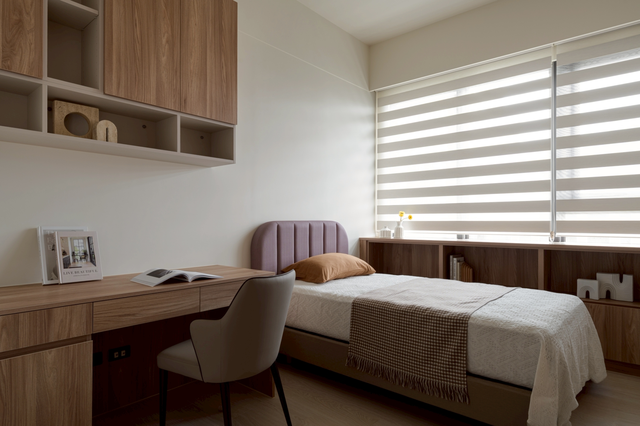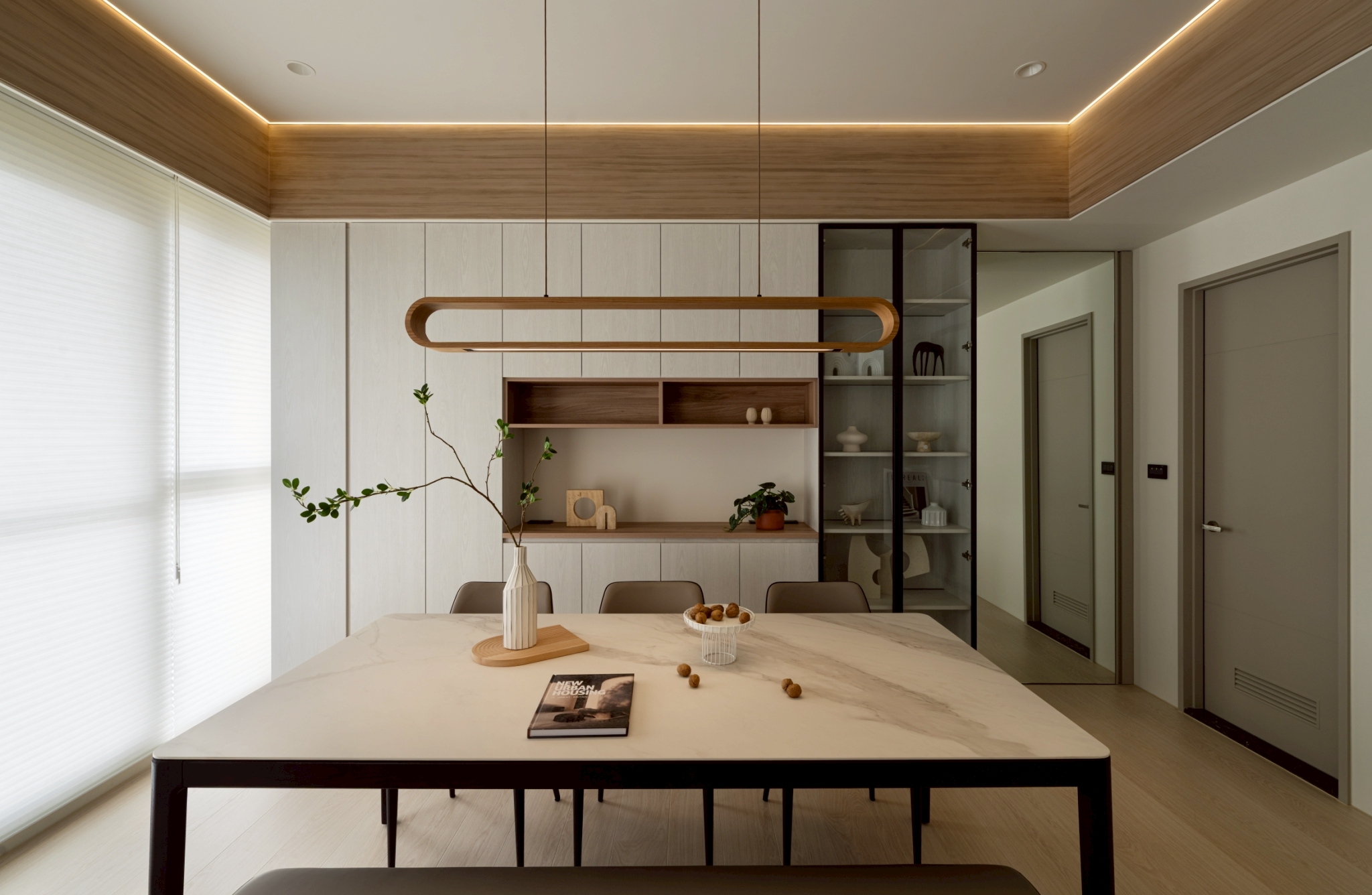沙發後方為餐廳,牆面收納整合開放展示與隱藏櫃體,兼具實用與美感;餐桌除了承載用餐功能,亦可作為孩子寫作業或家長伴讀的書桌使用,為家庭共享時光的重要場域。私領域則以簡潔為基調,保留完整機能並維持寧靜的休憩氛圍,使公私空間各自展現不同調性。