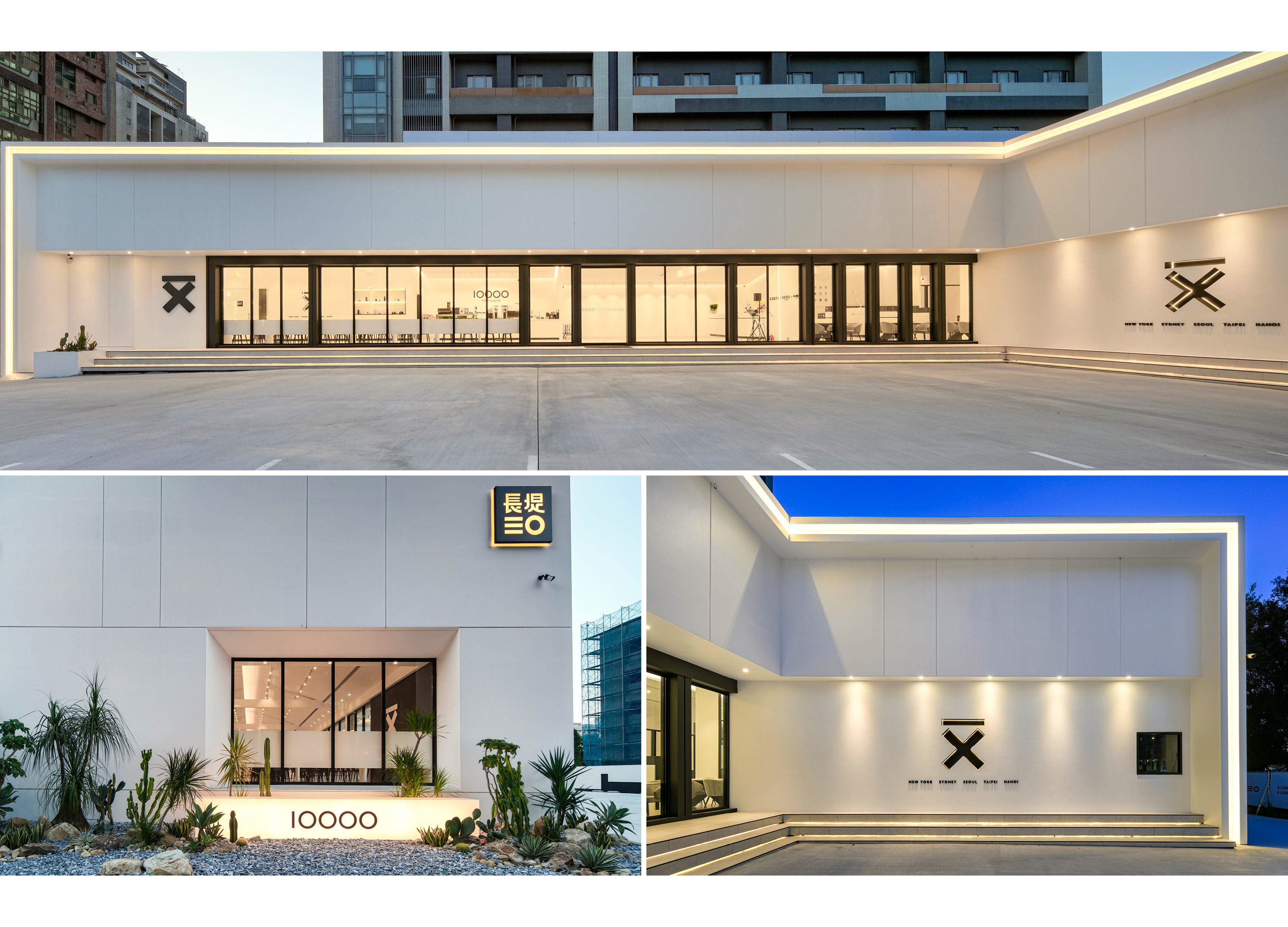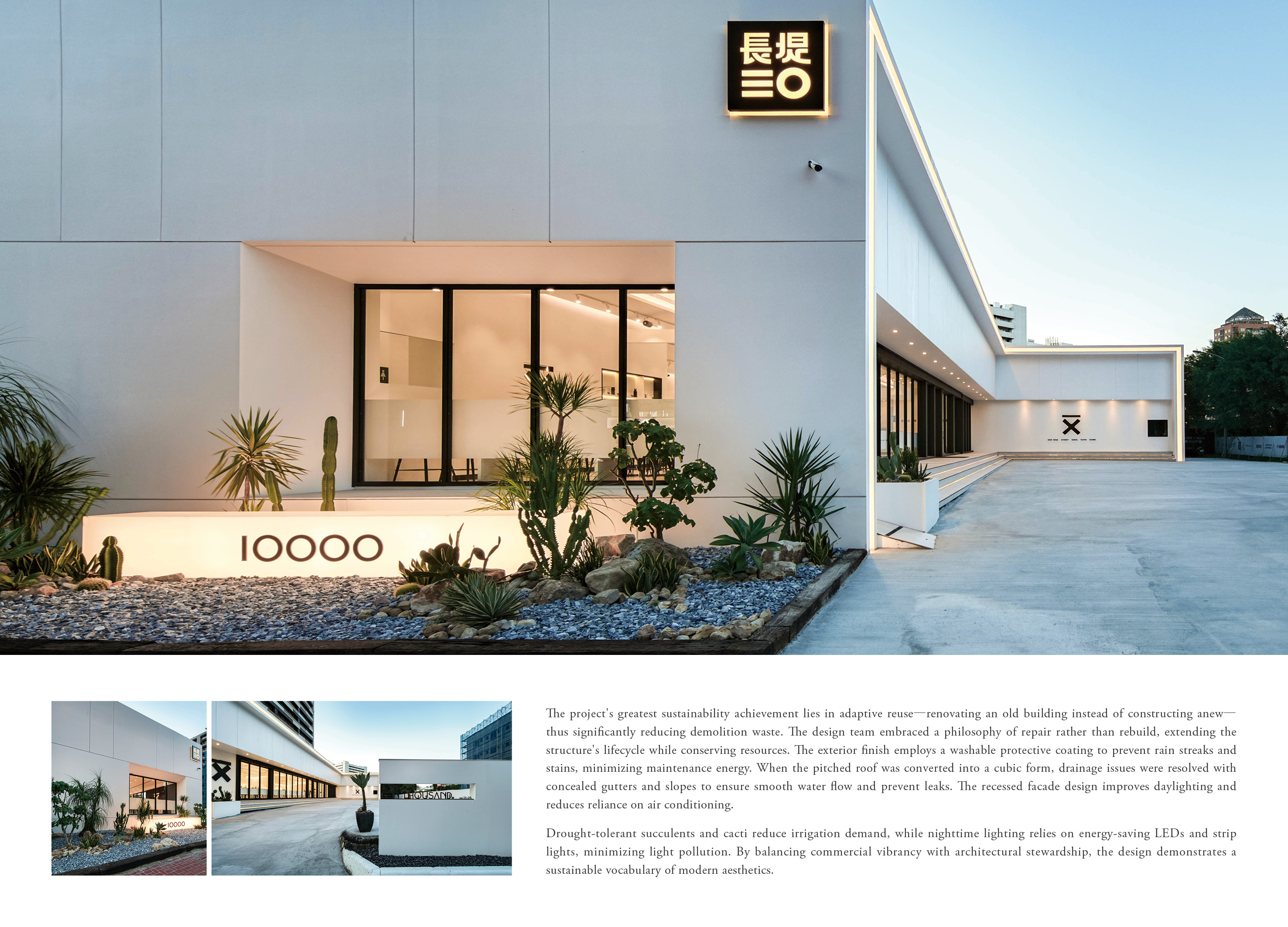 本案以老屋改建為基底,延續建築原有精神並注入全新生命。外觀保留斜屋頂結構,經重新構築後轉化為俐落的方盒子造型,以簡潔幾何語彙詮釋當代風格。外層增設環繞燈帶框架,夜幕低垂時散發柔和光暈,整棟建築如同矗立街角的「城市燈籠」,在靜謐中散發溫暖與活力。室內空間保留斜屋頂的原始高度,避免壓迫感的同時,也讓木構架得以完整呈現,結合自然材質的溫潤質地,形塑出輕盈而具有呼吸感的氛圍。座位規劃上,設置長形吧檯桌與雙人座位,因應不同使用情境,使用者可在變化的光影中感受盒形量體與自然採光的互動。咖啡吧檯則依品牌標準精準設計,動線嚴謹配置POS機、冰櫃、製冰機與咖啡機位置,確保操作順暢與視覺整潔,呈現專業與美感兼具的工作場域。戶外區域以灌木、多肉植物與仙人掌構築景觀,呼應品牌象徵意象,夜間燈光灑落於綠意之中,形成猶如沙漠綠洲般的光影畫面,成為行人目光的焦點與城市中一處令人駐足的溫暖據點。