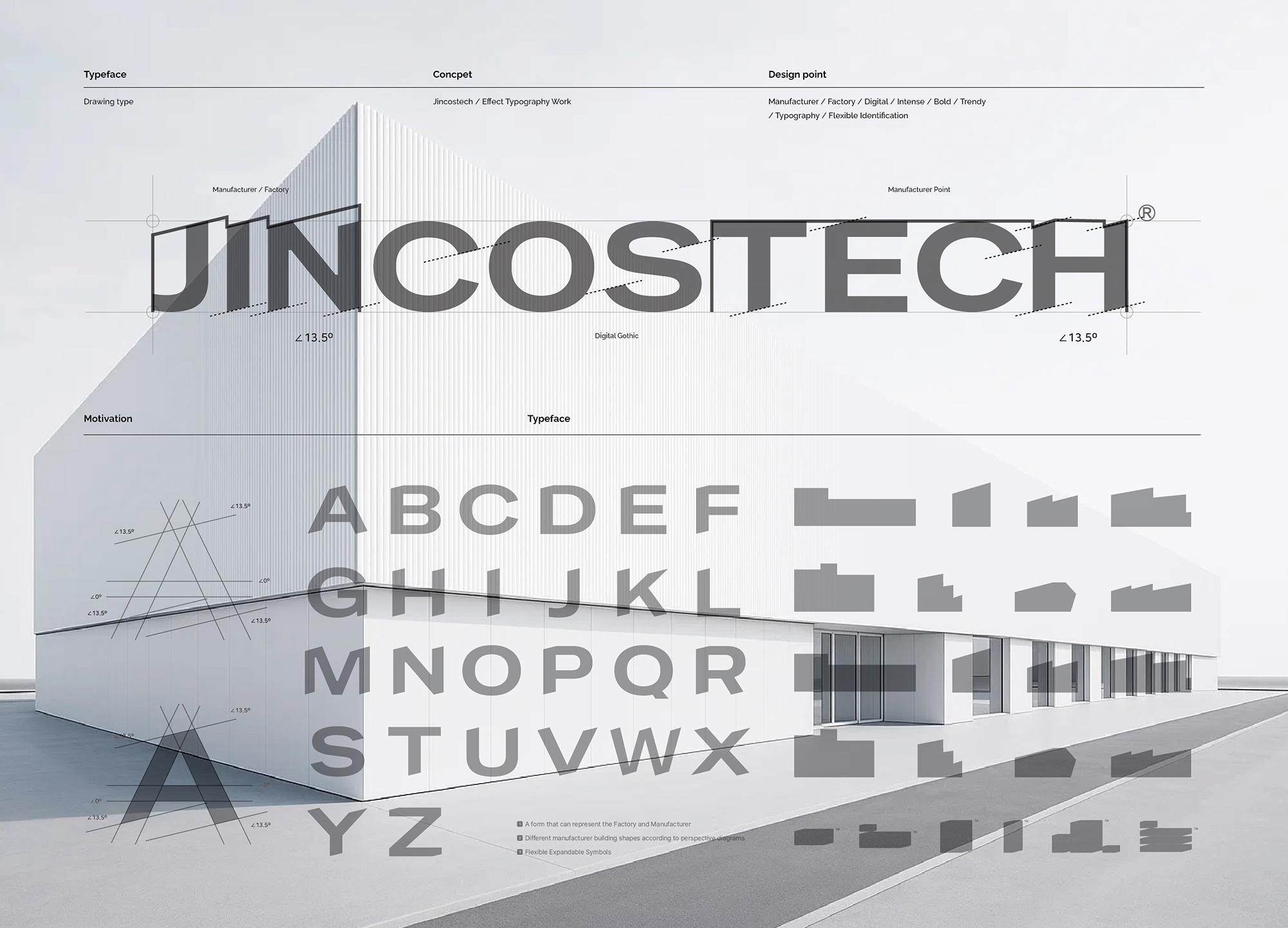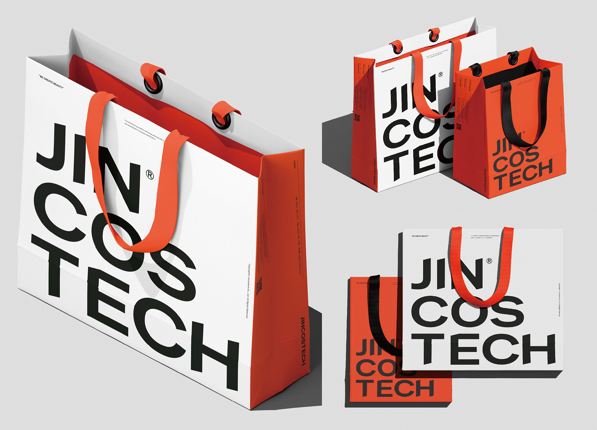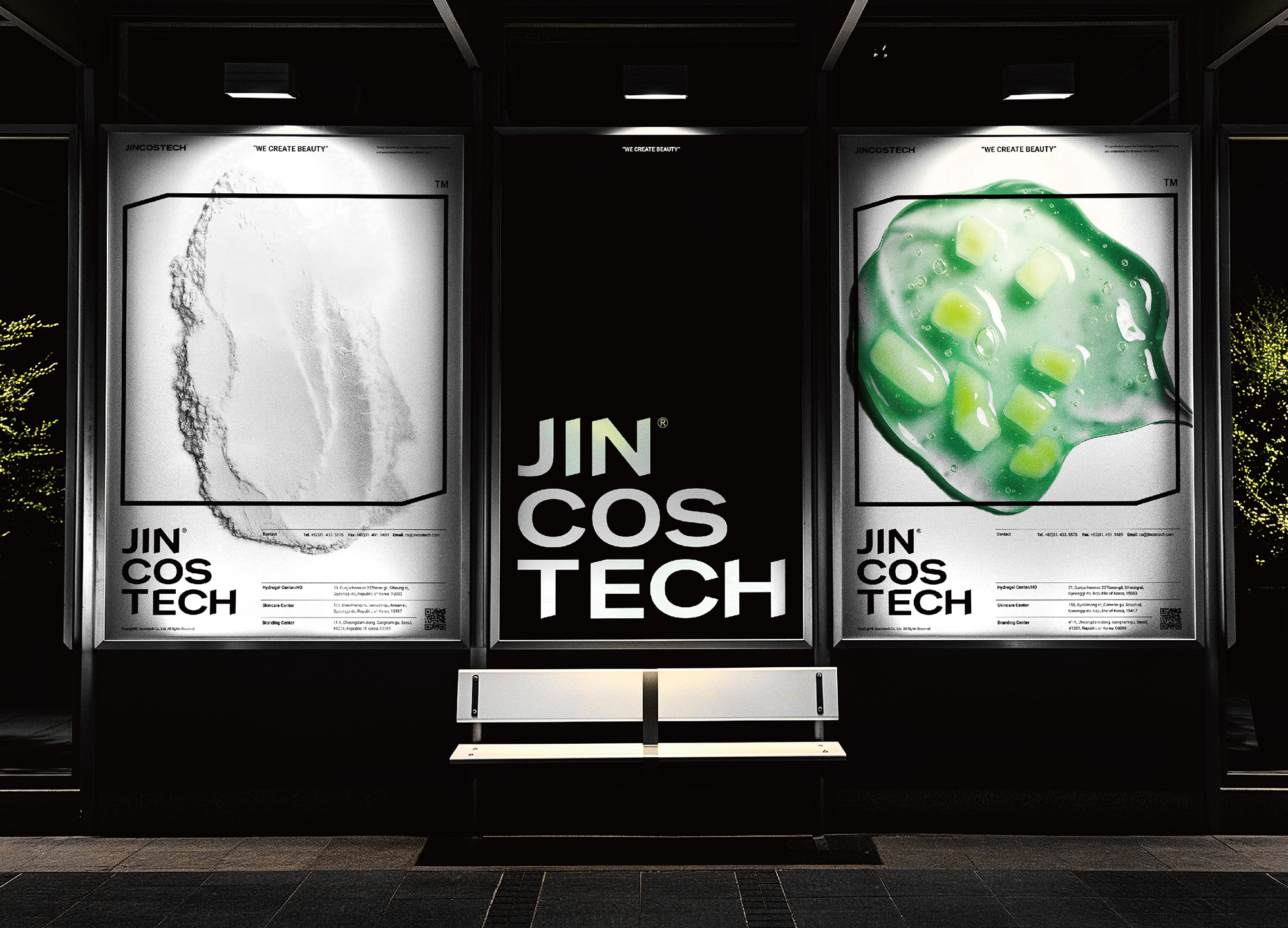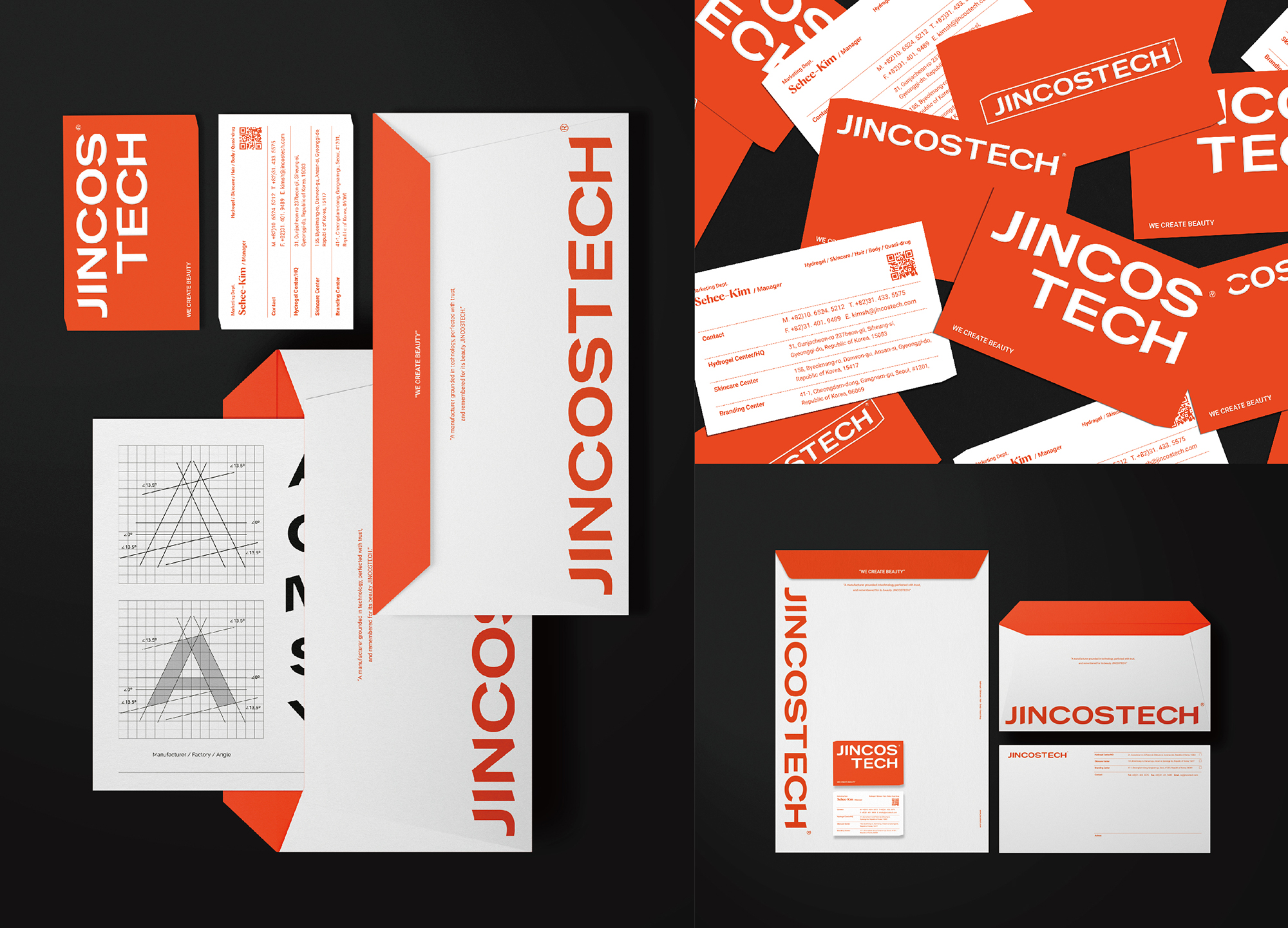JINCOSTECH is a leading hydrogel manufacturer supplying skincare and quasi-drug formulations to Korea’s top beauty brands. The rebranding redefined the manufacturer’s role by revealing the beauty of production itself. Inspired by factory architecture, the logotype was built as a “factory-type font,” each letter reflecting industrial rhythm and precision. A flexible identity system expands like modular factories, while the vivid orange palette conveys science, vitality, and trust. Visuals using hydrogel textures and formula patterns replaced models, presenting Korea’s advanced cosmetic manufacturing with minimal and refined aesthetics.