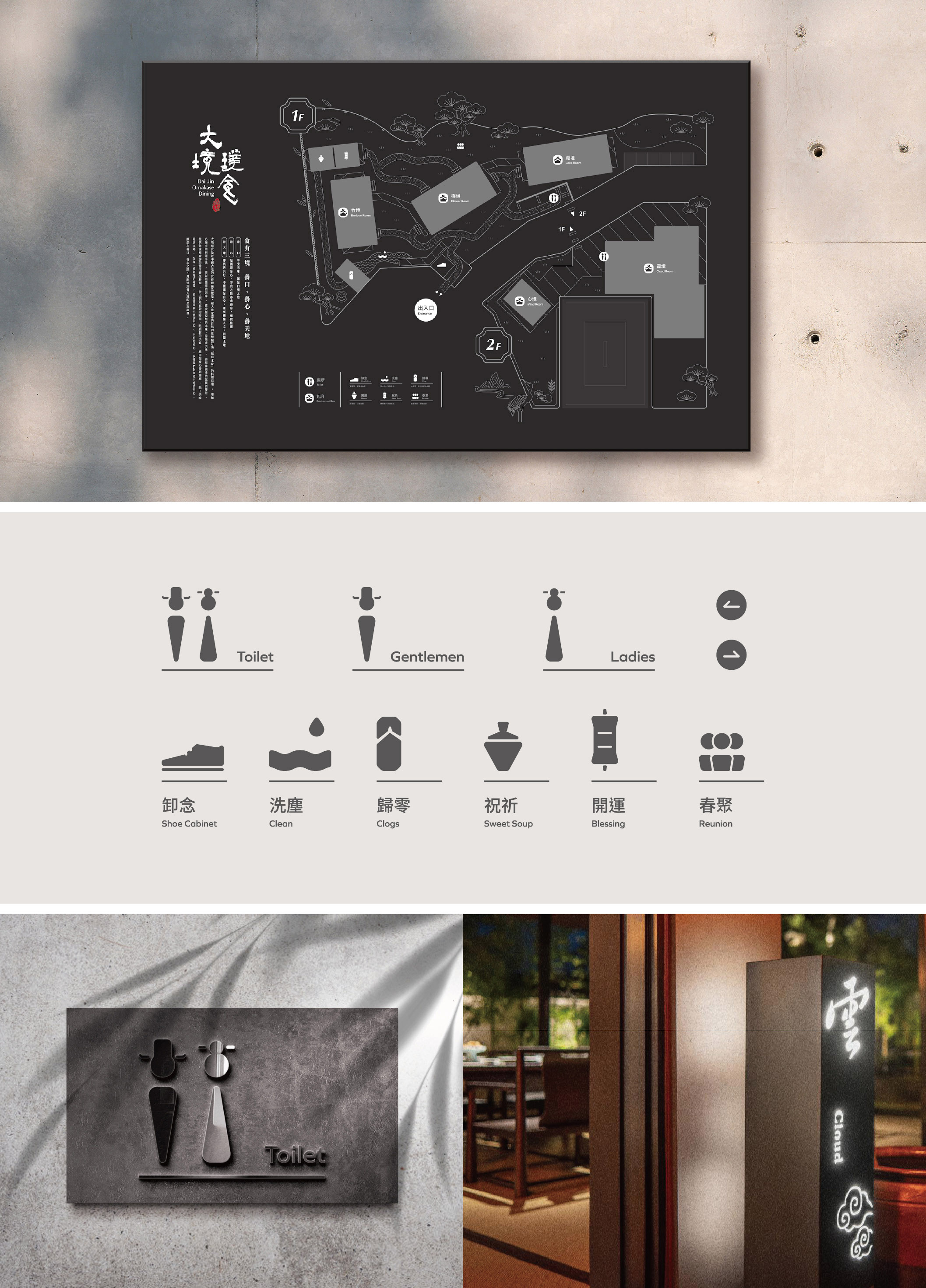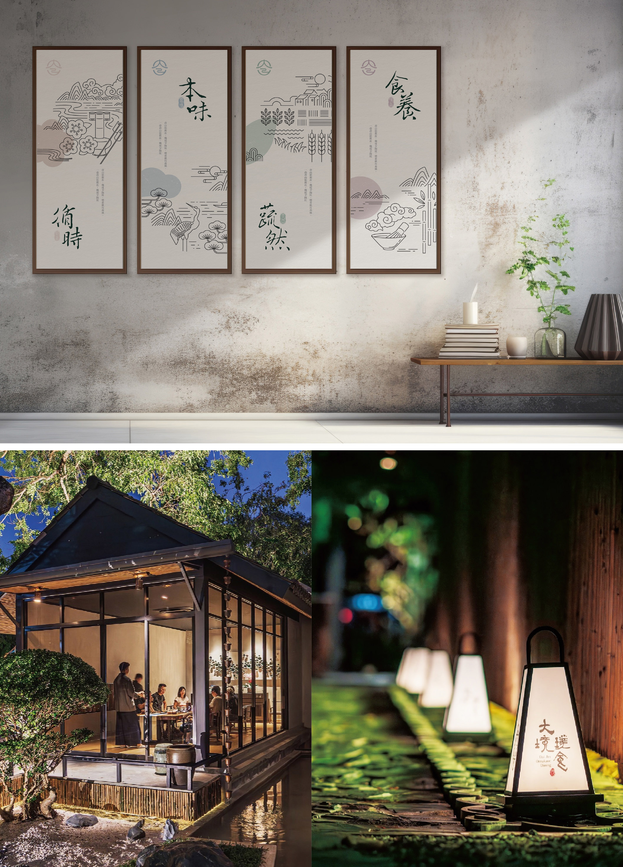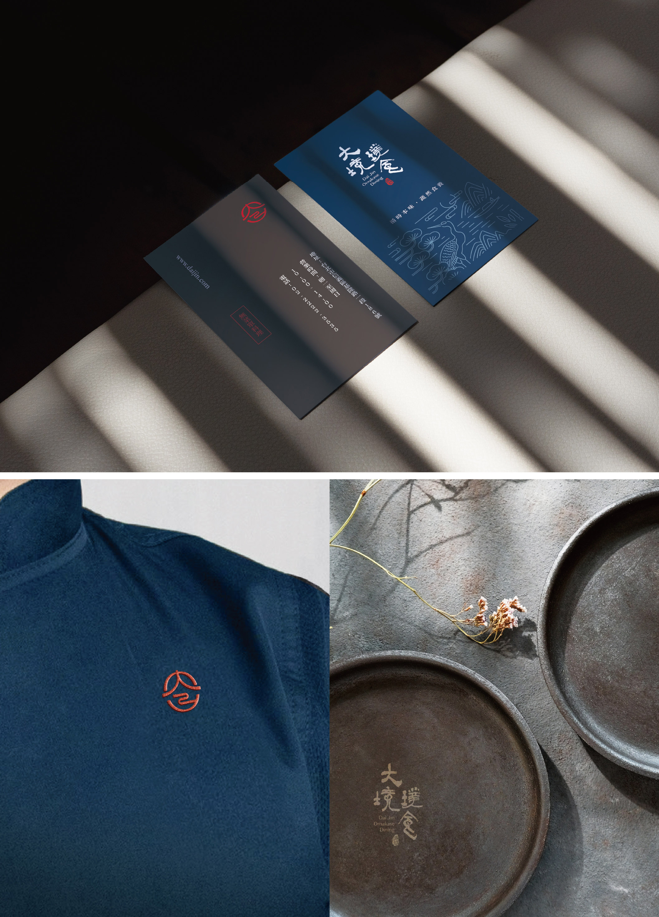 標準字體以楷書結構融入篆體精神,適度留白,強化品牌的東方韻味,同時兼顧現代閱讀性。色彩策略選用緋紅與黛藍,分別代表生命力與靜謐,營造動靜平衡的情感層次。整體風格圍繞「身心重置」展開,從入口足浴儀式、四時更迭的蔬食套餐,到結尾的祝祈小籤,透過空間、體驗與視覺語言的整合,構築一段由外而內、由感官至心靈的沉靜旅程。從策略定位到視覺語言,大境璞食始終圍繞自然與人文的核心,展現東方精神在當代設計語境下的精緻轉譯,形塑出蔬食文化的新典範。