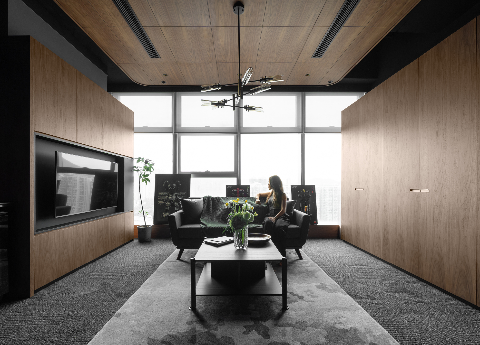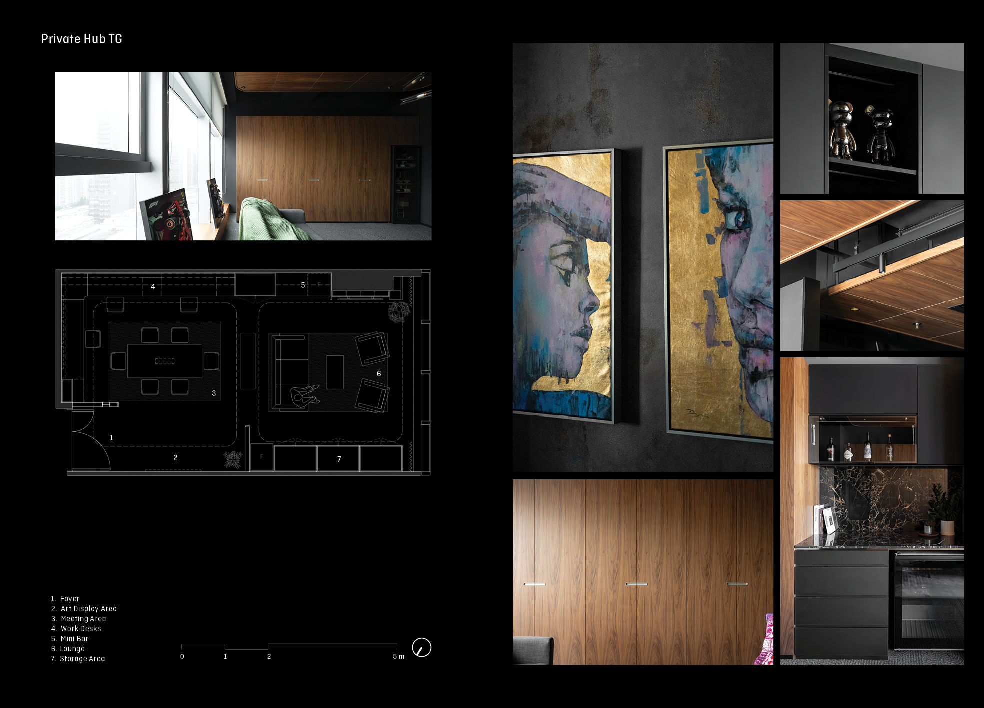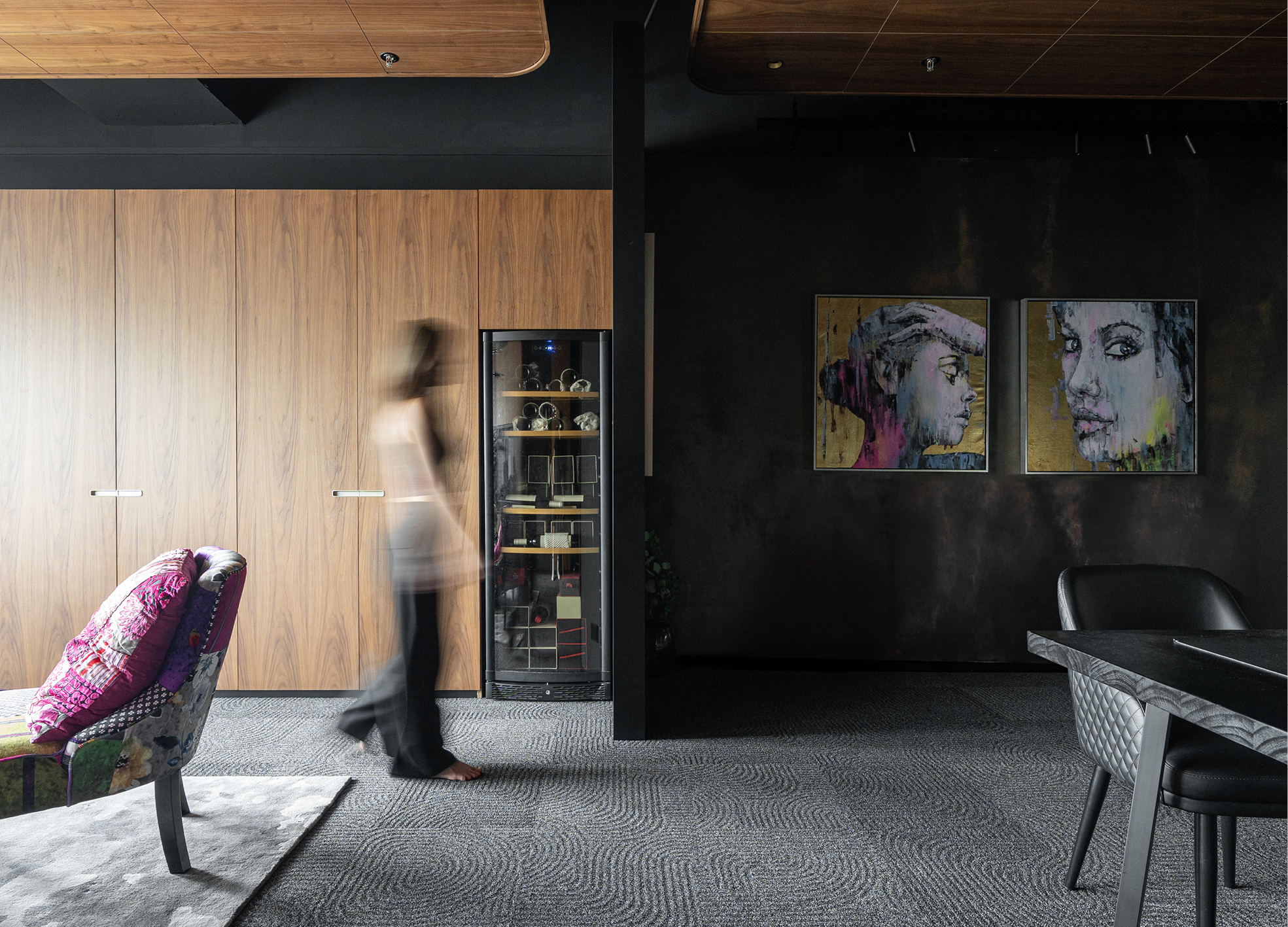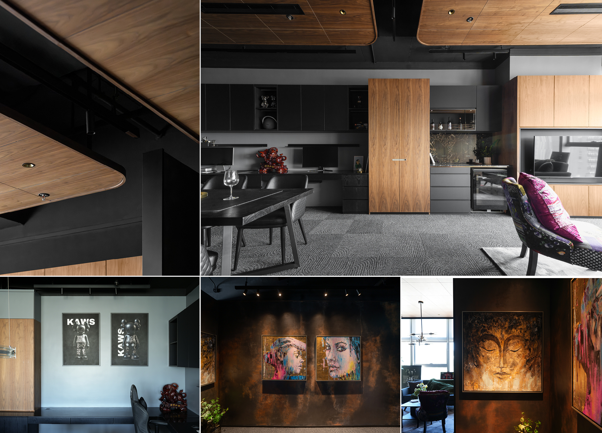Beyond its function as an office, the space becomes a canvas for individuality and thought. Each material — dark walnut, muted grey, and rustic plaster — is chosen to evoke composure and warmth. A feature wall of artistic texture anchors the small interior, while timber ceilings introduce rhythm and depth. The layout flows fluidly between work, lounge, and art display, expressing the nuanced character of the client. Compact yet layered, the design balances professionalism and personality — a quiet reflection of creativity and composure in equal measure.