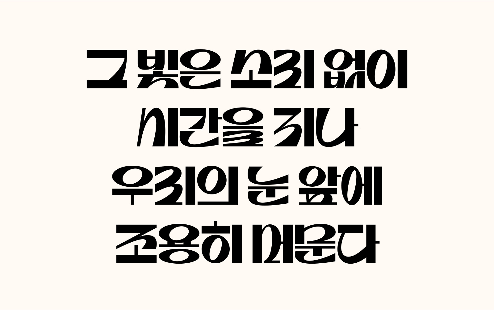 특히 ㄹ·ㅌ·ㅈ 등 핵심 자소에 적용된 유려한 곡선 구조와 위치에 따라 변화하는 자소 형태는 문장에 생동감을 더합니다. 강한 획 대비와 독창적 프로포션을 통해 브랜드 타이틀이나 슬로건 등 시각적 임팩트가 필요한 곳에서 고유한 존재감을 드러내며, 텍스트를 넘어 그래픽 오브제처럼 활용될 수 있다는 점이 가장 큰 차별성입니다. 서체의 표현 가능성을 확장한 이번 작업이 강렬한 메시지를 구축하는 데 영감이 되길 기대합니다.