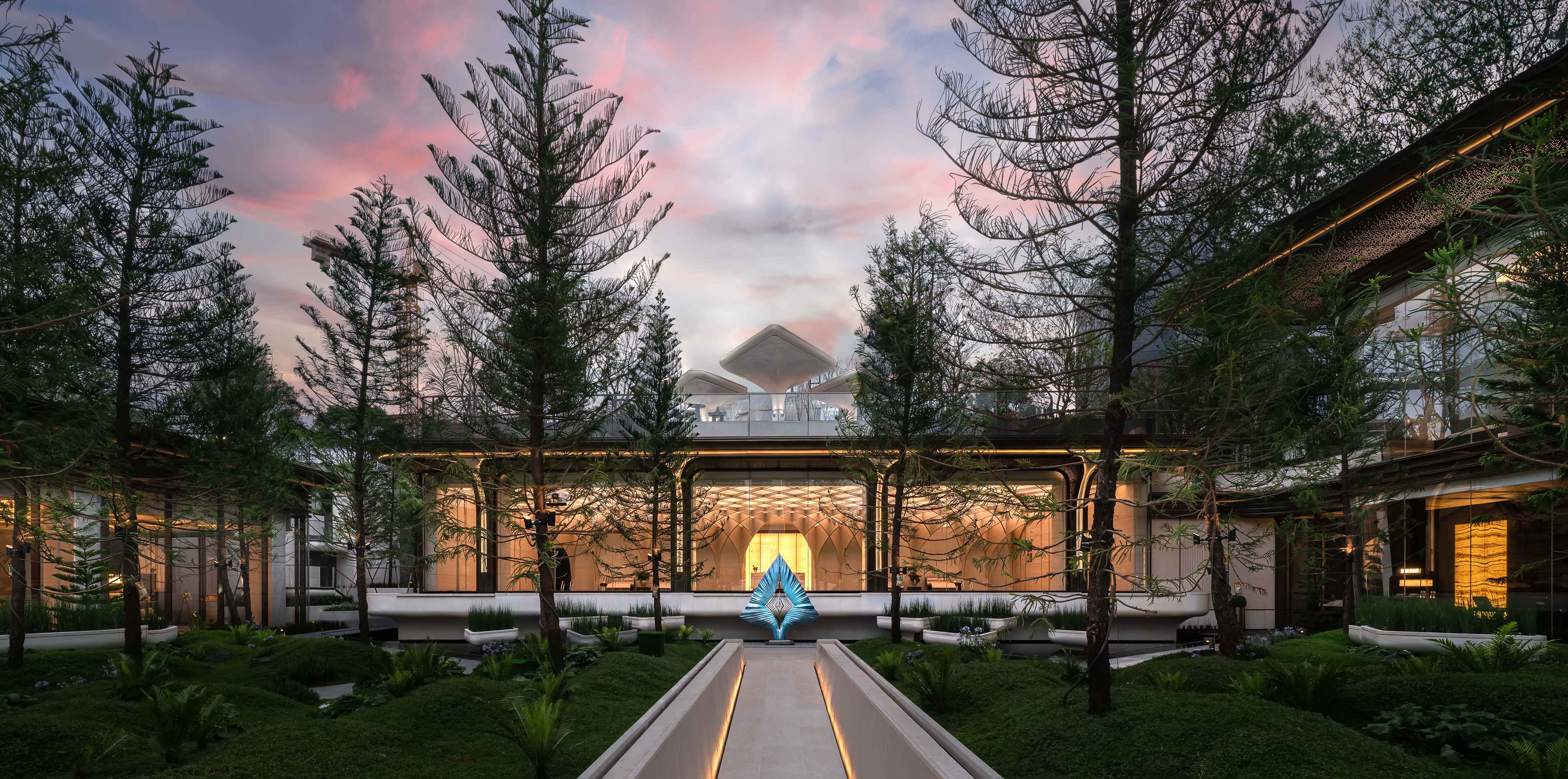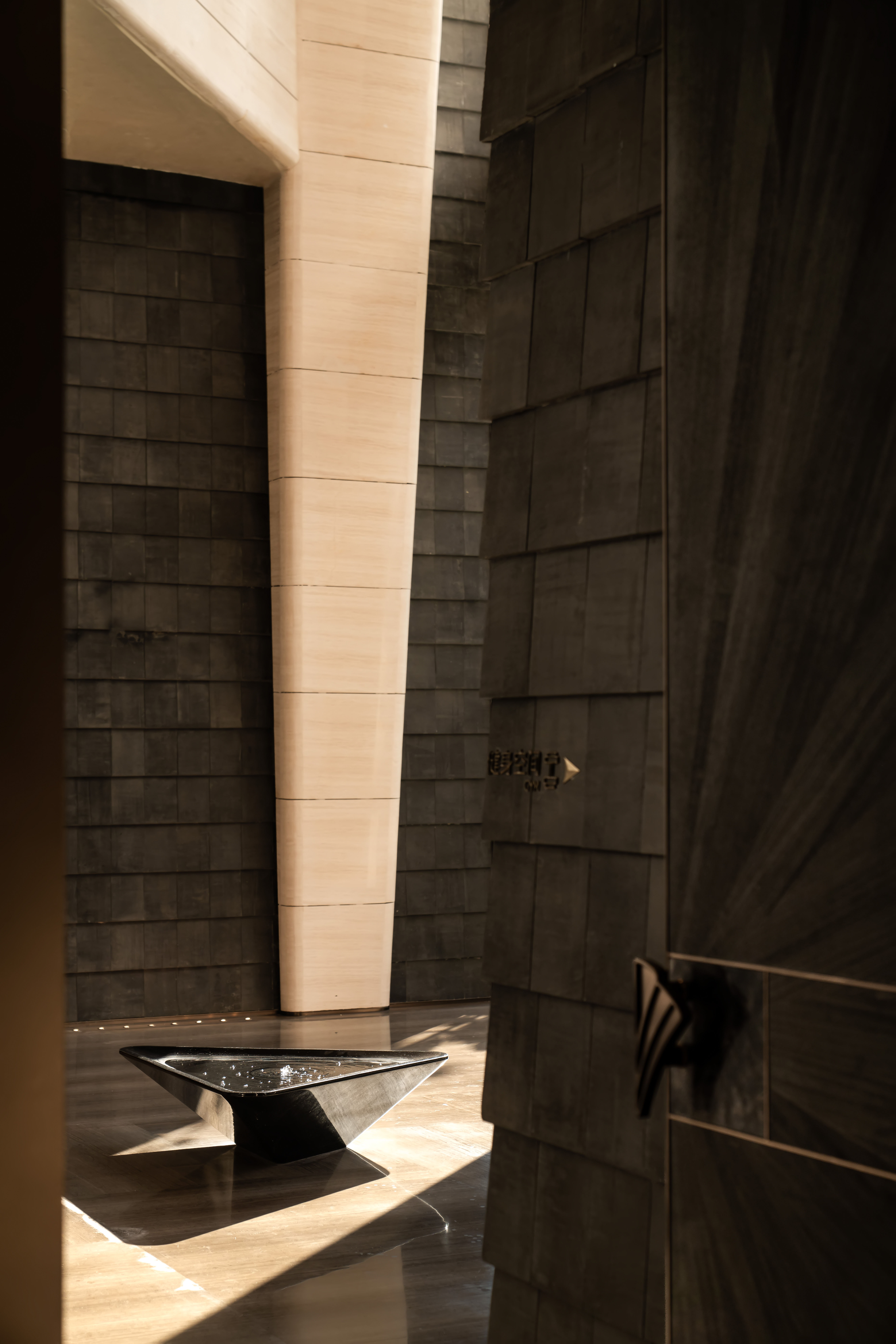 庭院核心伫立着一座以钻石为骨的立体景观——棱角分明的轮廓牵引着脚步探寻,内部光锥与其外形达成空间共鸣。当光线漫过锋的切面,素白墙面便成了光的幕布,漫溢出火焰般的辉光。此刻,自然的风骨、艺术的巧思与流动的光,在此凝结成一颗璀璨的精神结晶。 凿孔洞以问天光,筑重墙以界明暗,用几何凝固不可量度的静谧;它承载着形式的意志、空间的对话与时间的无声诗篇。精神空间内设计师将几何线条裁光为诗,立柱阵列围合出静谧场域,似与贝聿铭的多哈伊斯兰博物馆遥递精神的辉映;挑高穹顶引落天光,以竖向延展神性,更向斯卡帕的光影哲思低语永恒。 一方凝练时间与自然的艺术装置,不仅是空间的视觉焦点,更是一场关于东方禅意与现代极致的对话。水波倒影天顶光痕,自成「以水为镜」的隐喻;光斑跃动于石面,恰似「以光为笔」绘就的瞬息艺术。 近乎无饰的克制中,唯见天光最流动,光在此非照明,而是信仰,人造几何与天光自然于此相生,将古滇云水魂,凝作现代归心圣殿。