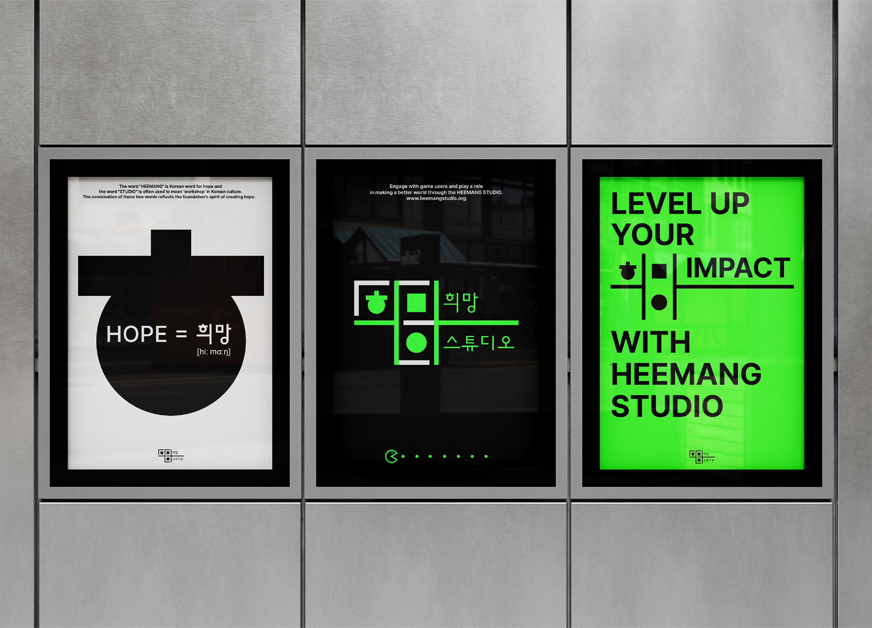 우리는 플랫폼의 ‘공간성’과 게임의 ‘재미’를 시각적으로 표현하기 위해 한글의 고유한 조합 방식, 즉 자음과 모음을 결합하여 배열하는 특징을 활용하였습니다. 이를 통해 웹사이트 및 앱에서 나타나는 아이콘, 조작 방식, 그래픽 요소들을 일관된 방식으로 제작하였습니다. 단순한 기하학적 단위를 통해 다양한 용도에 맞게 변형이 가능하면서도 시각적 아이덴티티의 일관성을 유지합니다. 이와 같은 접근은 현대적인 디자인 감성을 반영하며, 콘텐츠에 대한 직관적인 해석과 사용자 상호작용을 용이하게 합니다. 미니멀한 구조는 디지털과 인쇄 매체 모두에서 효과적이고 인지도가 높아, 전반적인 사용자 경험을 향상시킵니다.