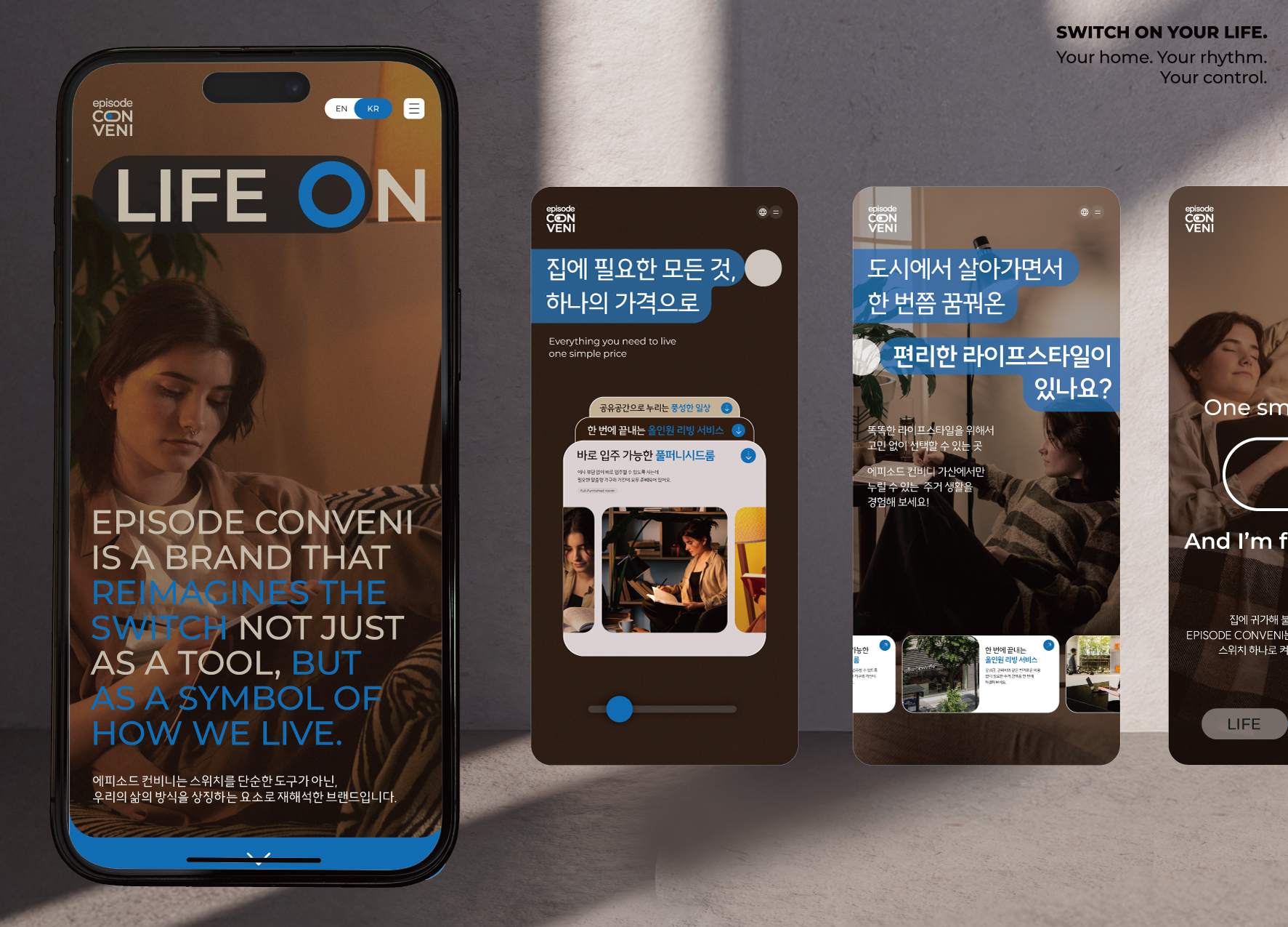 Through simplified contracts, real-time environmental control, and on-demand services, we define a new residential philosophy: keep the essentials, discard the rest. Our visual identity reflects this through the "Switch" motif—a symbolic tool that allows residents to actively tune and command their own lives.