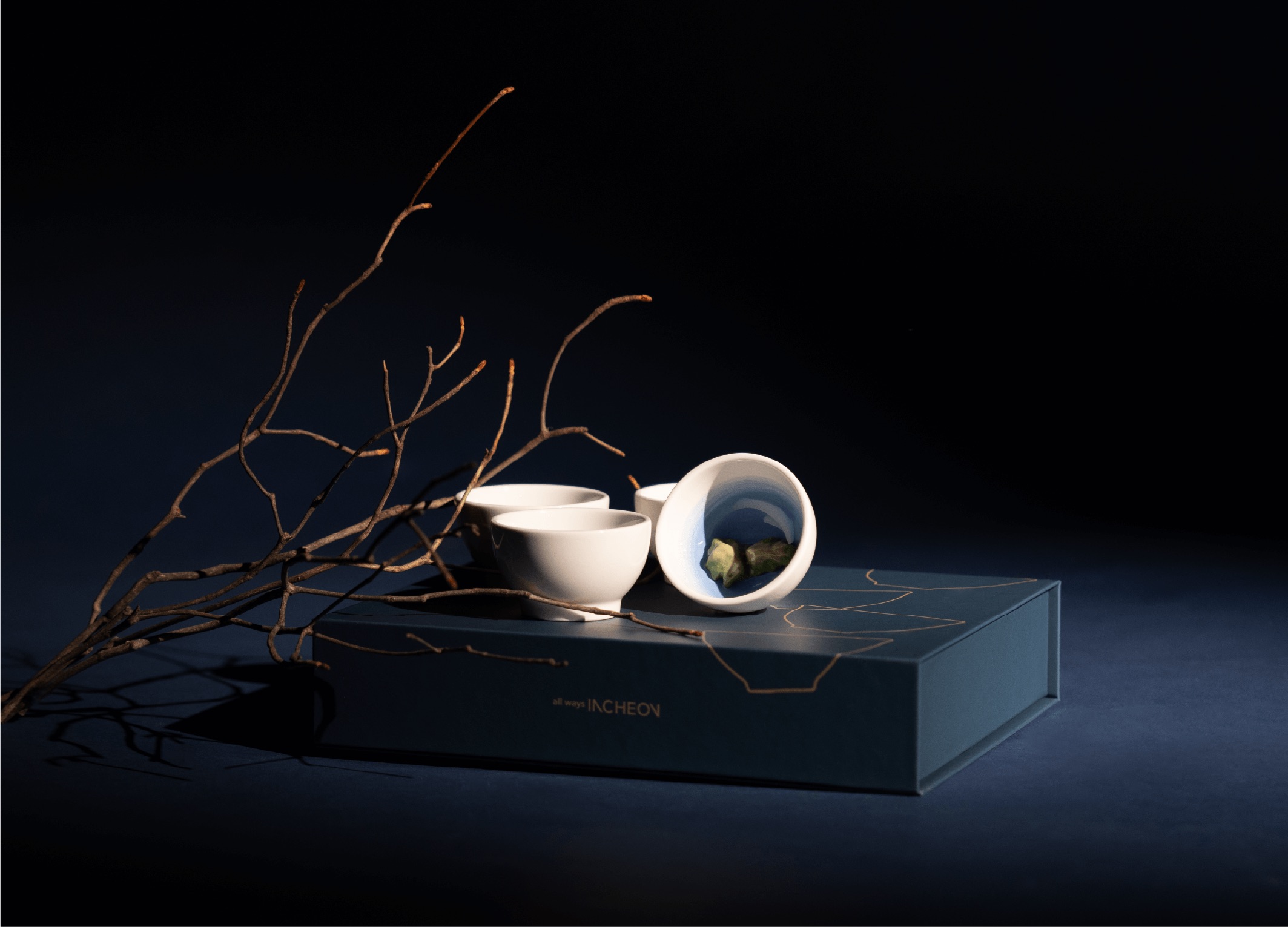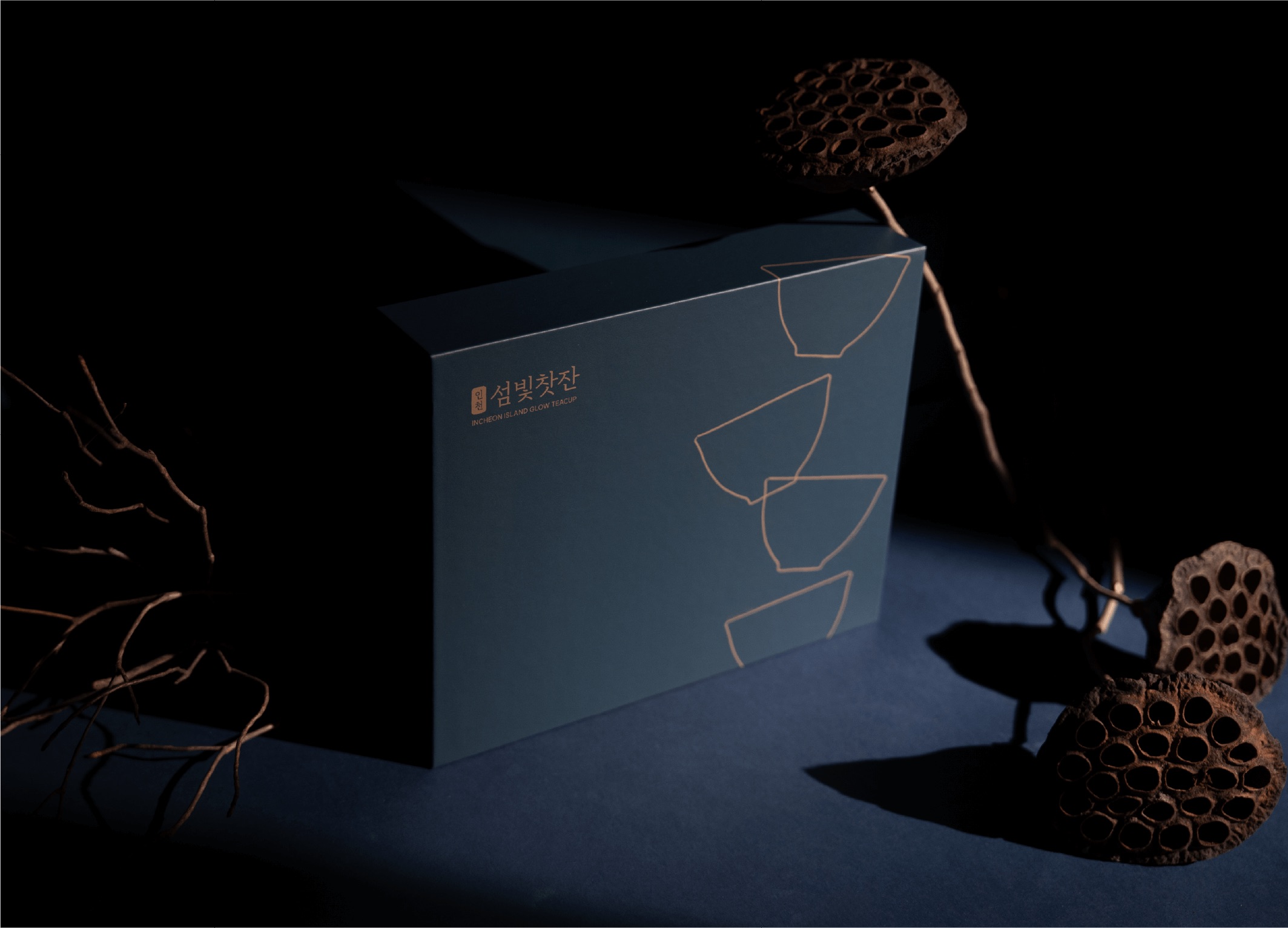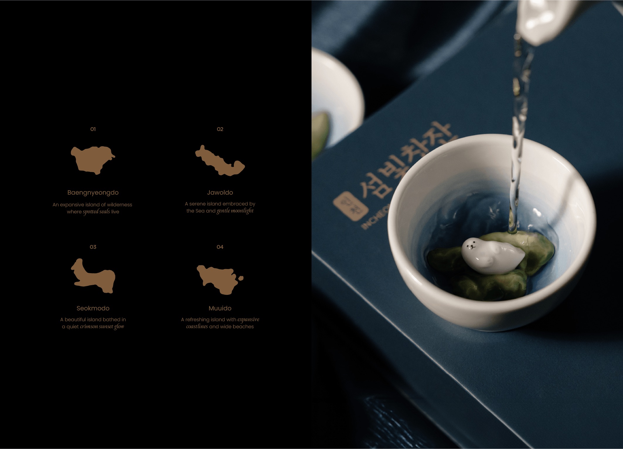 Island Light Teacup is a ceramic teacup package inspired by the quiet beauty of the sea and islands. The main graphic features four vertically layered teacup silhouettes, each representing an island. Their organically tilted angles recall the motion of waves, adding a gentle rhythm, while the vertical flow subtly evokes the act of pouring tea. A deep blue-green palette and restrained gold accents express the depth and stillness of the sea. Within the teacups, four islands of the Incheon sea are depicted, centered on Baengnyeongdo, home to the spotted seal. With Island Light Teacup, take a quiet moment for your own tea ritual.