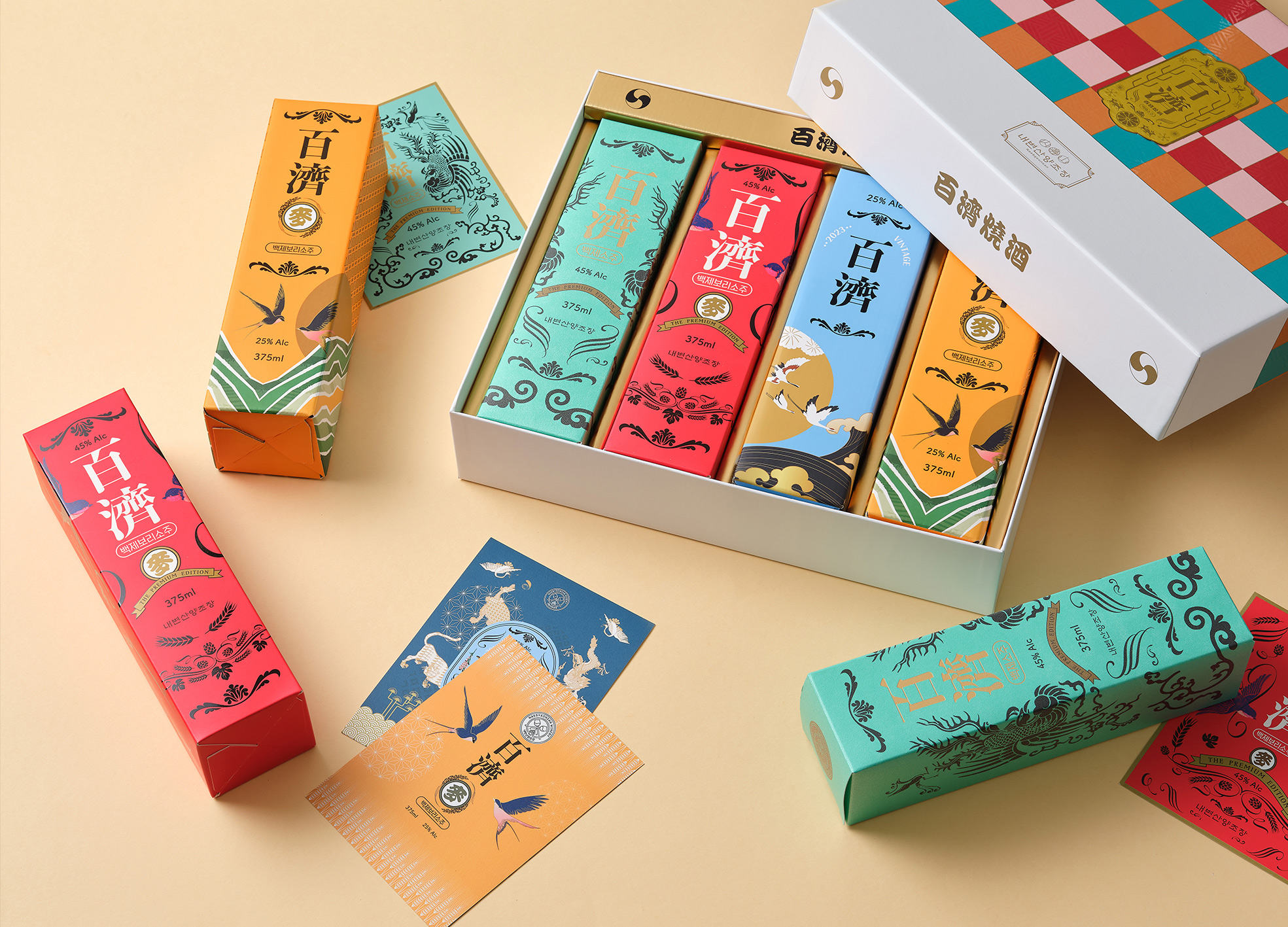 내변산양조장의 백제소주는 백제 왕조의 유산을 현대적 감성으로 재해석한 프리미엄 세트 패키지와 고급 라인으로 새롭게 선보입니다. 25도에서 45도까지 다양한 도수의 제품들로 구성된 이 시리즈는 백제 시대 의복과 유물에서 영감을 받은 패턴을 디자인에 적용하여 깊은 역사적 품격을 시각적으로 전달합니다. 단순한 주류 이상의 가치, 즉 문화적 연결과 시대적 이야기를 담아내는 것을 목표로 했습니다. 프리미엄 라인 디자인은 마치 왕이 하사한 귀한 선물을 받는 듯한 특별한 감성을 불러일으키며 제품을 여는 순간부터 소비자에게 잊지 못할 경험을 제공합니다. 이를 통해 백제소주는 전통과 현대가 조화된 독창적 아이덴티티를 확립하고, 국내외 애호가들에게 차별화된 브랜드 경험을 전달하고자 합니다.