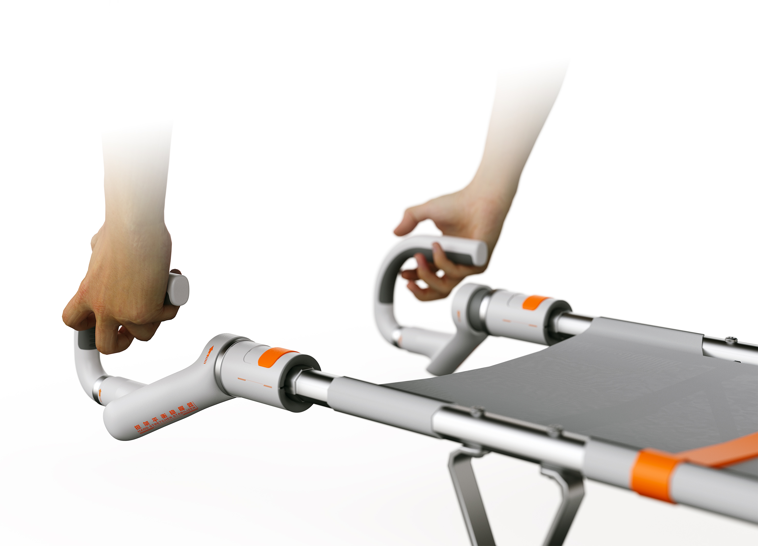 我设计了这样一款手持平衡稳握器。它可以卡在现有的担架扶手上,通过平衡稳定系统抵消和降低来自外界的颠簸和震动,从而使得担架上的患者在被移动的时候更好的保持平稳,降低对伤患在转运过程中造成的伤害。