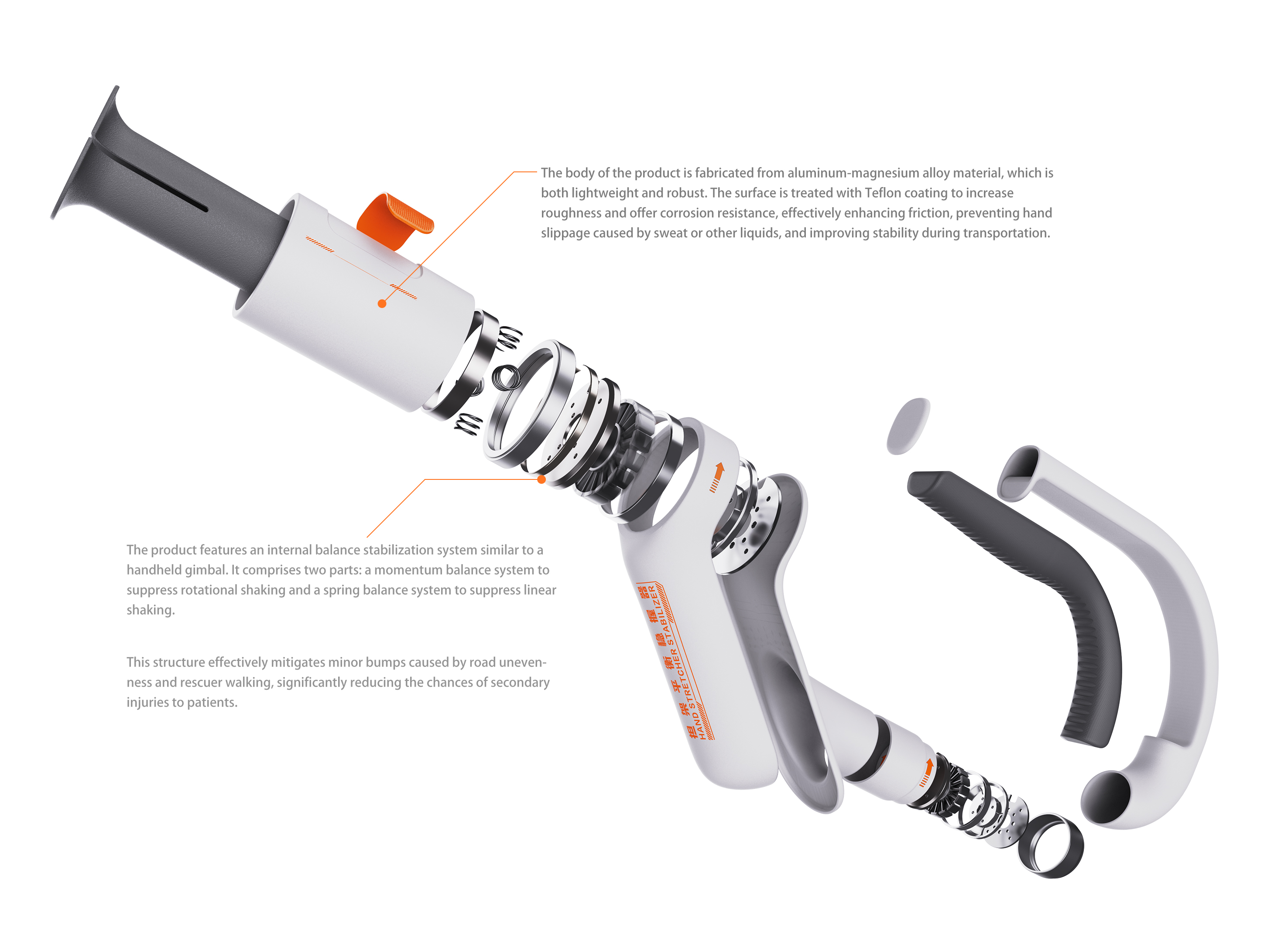 The product features an internal balance stabilization system similar to a handheld gimbal. It comprises two parts: a momentum balance system to suppress rotational shaking and a spring balance system to suppress linear shaking. This structure effectively mitigates minor bumps caused by road unevenness and rescuer walking, significantly reducing the chances of secondary injuries to patients.