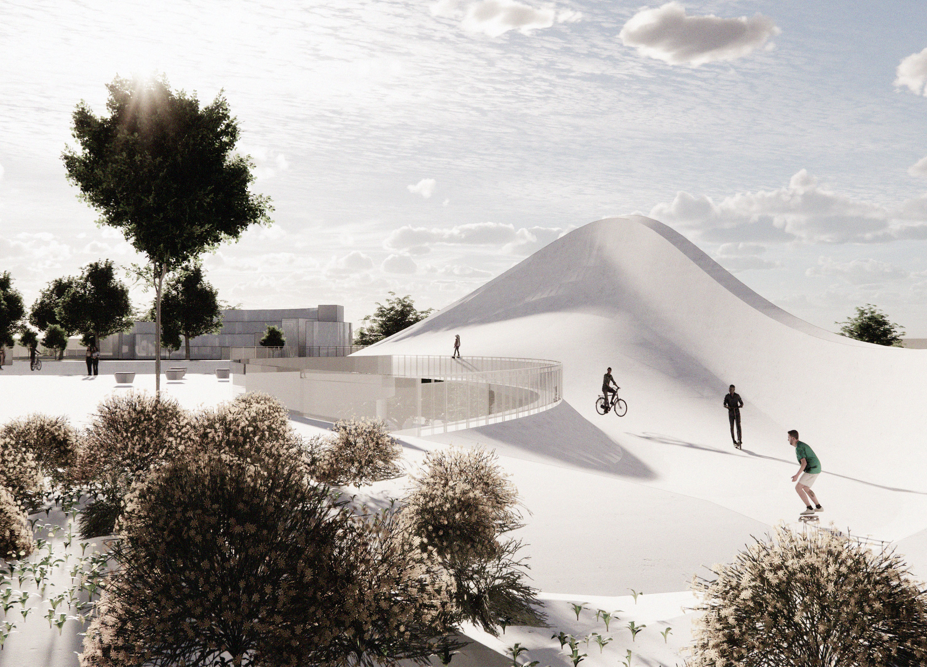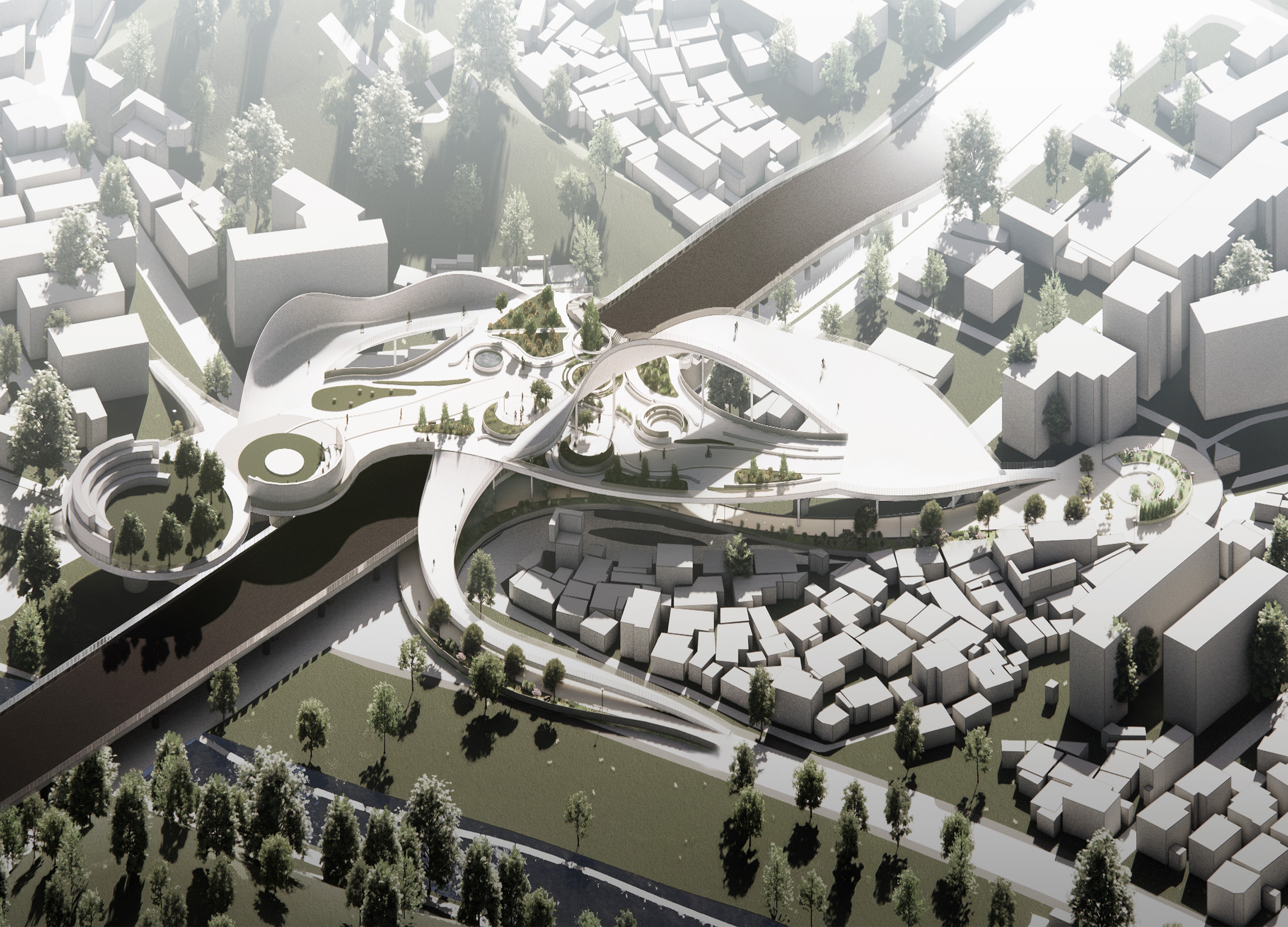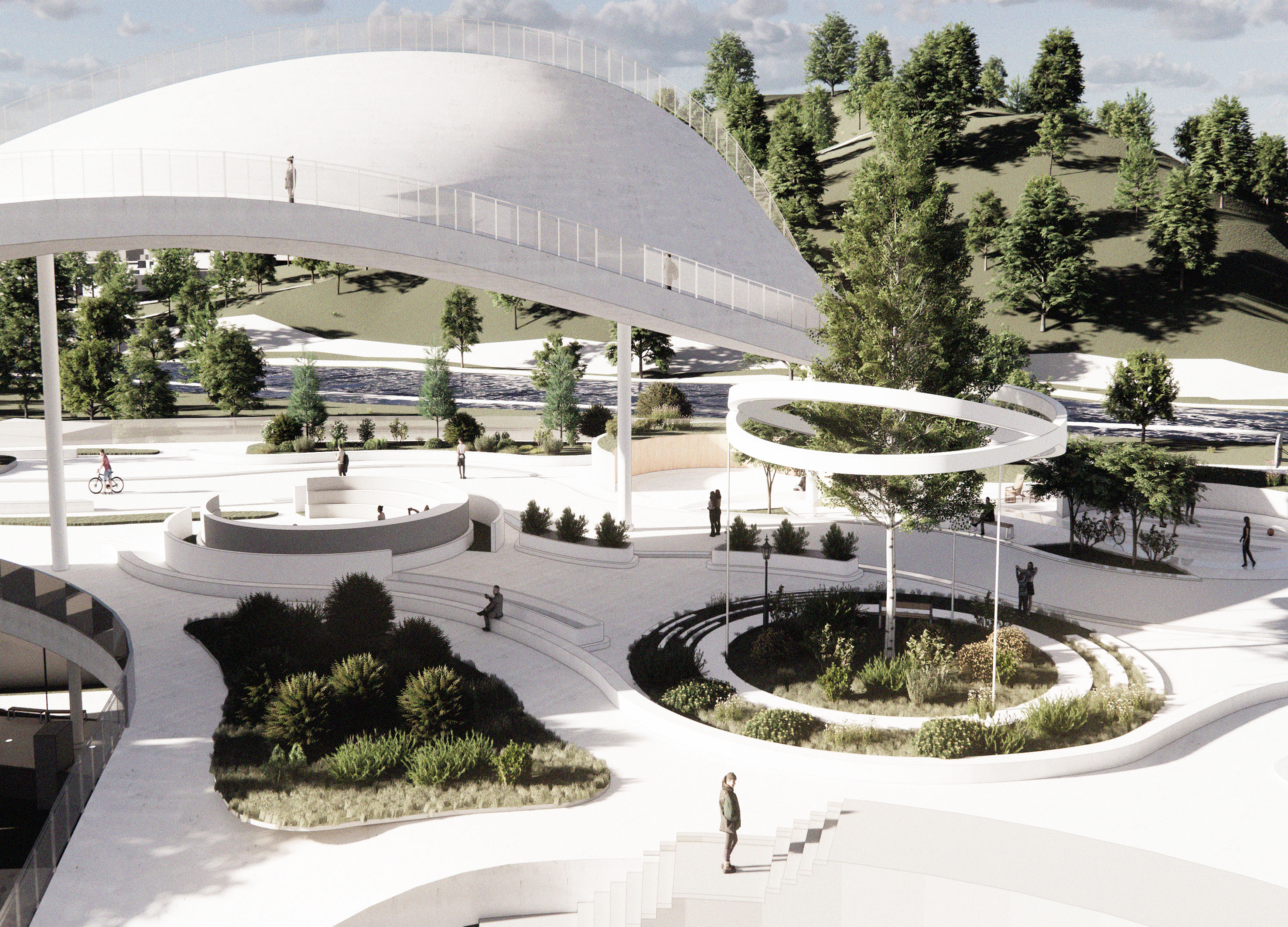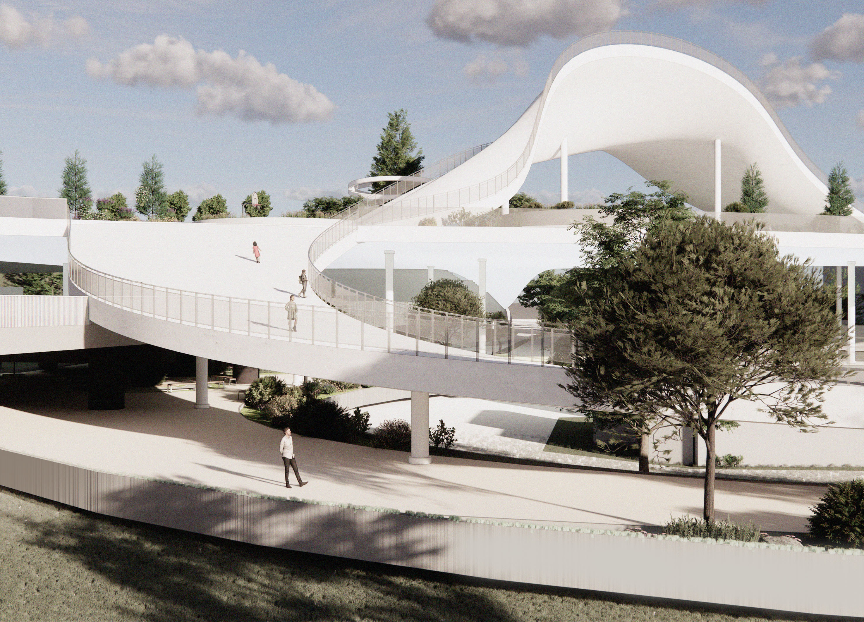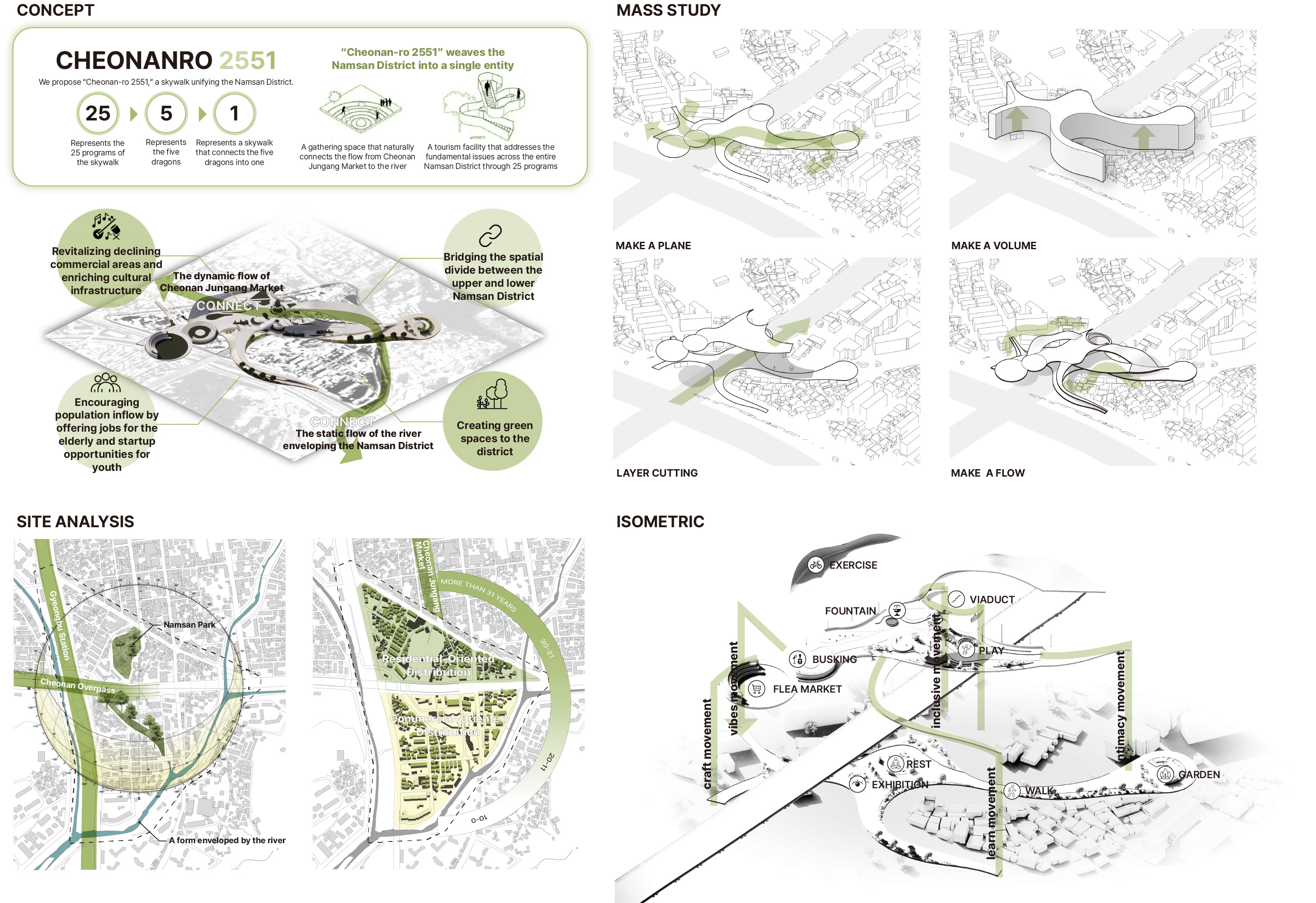 The flowing skywalk, “CHEONANRO 2551,” highlights Namsan’s identity and history. Using upper and lower highway spaces, it reconnects market streets and green areas. Twenty-five programs form five zones, merging into a single skywalk.