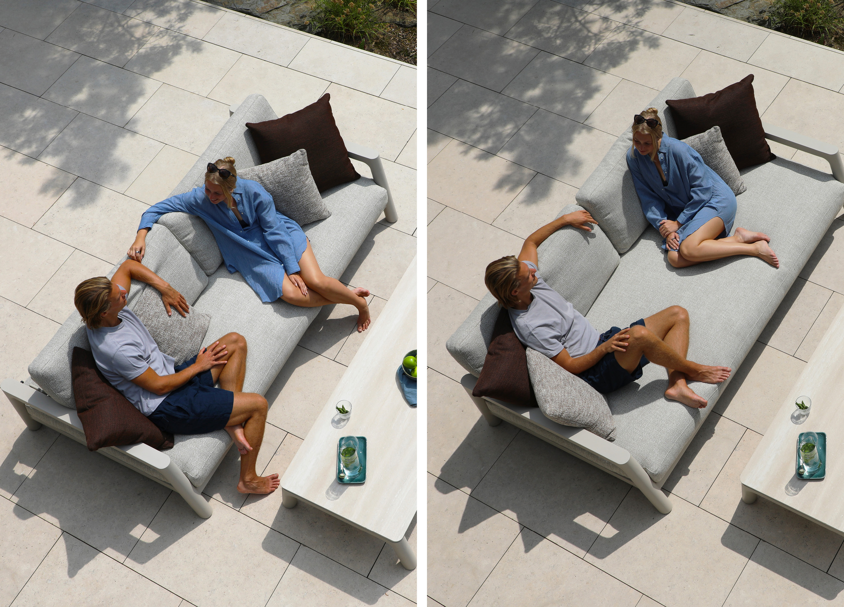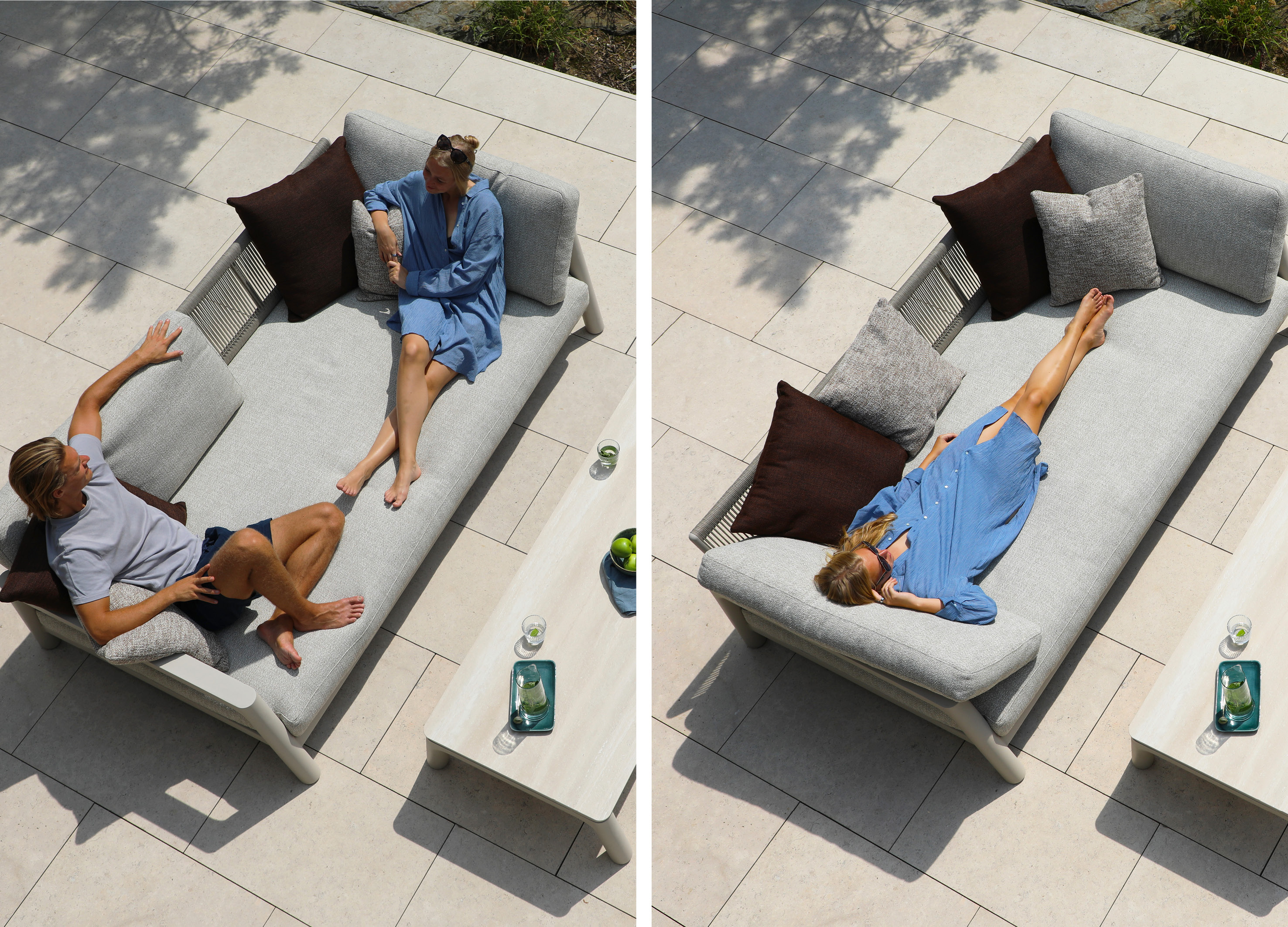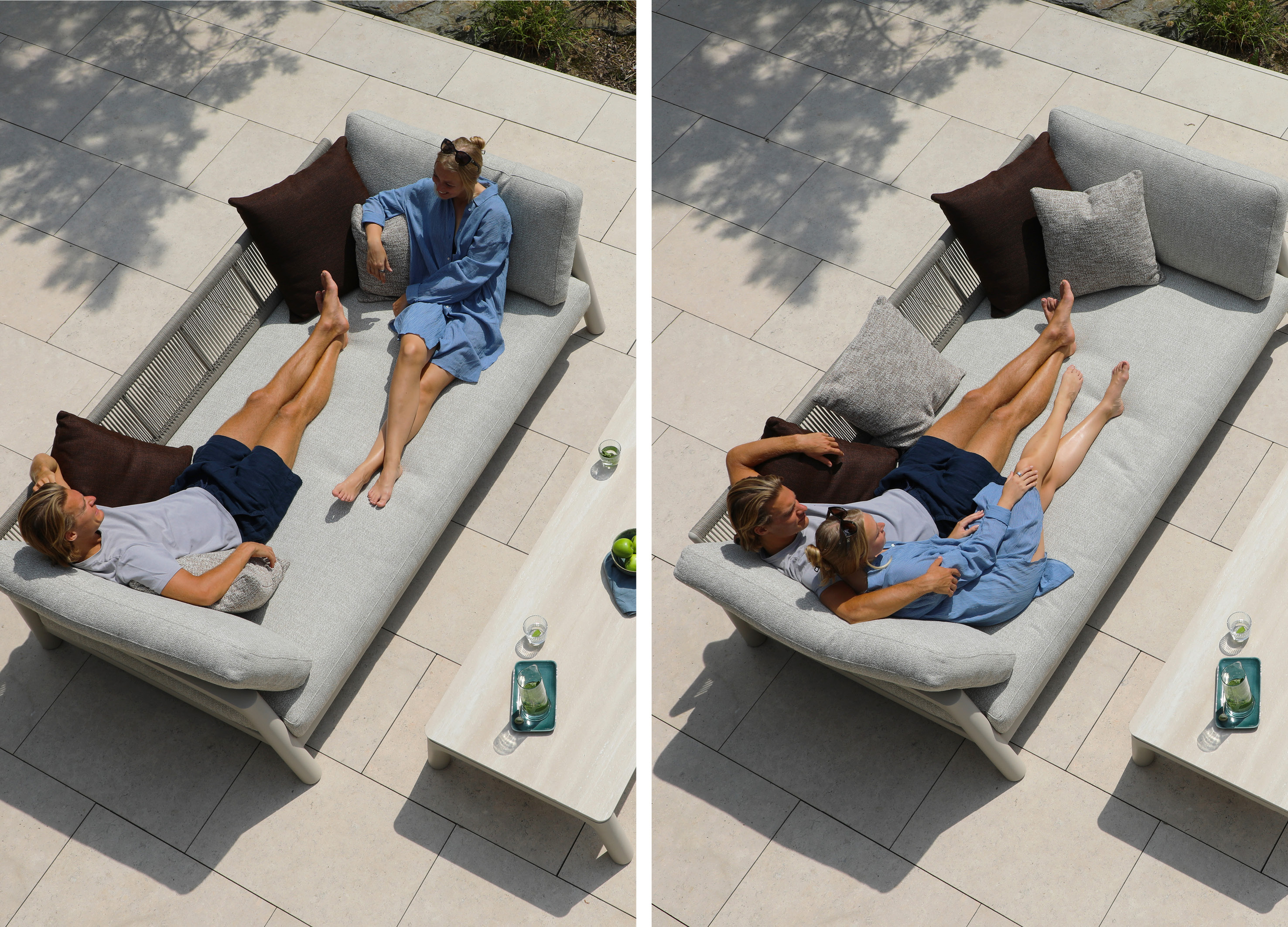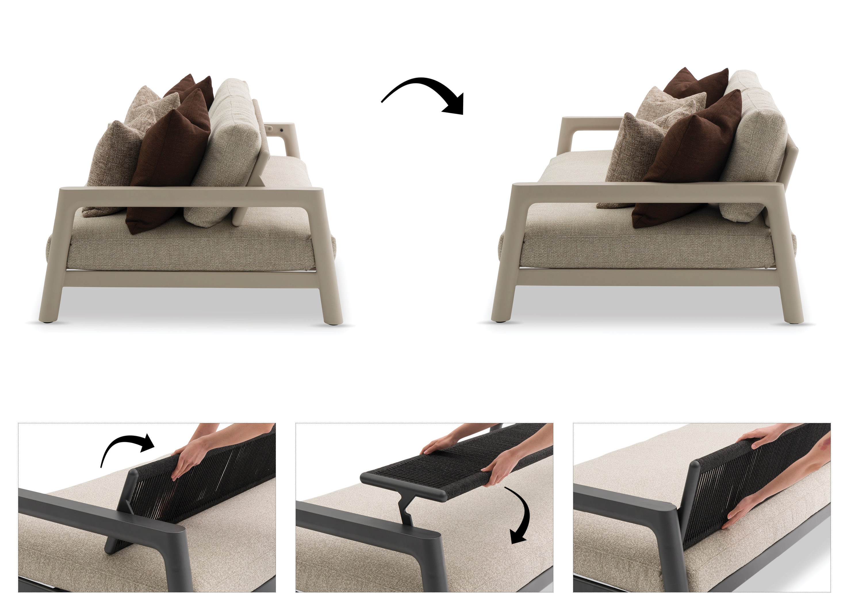 The Tolo sofa offers three distinct modes to enhance your outdoor experience: Sofa Mode: Enjoy an upright, structured seat ideal for dining, entertaining, or creating a more formal atmosphere. This mode is perfect for socializing with friends. Lounge Mode: Elevate your comfort by flipping over the backrest to the back. The cushions shift accordingly, providing a deeper, more relaxed seat—perfect for reading, engaging in casual conversation, or sipping coffee by the pool. • Daybed Mode: Rearrange the cushions to stretch out and unwind. This mode is ideal for sunbathing, napping, or enjoying a leisurely afternoon with the kids.