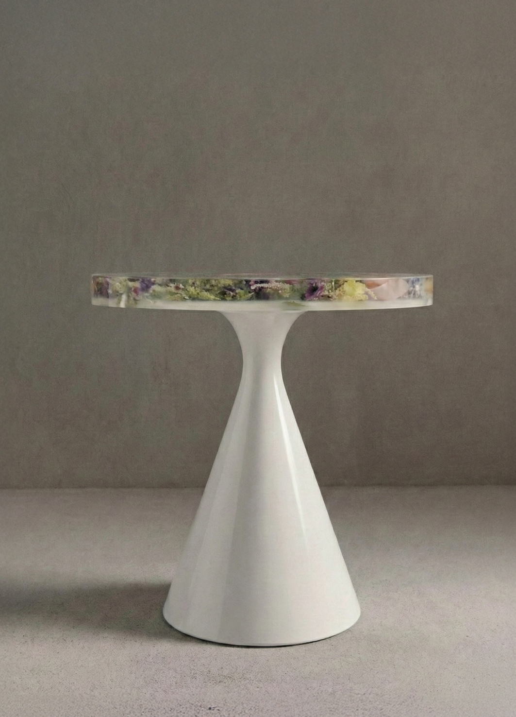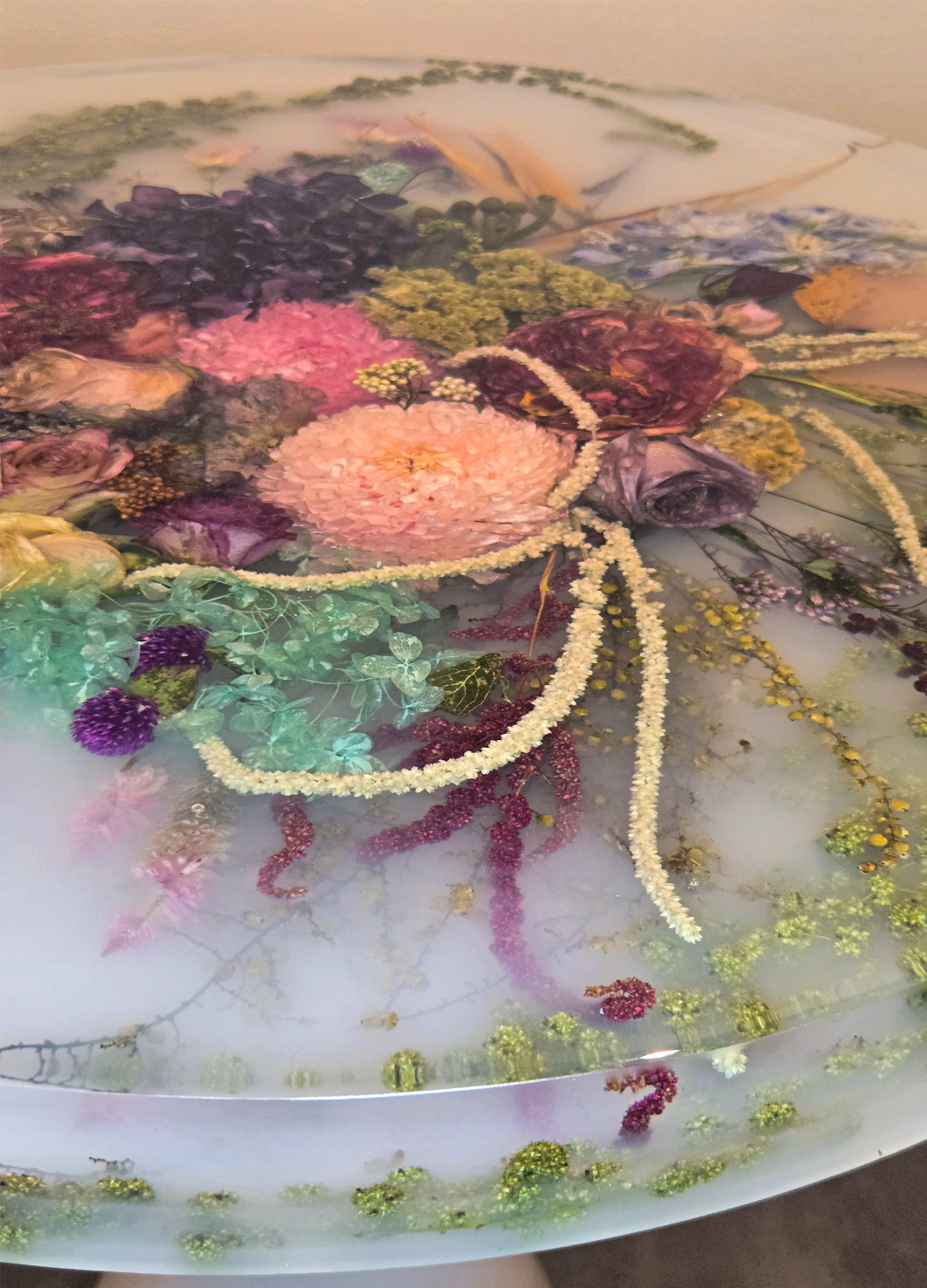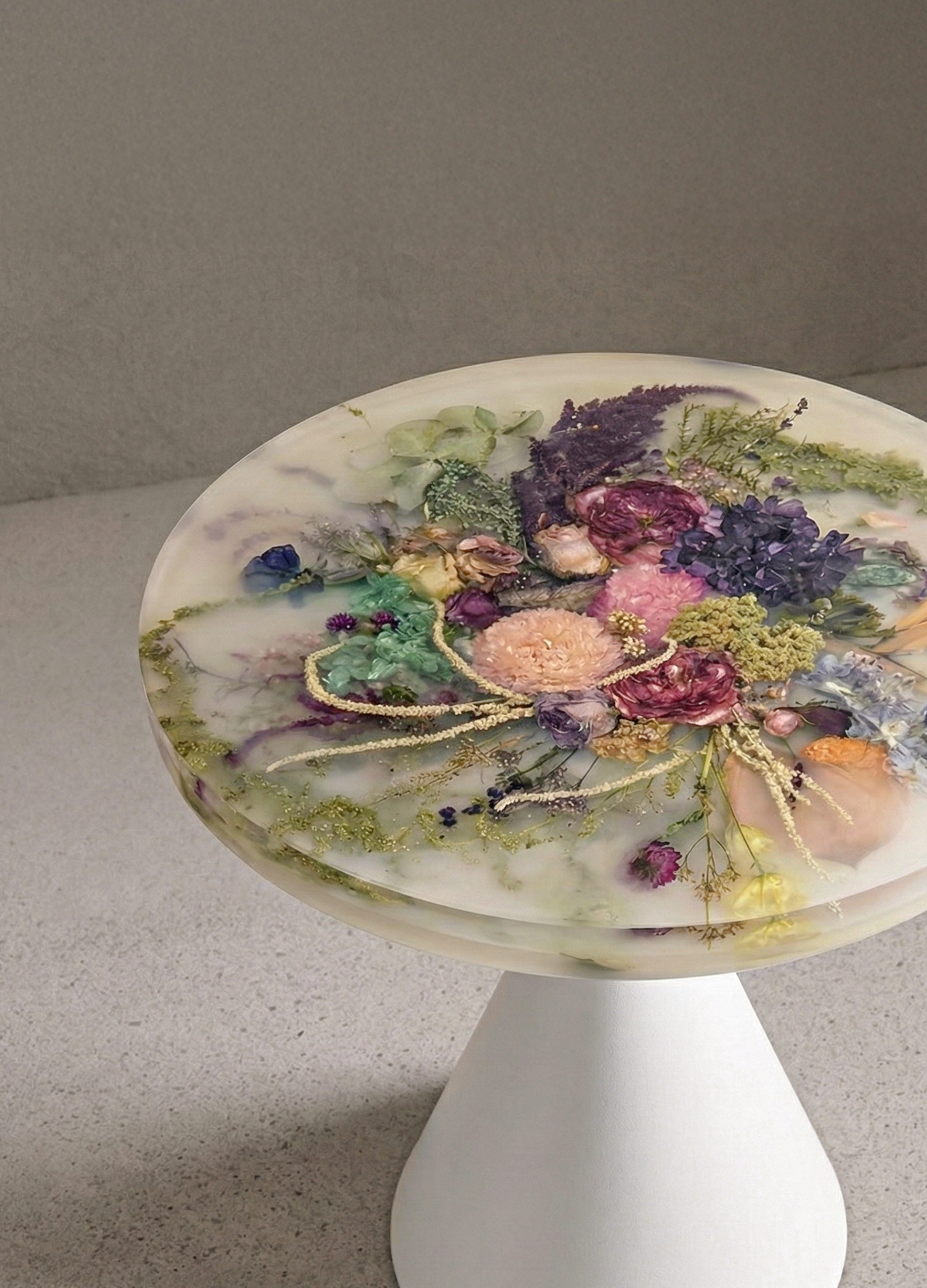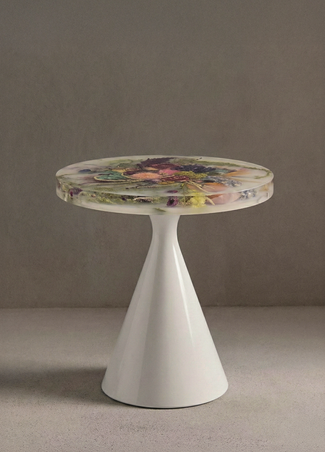 Birth and Rebirth reframes life’s beginning and end as one continuous cycle. Dried flowers sealed in clear resin give fading botanicals new form and purpose, echoing an Eastern view that endings become beginnings. A dense floral core concentrates birth’s energy: pink chrysanthemums, purple hydrangeas, and deep red roses converging at life’s peak. Toward the edges, petals disperse and colors soften—not decay, but diffusion and transition, as life permeates into other forms. The circular table erases any clear start or finish, becoming a quiet vessel for time and memory in everyday spaces.