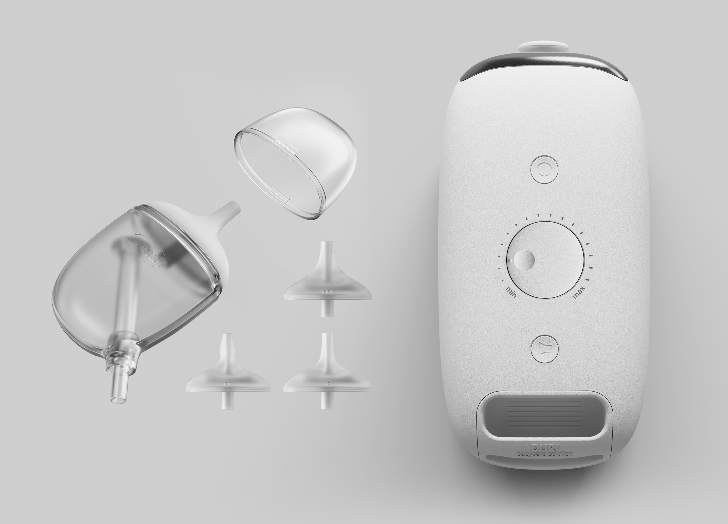 1.콧물흡인기 최초로 진공상태가 아니어도 콧물이 잘 흡입되도록 강한 팬흡입방식 모터 [최대흡입력 75mmHg]을 적용하고, 동시에 노즐과 본체를 연결하는 호스의 밀폐 구조를 강화하여 기존 제품이 가지고 있는 약한 흡입력을 해결함. 이 기술은 코 점막에 자극 없이 깊은 콧물까지 흡입 가능하도록 한 두리에서 개발한 에어석션기술임