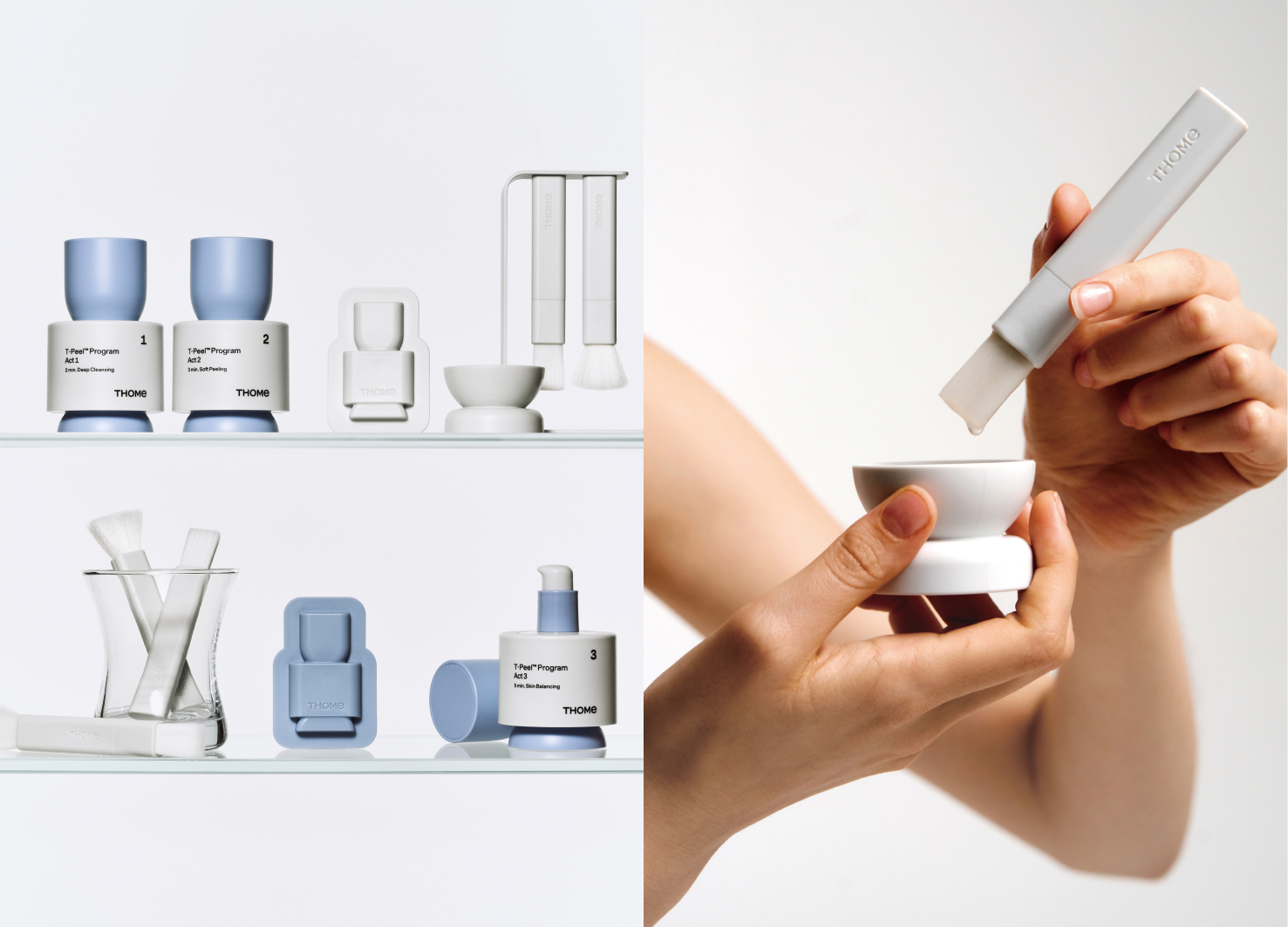 THOME is a home-esthetic brand that brings professional esthetic care into the home, helping users build routines and focus on daily care. The T-Peel Program reflects this philosophy by offering balancing care and expressing “fundamentally sound products” through simple curved, cylinder-like forms that work as both tool and object. Its UX mirrors four esthetic steps, and the typographic system clarifies the flow so users understand how to use it naturally. A unique silhouette and graphic ingredient patterns extend the brand’s aesthetic, allowing the product to be perceived as an object even when not in use.