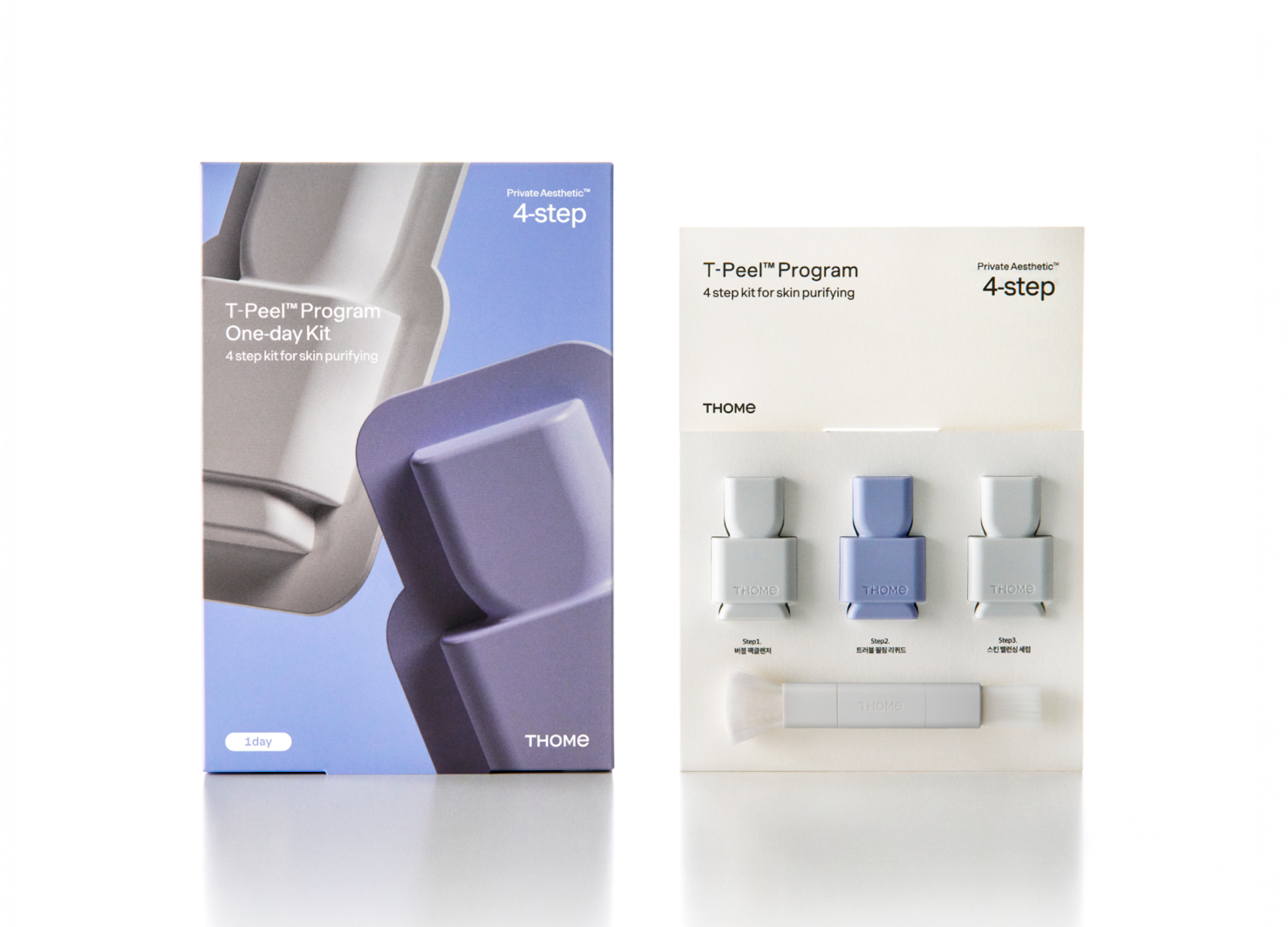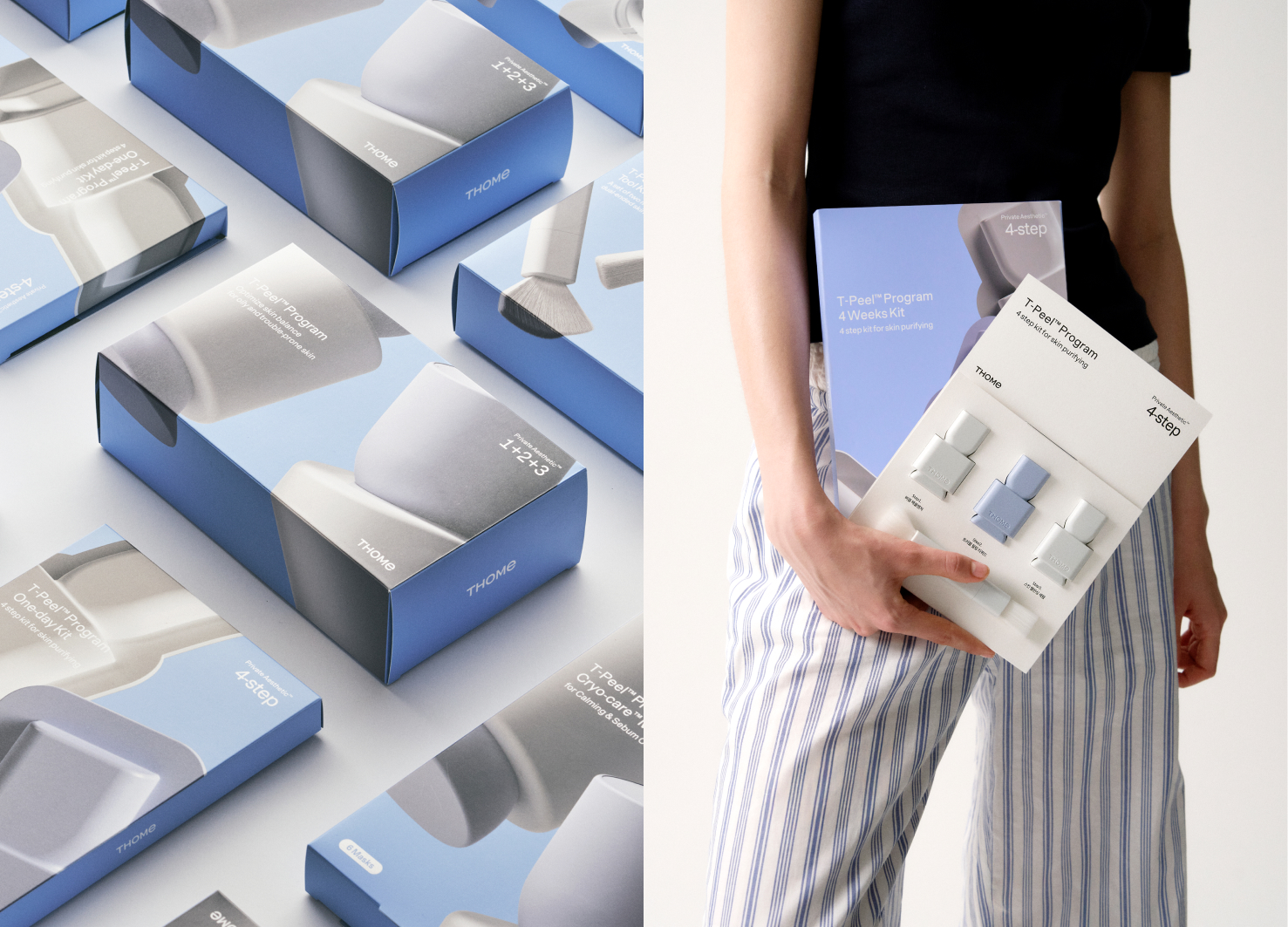 THOME은 집에서도 전문 에스테틱 과정을 경험할 수 있도록 설계된 브랜드로, 스스로 루틴을 만들고 매일의 케어에 집중하도록 돕습니다. T-Peel Program은 이러한 철학을 기반으로 균형을 회복하는 케어 경험을 제공하며, 곡선과 원기둥 같은 기본 형태를 활용해 ‘기본에 충실한 제품’이라는 메시지를 패키지에 담아 기능을 넘어 오브제로 존재하는 디자인을 완성했습니다. 에스테틱 4단계를 직관적으로 구현한 UX와 단계 흐름을 시각화한 타이포그래피 시스템을 통해 사용자는 별도의 설명 없이 형태와 텍스트만으로 자연스럽게 사용 방식을 이해합니다. 디자인은 에스테틱 원리와 밸런스의 미학에서 출발했으며, 고유한 실루엣을 직접 설계해 제품이 공간 속에서도 오브제로 인식되도록 했습니다. 사용하지 않을 때에도 아름답게 존재하는 ‘생활 속 오브제’의 성격을 강화했으며, 패키지 내부에는 전성분을 그래픽 패턴으로 재해석한 디자인을 적용해 정보를 넘어선 시각적 경험을 제공하고, 제품을 여는 순간까지 브랜드의 미학을 일관되게 전합니다.
