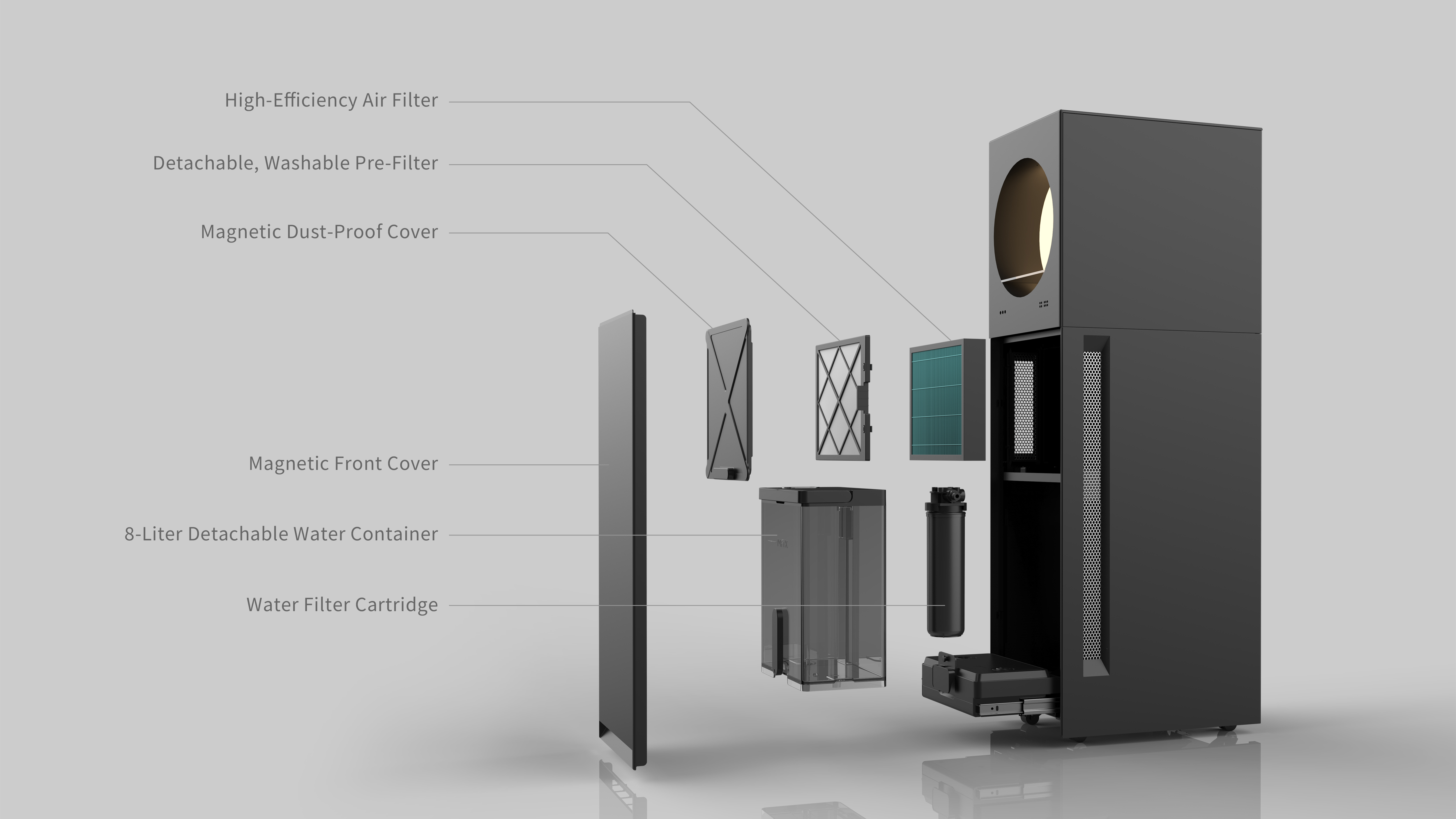 ARKVO is designed for high-density Asian cities where humid climates, limited living space, and aging infrastructure affect daily life. It combines air purification, dehumidification, and air-to-water drinking functions into one compact system, reducing the need for multiple appliances while improving indoor air quality and humidity balance. Drinking water is generated directly from ambient air without external piping, making the system suitable for rental homes and older buildings. A detachable water tank simplifies cleaning, and a variable-speed compressor ensures quiet and energy-efficient operation for everyday residential use.