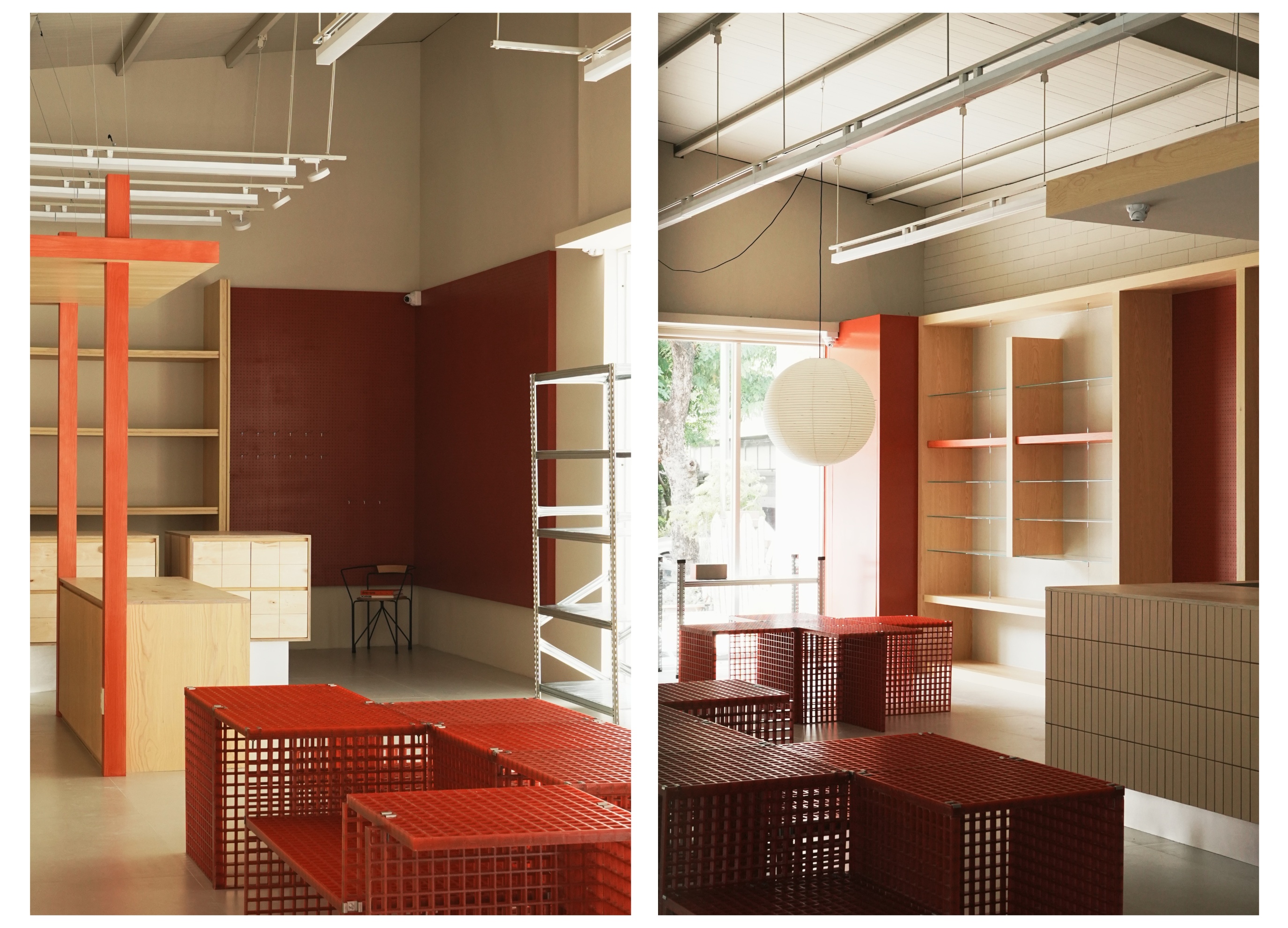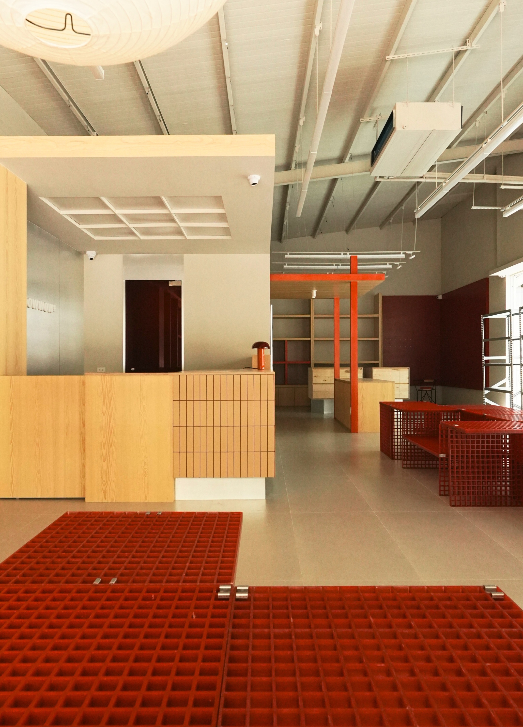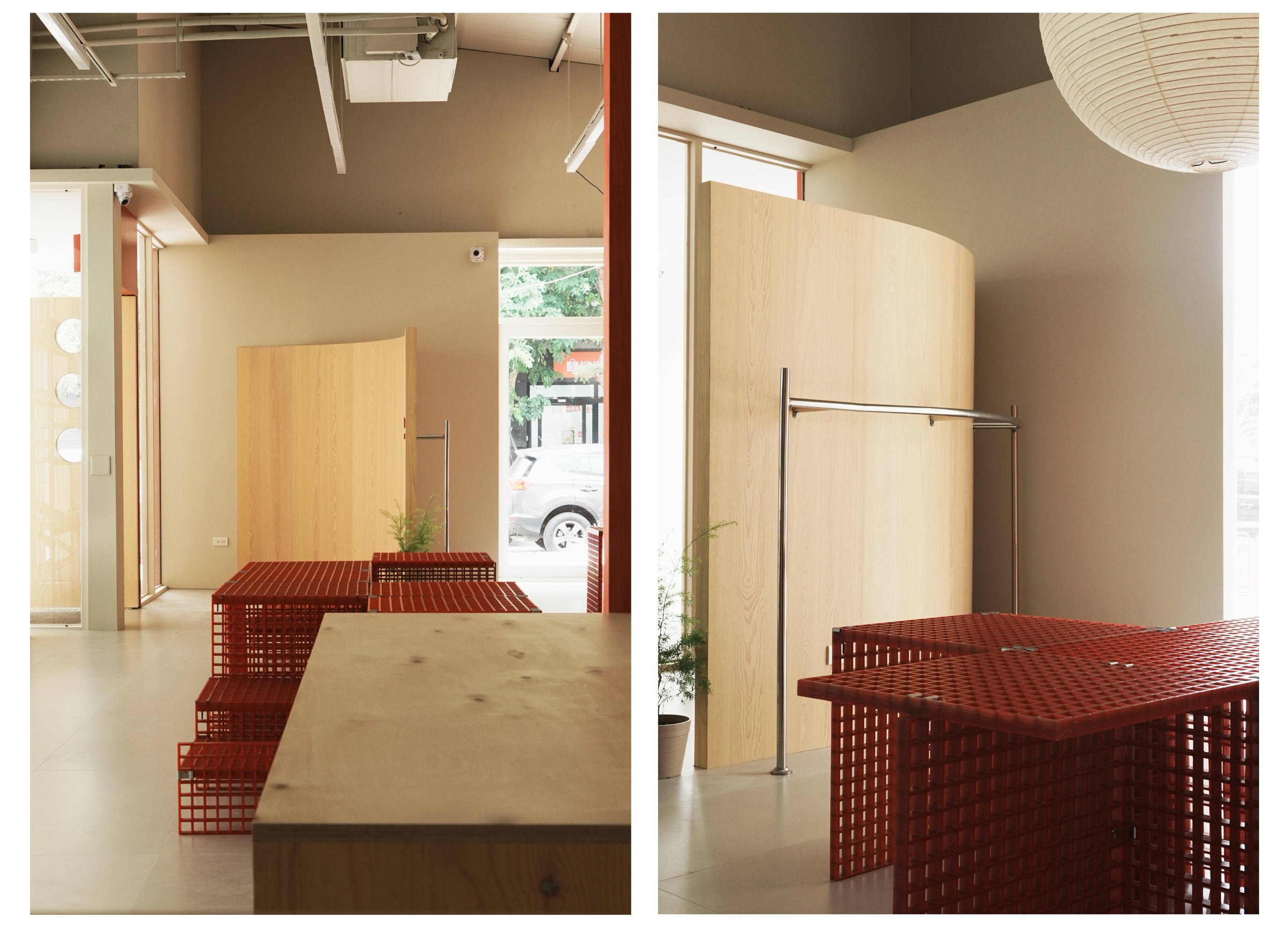 為保有寵物推車並行時的動線,以及考量狗狗在室內空間中社交的安全尺度,動線規劃採十字循環策略,並將走道尺度擴大至 150 公分,體現人寵共情與空間防護意識。陳列系統選用 FRP 格柵板,透過規律的幾何孔隙消融量體的沉重感,在視覺上創造出虛實交錯的對話層次;同時兼具耐腐蝕、抗衝擊且耐候性優異的務實機能,並透過模組化結構靈活適應各種陳列需求。空間選用溫潤木質作為基底提供親近感,嵌入其中的鮮明紅色構件則成為視覺與情感的強調,堆疊出品牌形象的記憶點,呼應其溫暖踏實的日常精神。