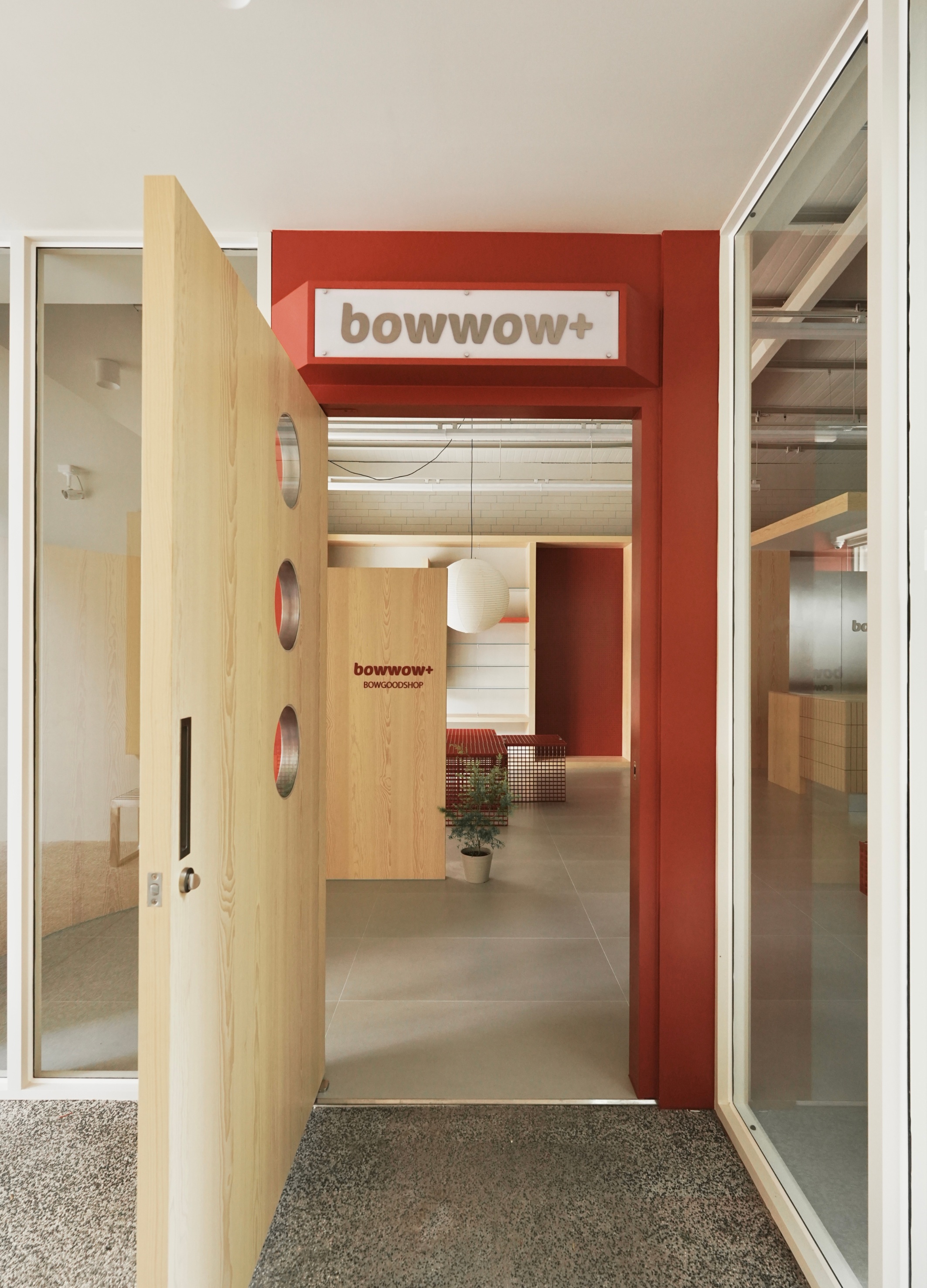 BOWWOW+ evolves the 2D '+' branding into a 3D system of red grids and structural motifs. This matrix organizes 150cm-wide corridors, ensuring pet social distancing and barrier-free access. Within this frame, a wooden House-within-a-House is suspended by concealed cables, creating a weightless sanctuary that balances industrial scale. With low-profile adaptive FRP islands, the design ensures visual permeability and environmental security. Integrating non-porous surfaces with seamless grouting, the space achieves high hygiene standards for an immersive experience. This structural sequence redefines pet retail through spatial empathy.