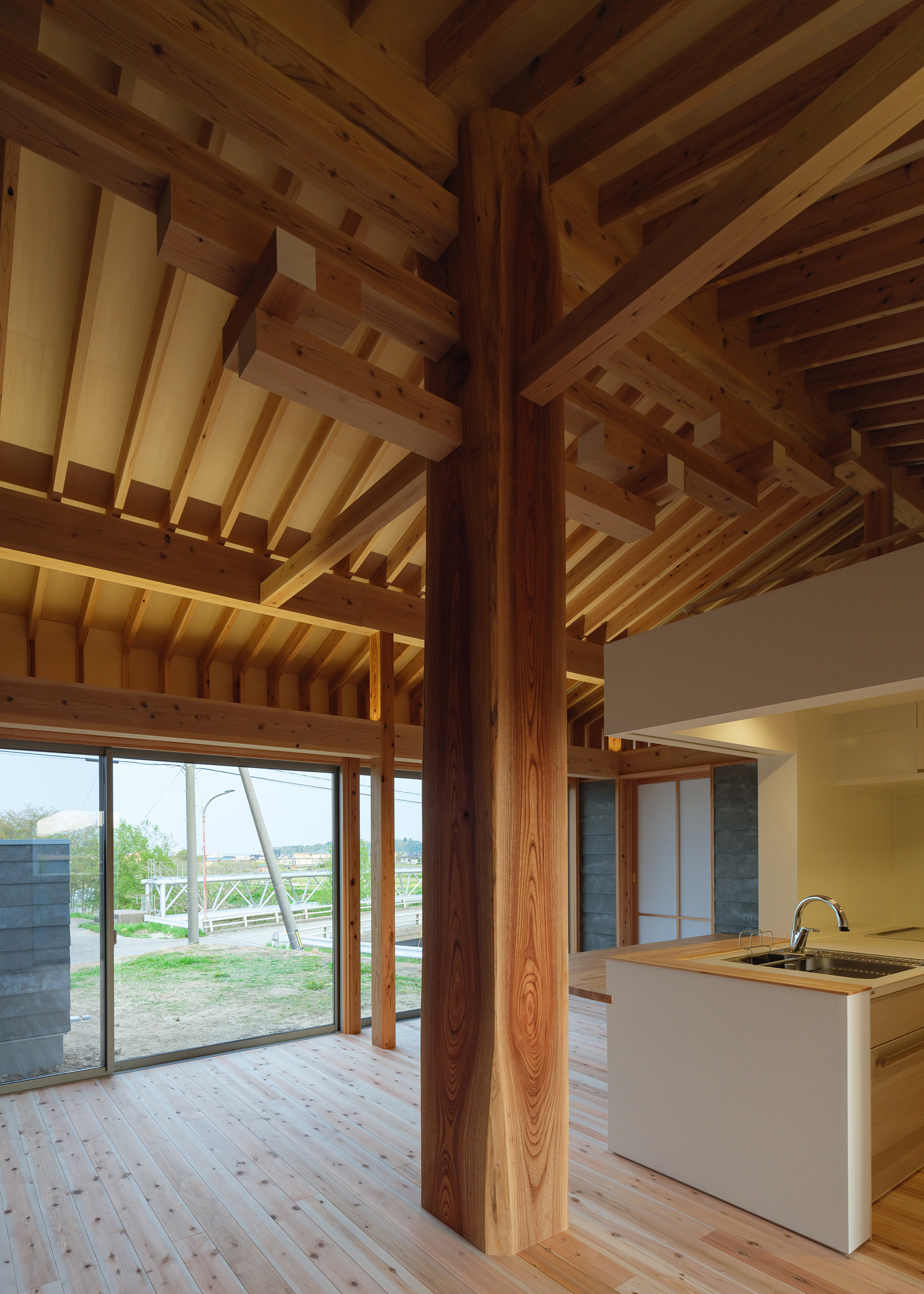 'Keyaki Monogatari' began with an encounter with a single large zelkova. In the past, this wood stood in the client's ancestral house's garden. We felt the presence of the client's ancestors. We set up the wood as a pillar supporting the roof ridge, so it could be handled like a grandparent who gently loves his grandchildren, or as a sacred object of prayer. The house also challenges capitalist society and peace. By designing for attachment, we offer our clients irreplaceable value. Also, by placing a metaphor of peace in this house, we design with the hope of peace.