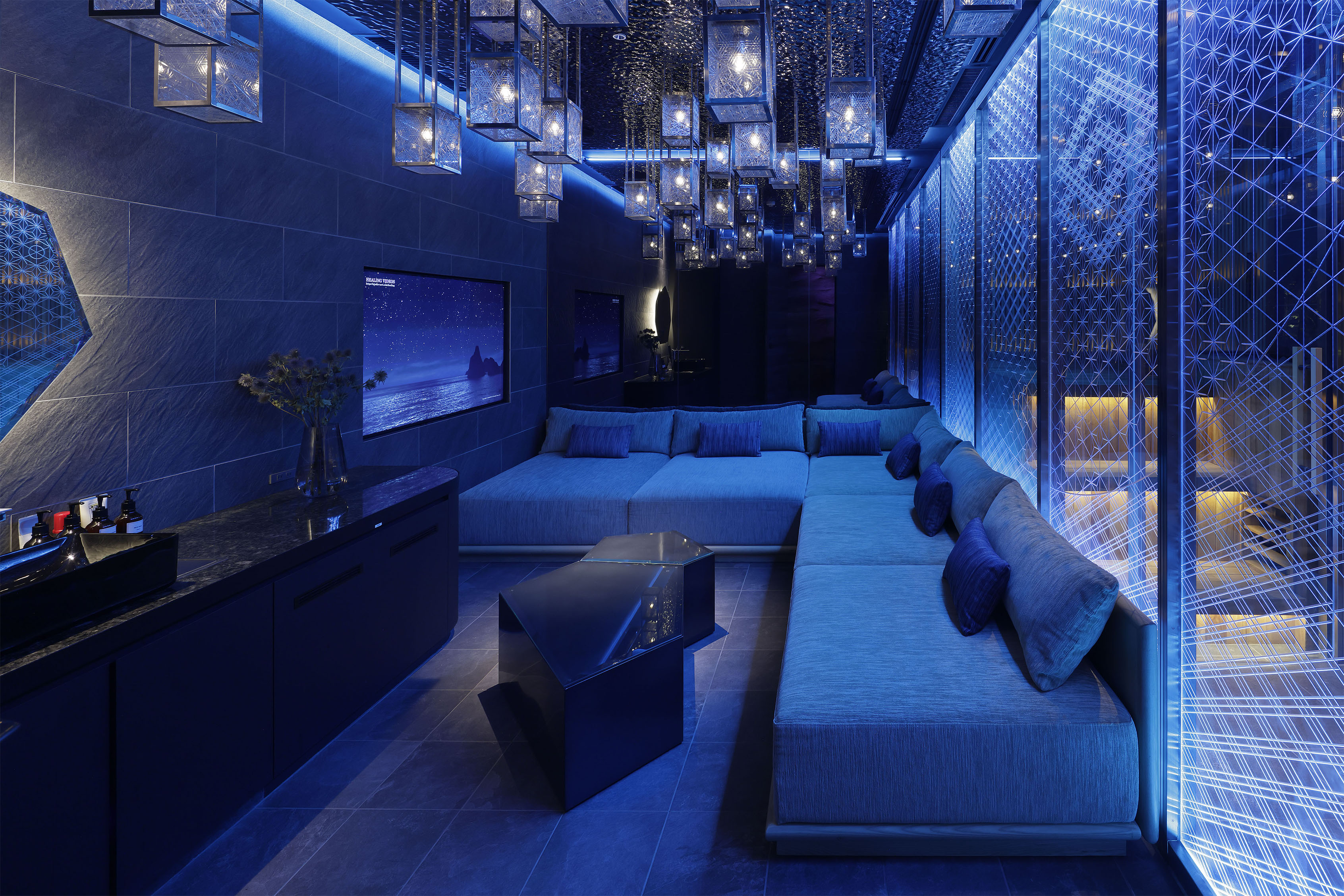 天井には水面パネルと切子ガラスのペンダントを施し、その乱反射で波の揺らめきを表しならがも静謐なる空間としました。