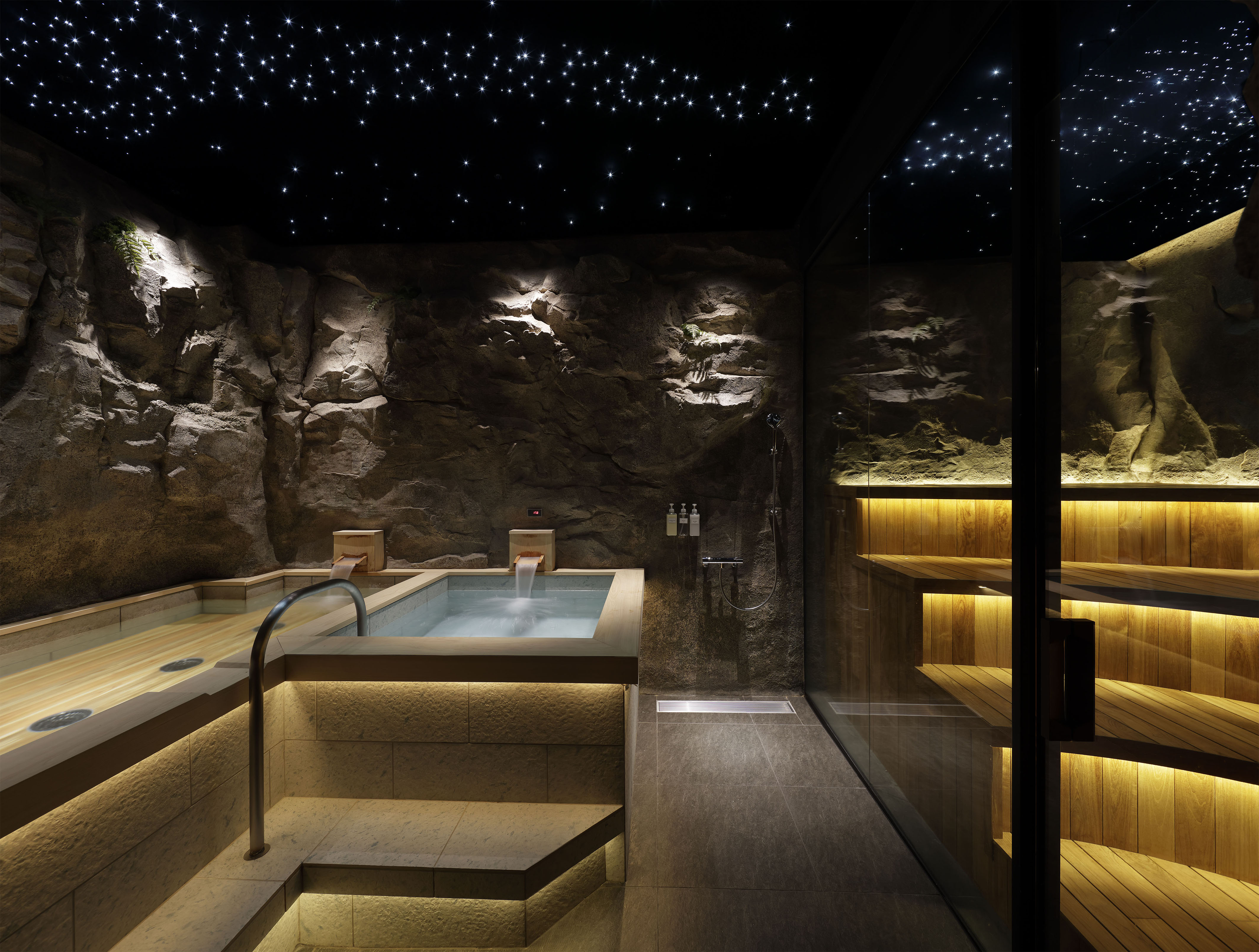 天井の岩間を見上げると満天の星空が広がり、大地に包まれるような心地よい空間としました。