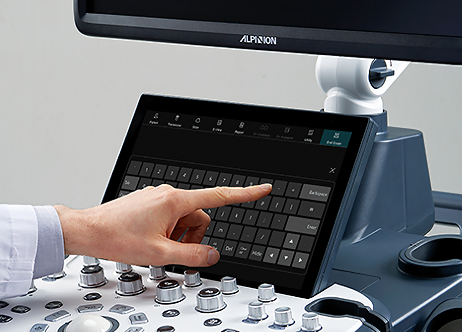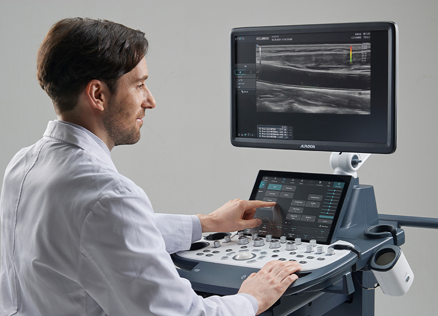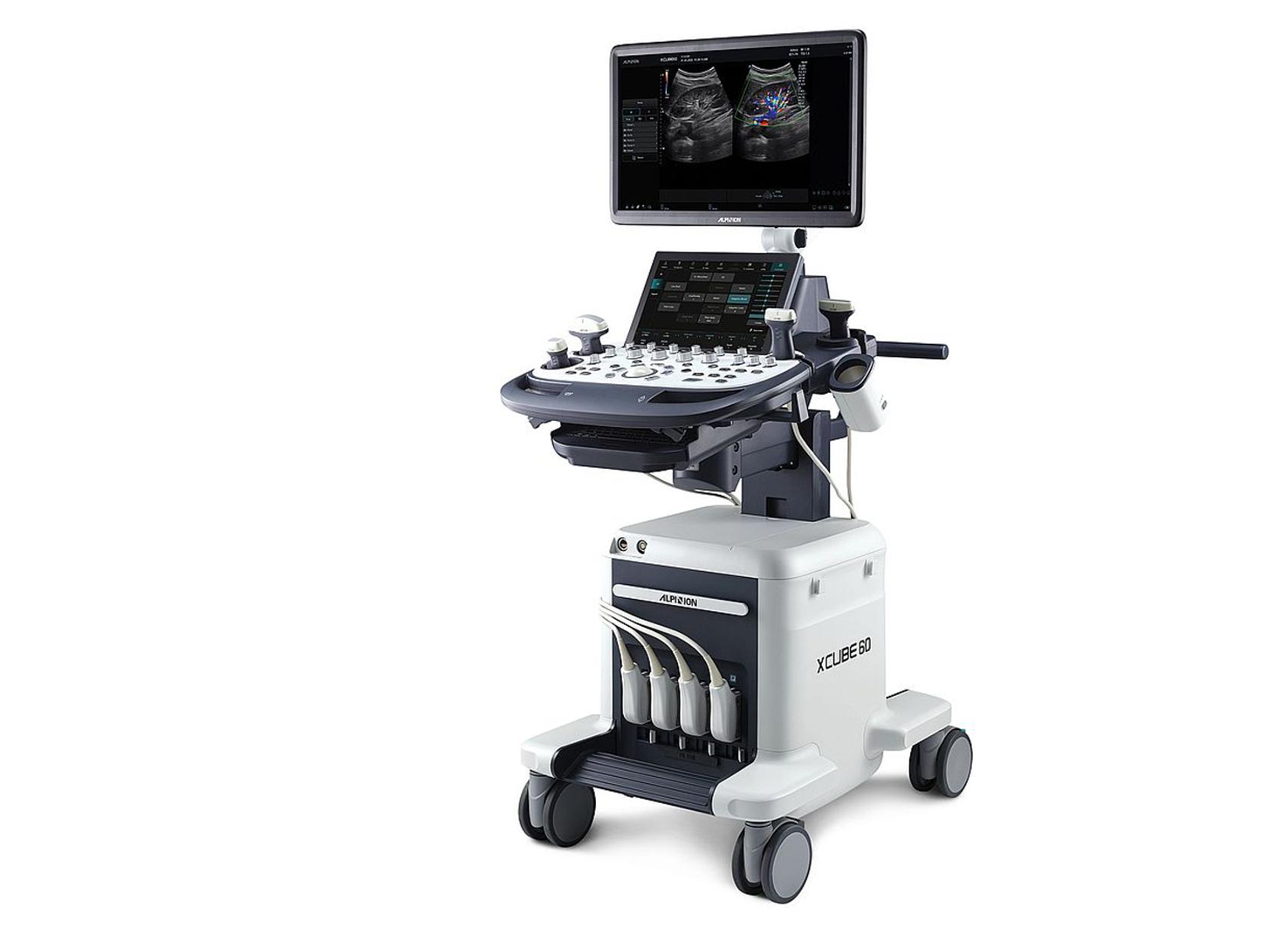ALPINION’s X-CUBE 50, 60 series embody ergonomic design to maximize user comfort and diagnostic performance. A 320° swivel arm, sliding keyboard and 21.5-inch touchscreen adjust to any scanning posture, ensuring smooth control. Soft curves and a compact frame fit tight clinical spaces yet roll easily. Blue-gray and ivory tones echo Alpinion’s identity, blending professionalism with warmth. Height-adjustable panel and tilting gel warmer cut fatigue, while smart key layout and auto-measurement tools simplify workflow, marrying function with style.